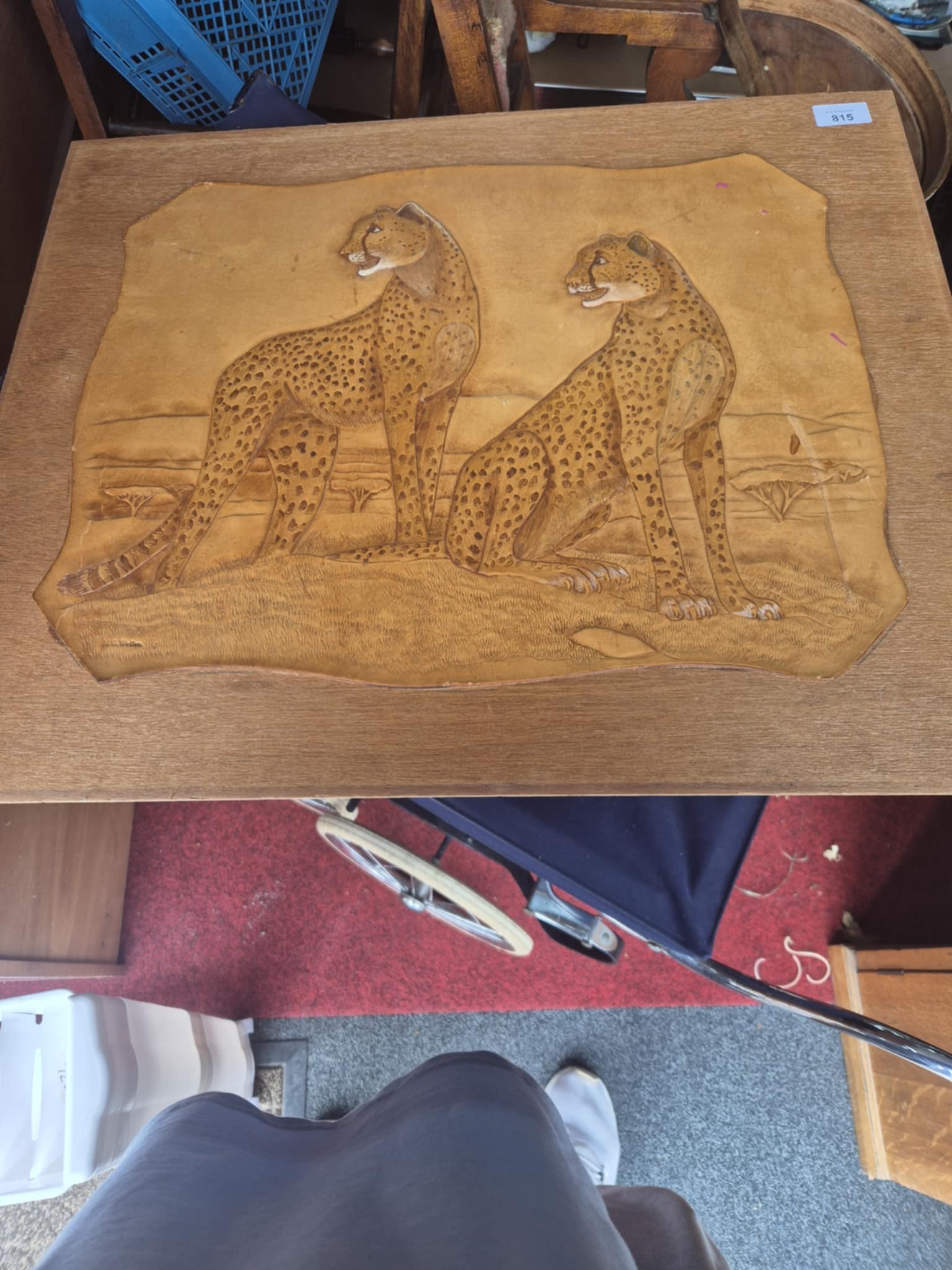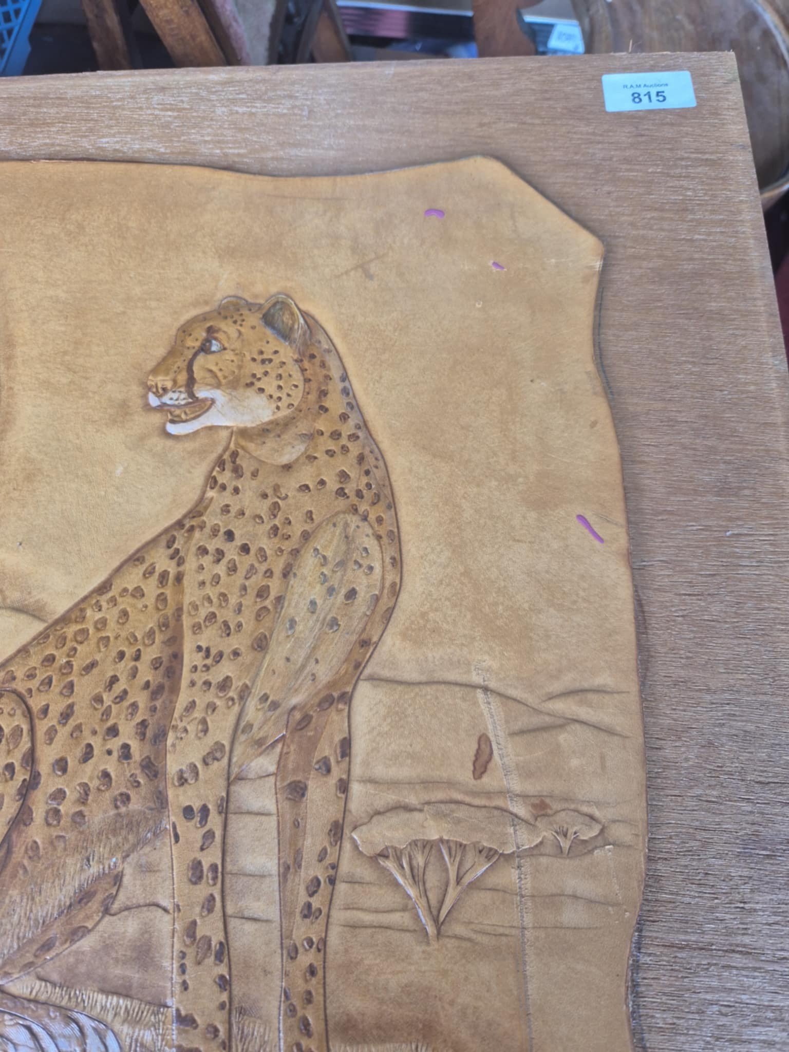 Rectangular tooled leather artwork depicting two cheetahs in a savanna setting on a wooden backing board.