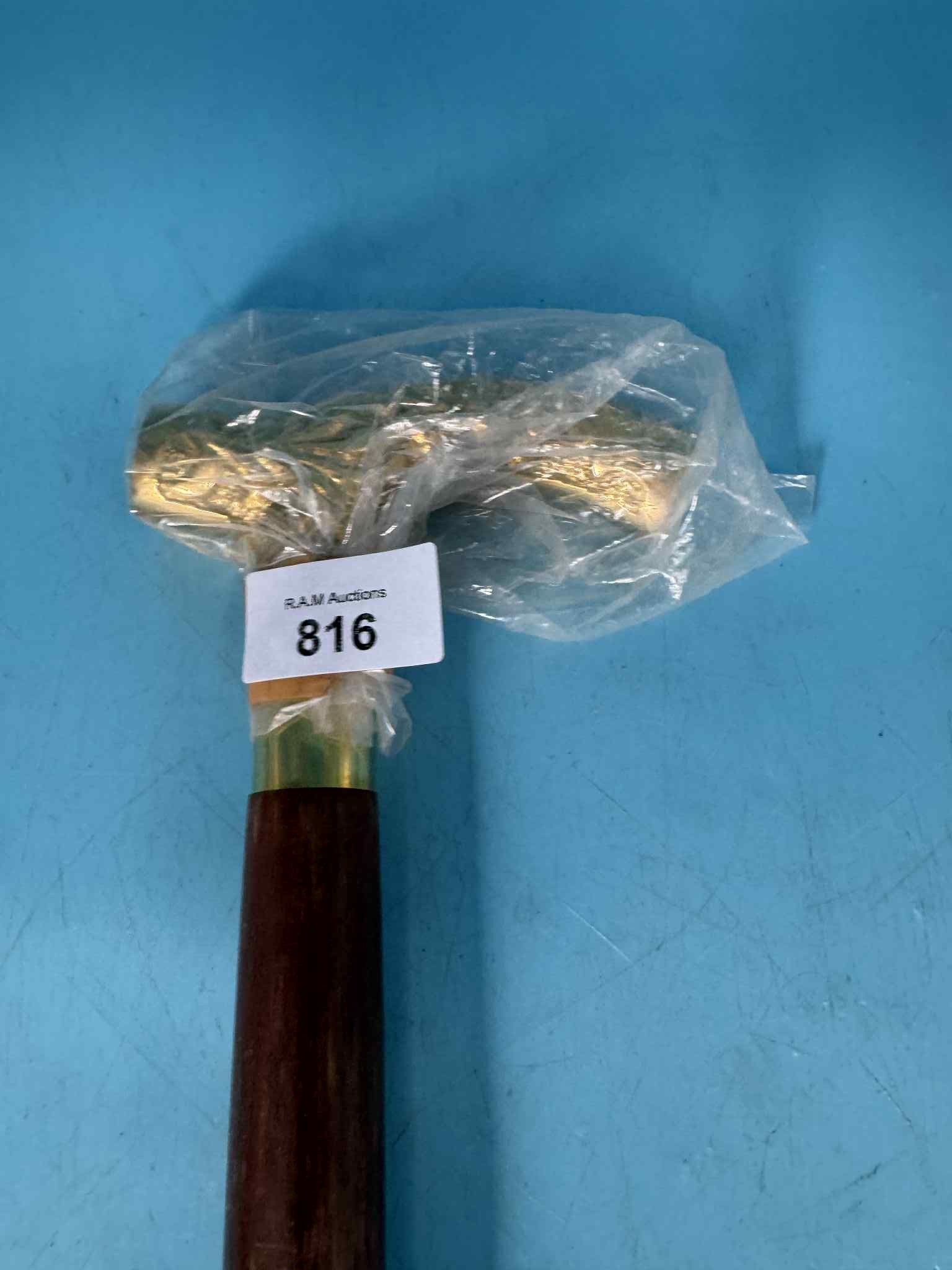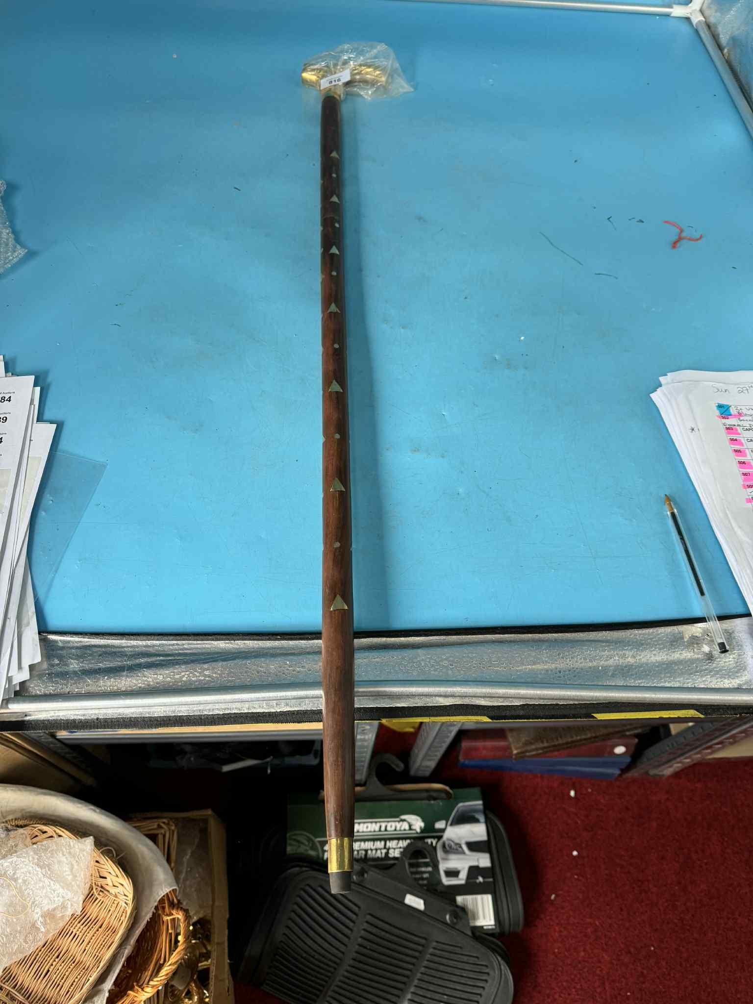 A dark brown wooden walking stick with a brass animal head handle and gold triangular inlays, approximately 36 inches long.