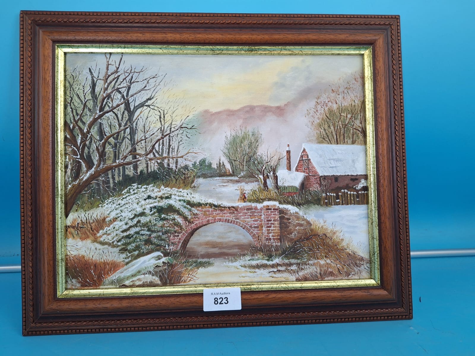 Framed oil painting of a snow-covered winter landscape with a brick bridge and building.