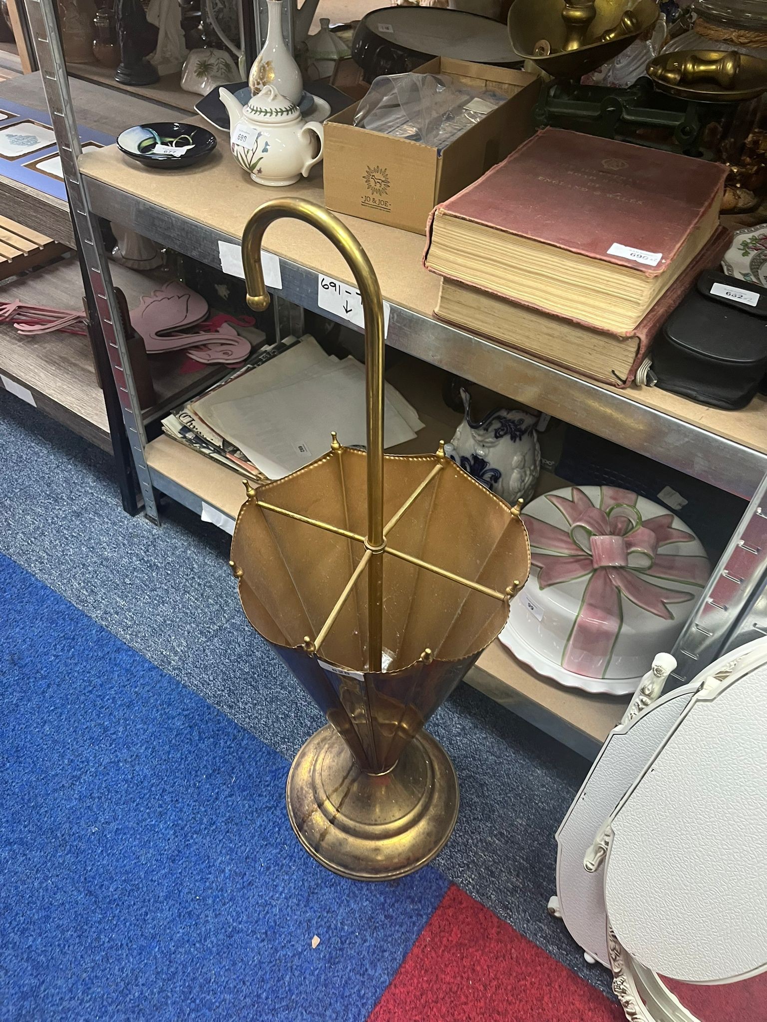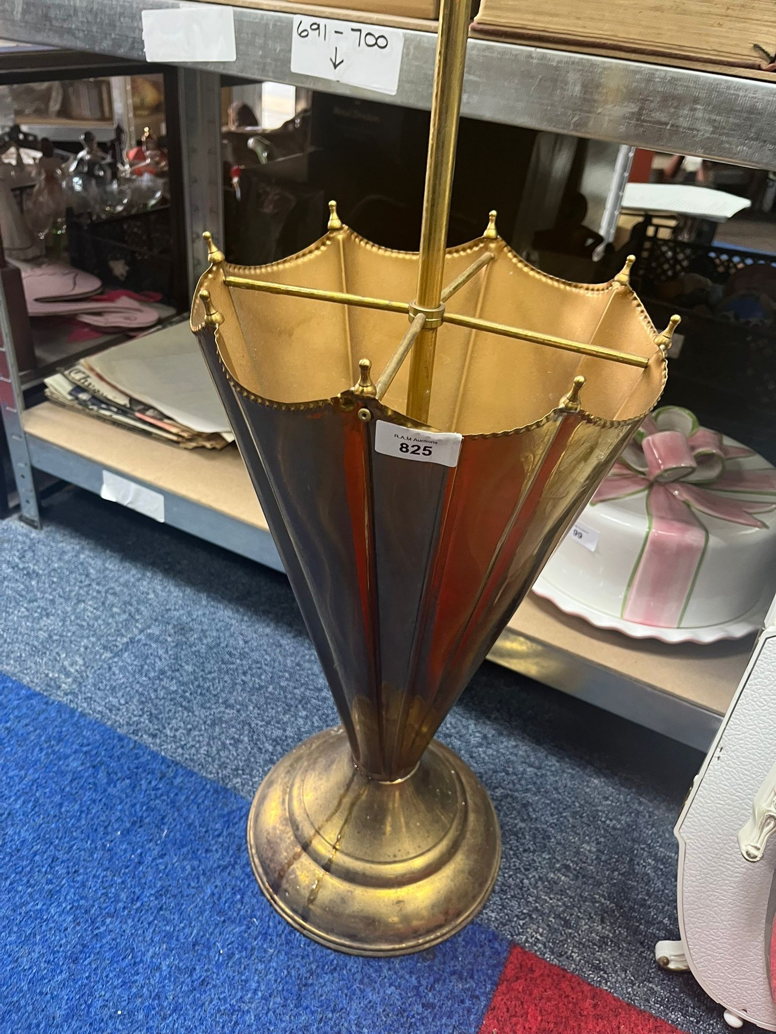 Brass umbrella stand with a flared base and an umbrella-shaped receptacle with a gold interior and vertically striated dark exterior.