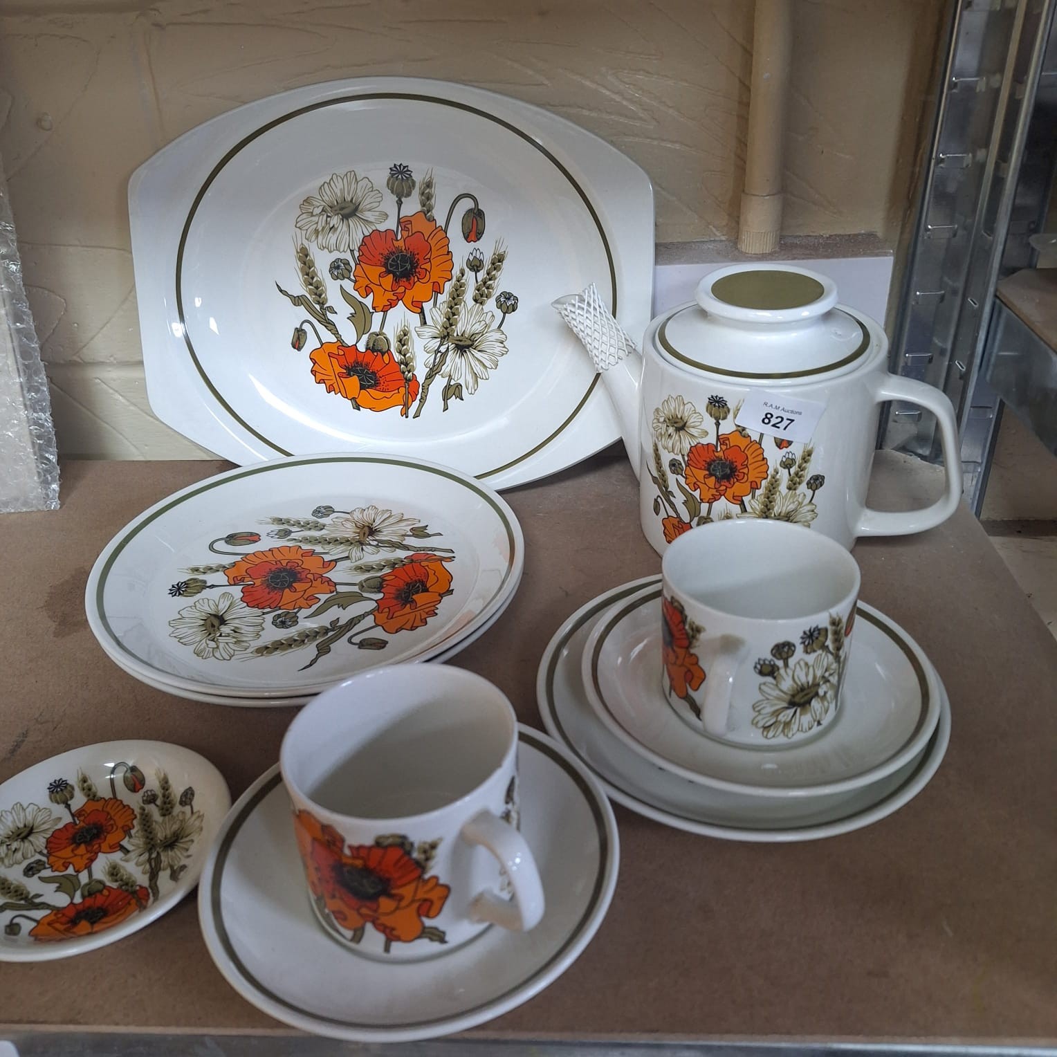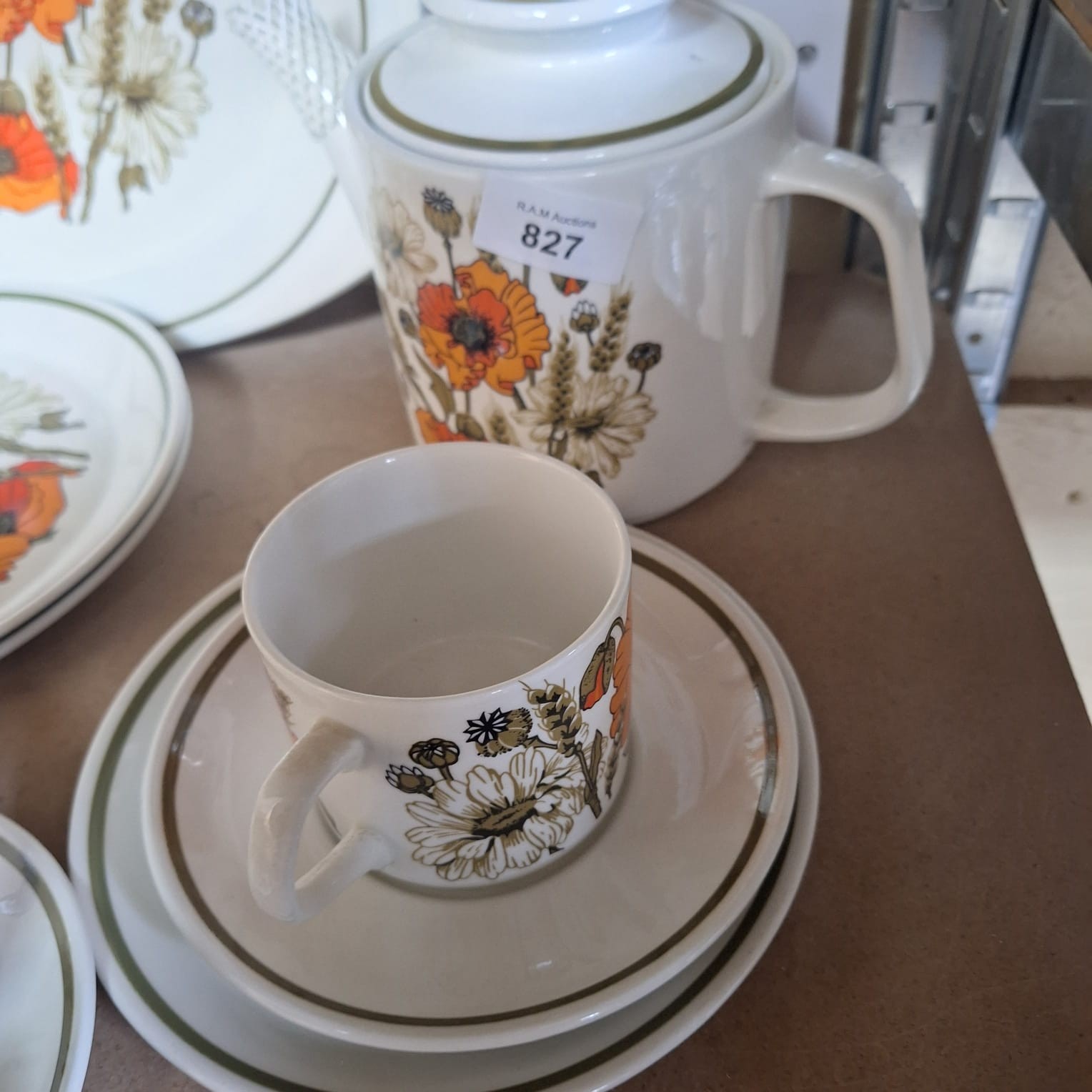 Ceramic tea set featuring orange poppies, white daisies, and wheat stalks with green bands.