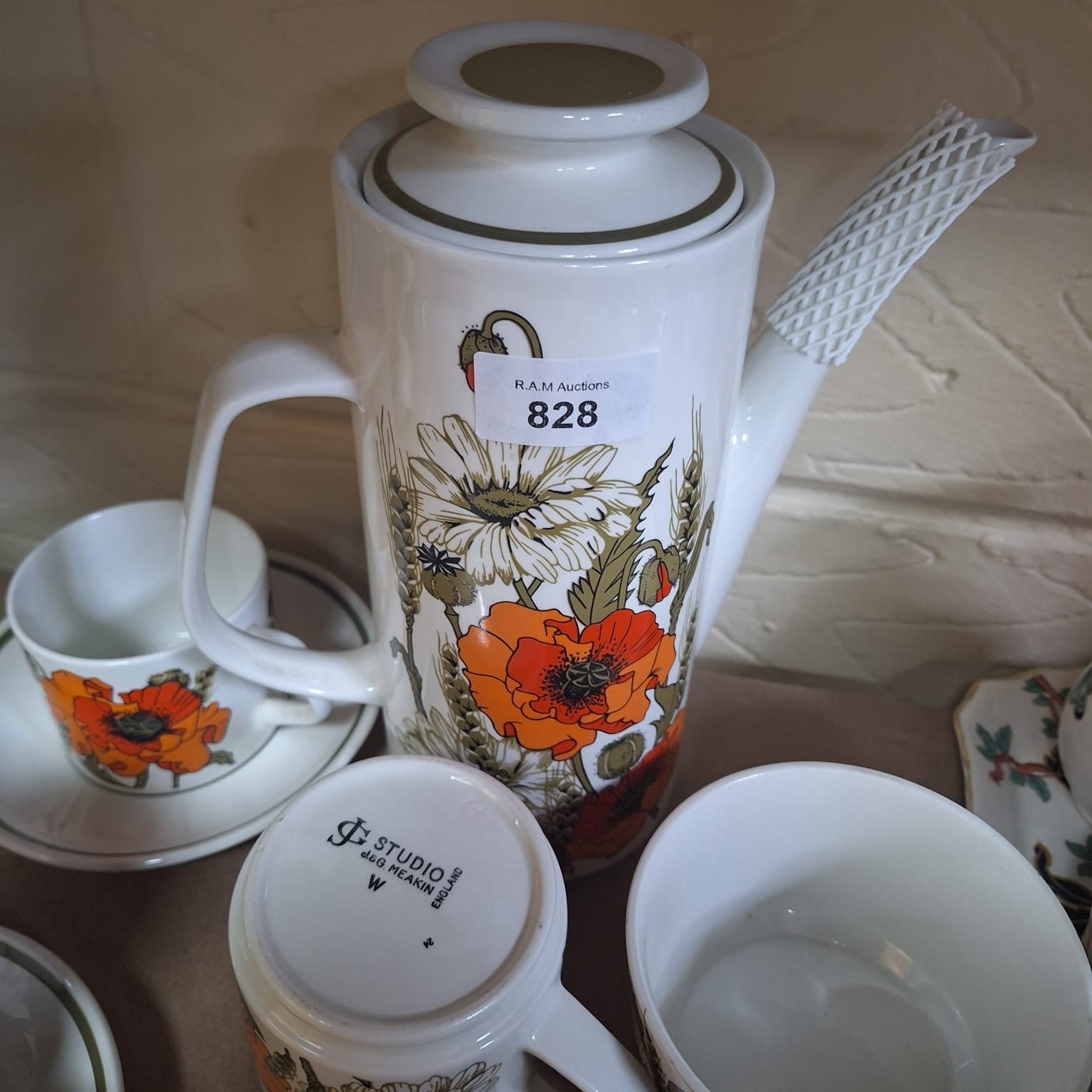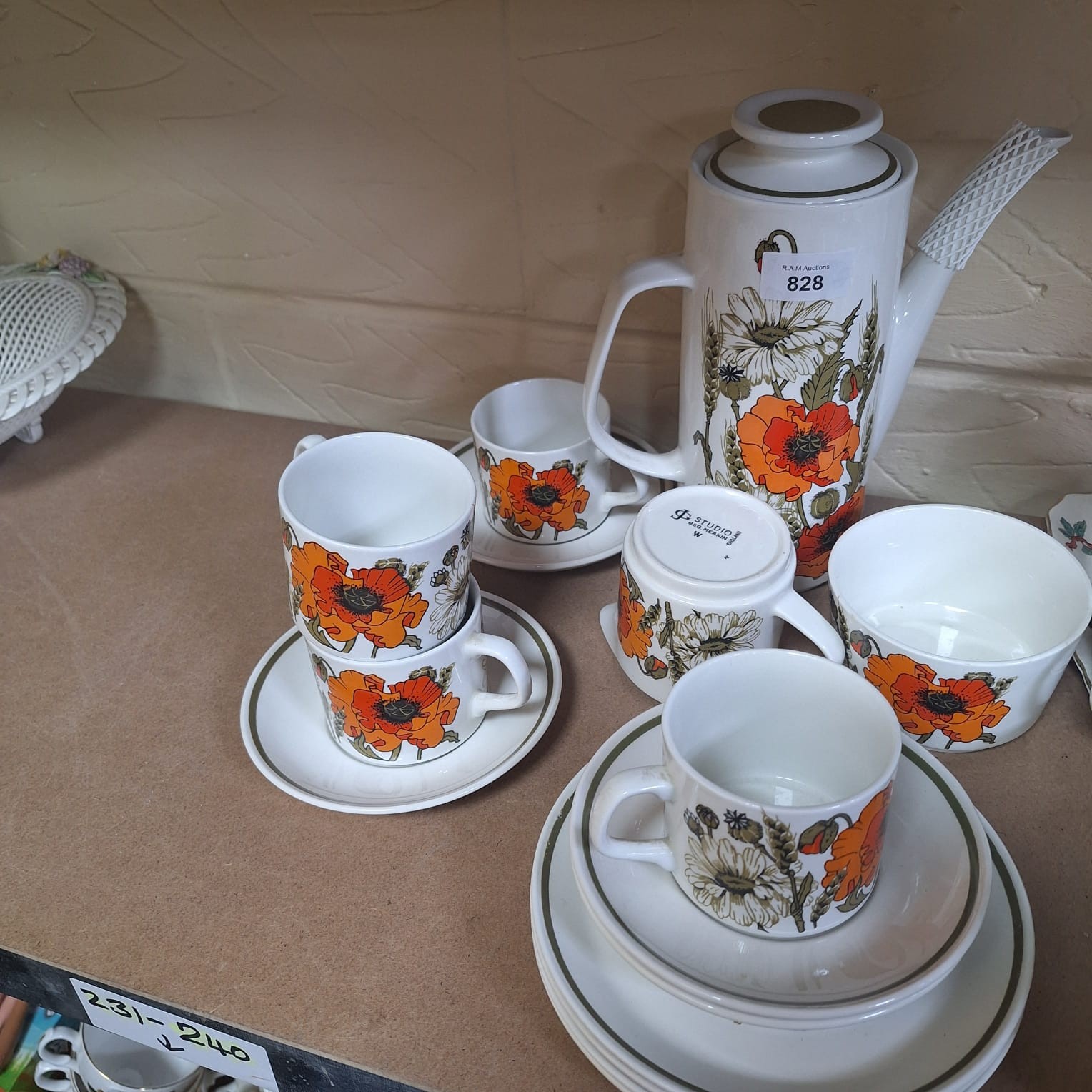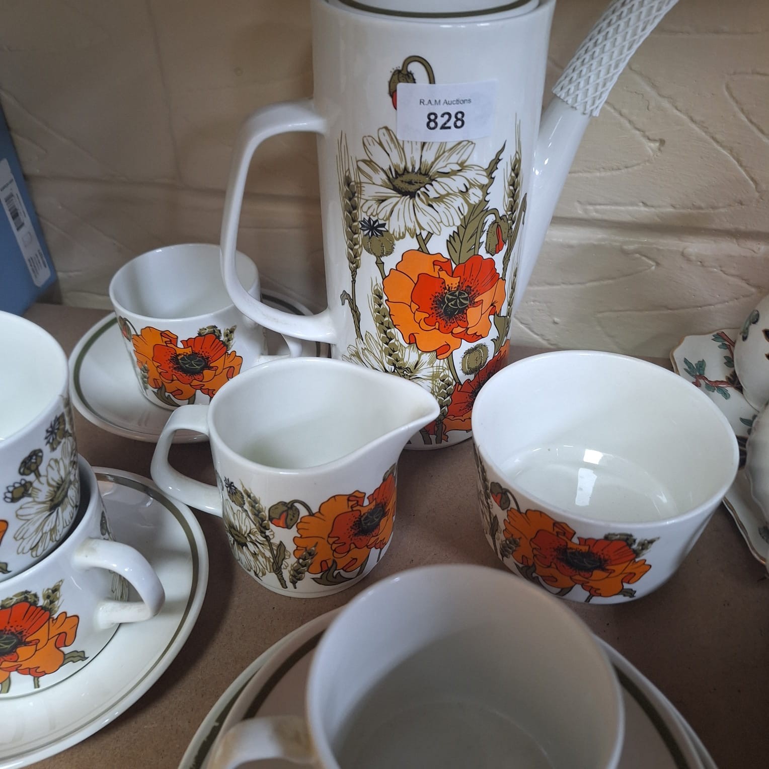 White coffee set with orange poppies, white daisies, and green wheat stalks, featuring a coffee pot, teacups, saucers, creamer, and sugar bowl.