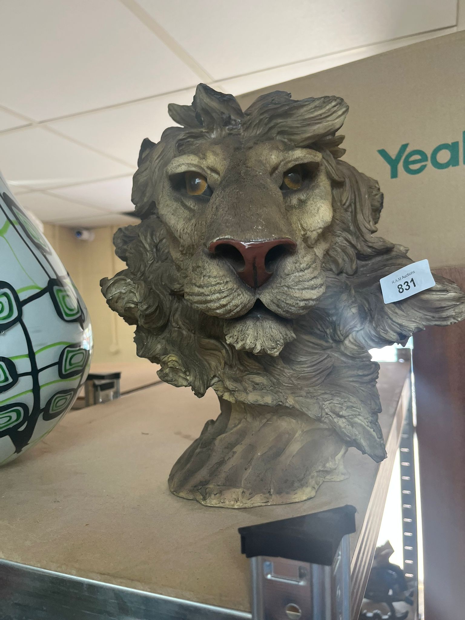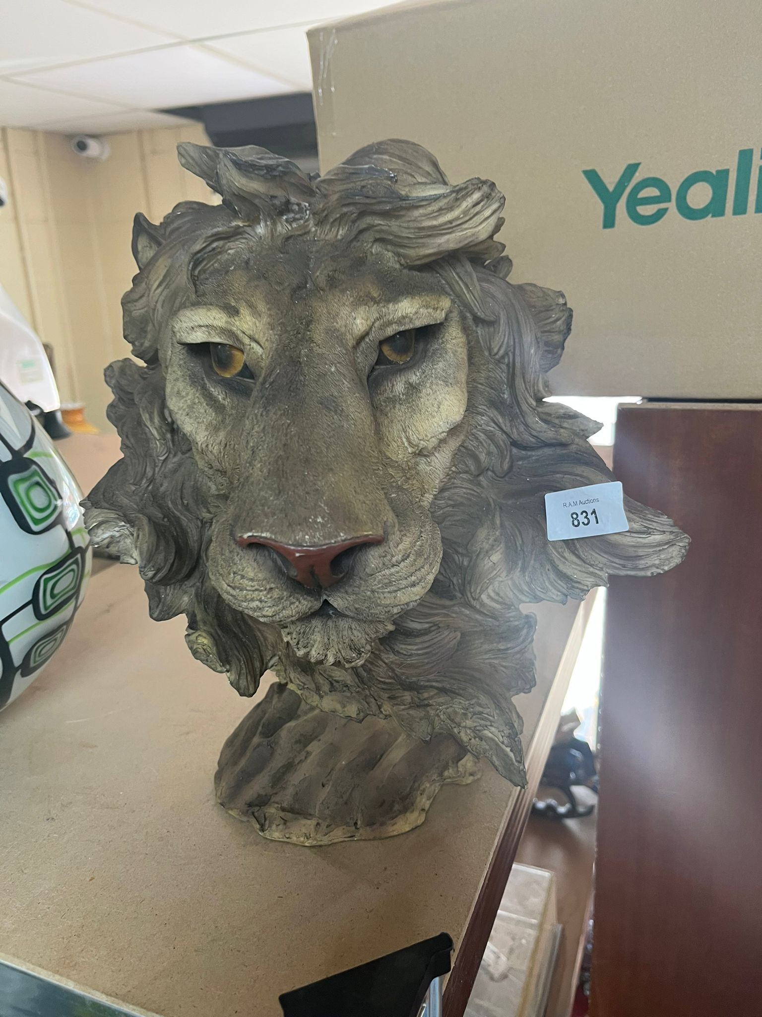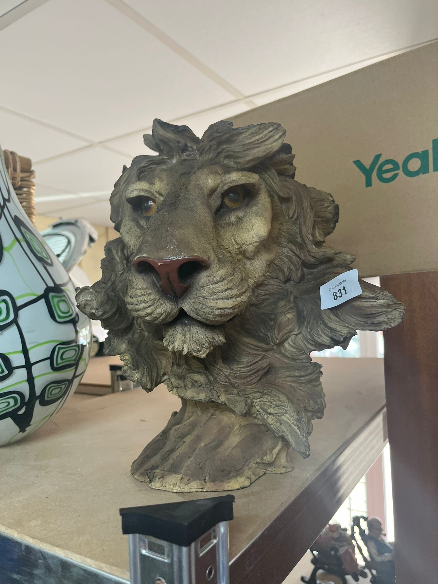 A grayish-brown lion head bust figurine with amber eyes and a wood-grained base.