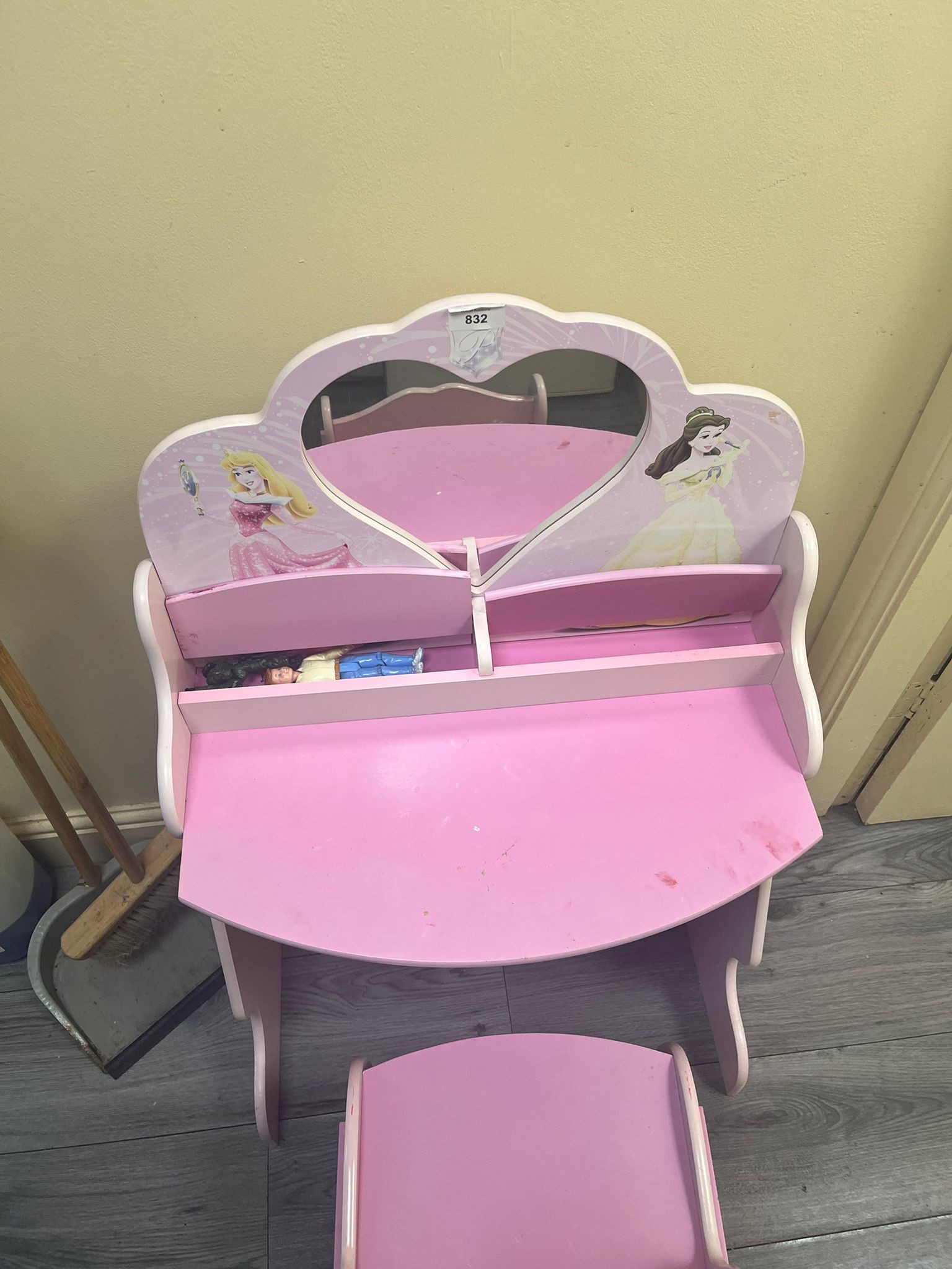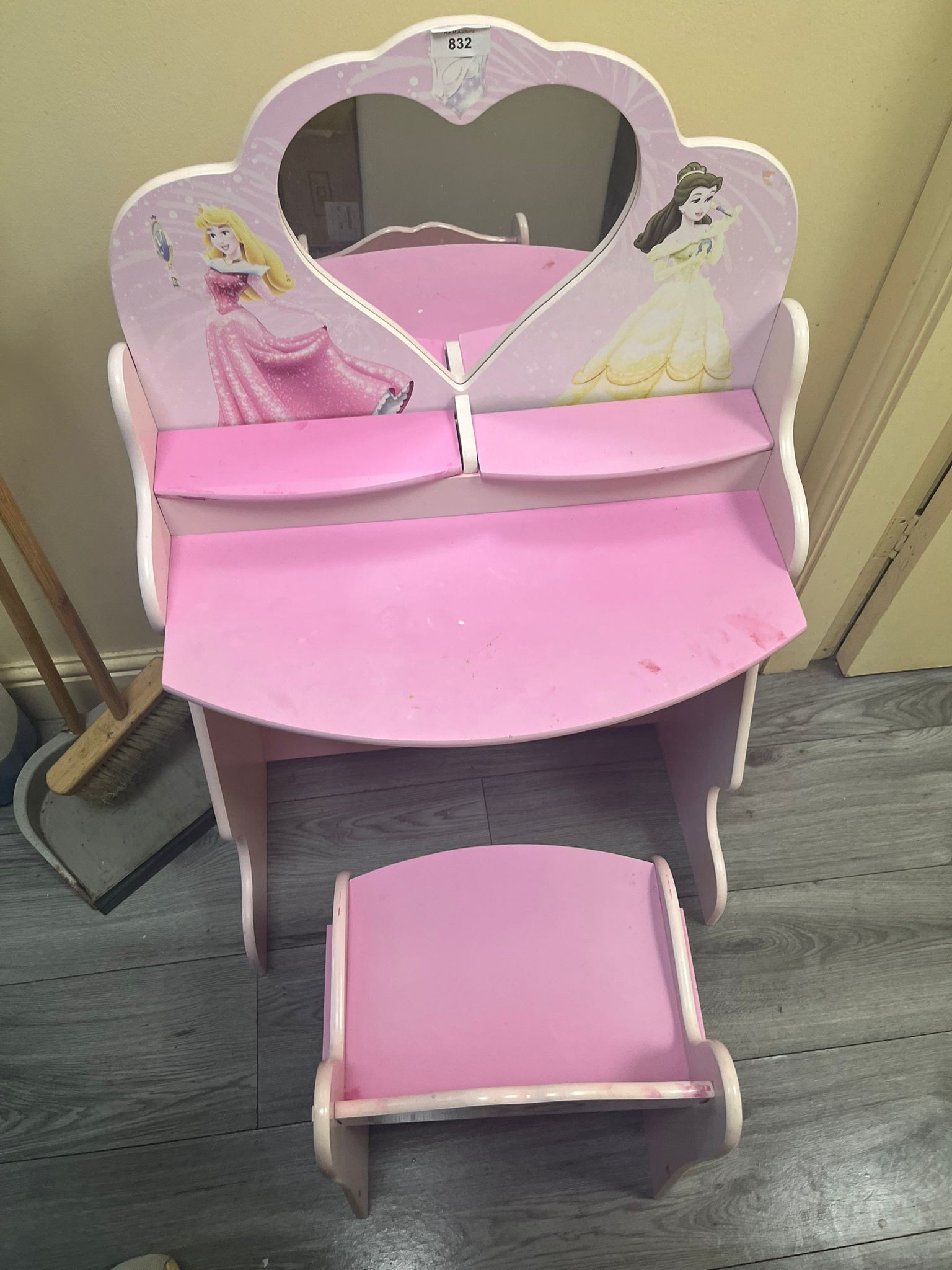 Wooden pink children’s vanity with heart-shaped mirror featuring Princess Aurora and Belle, and a matching stool.