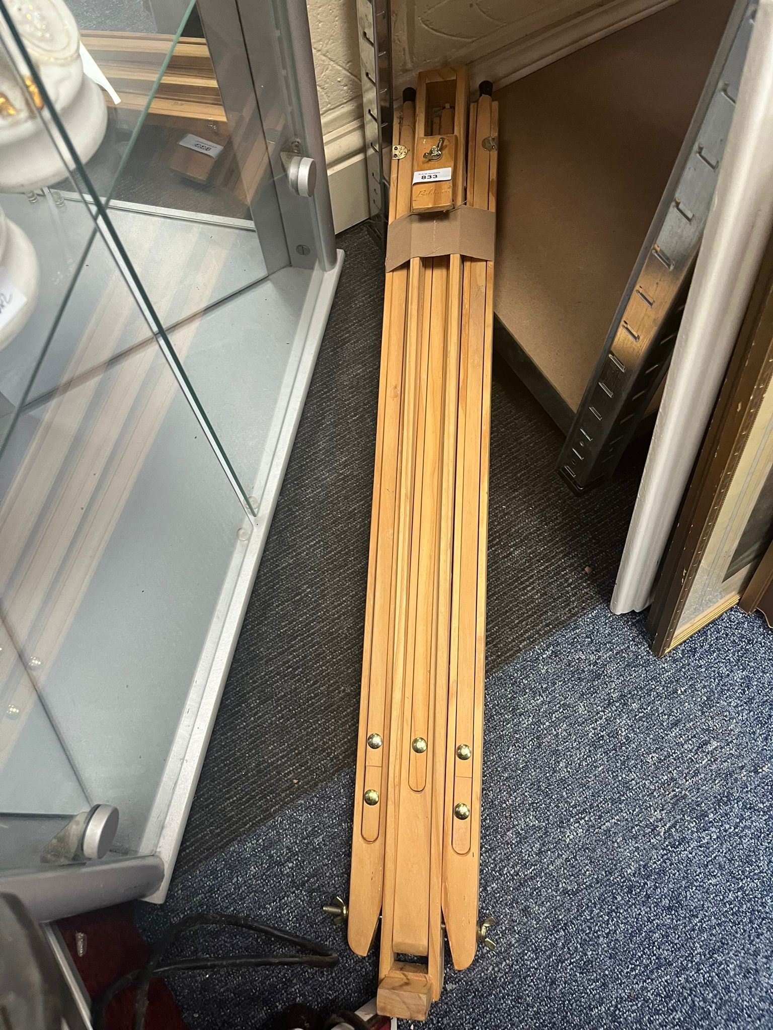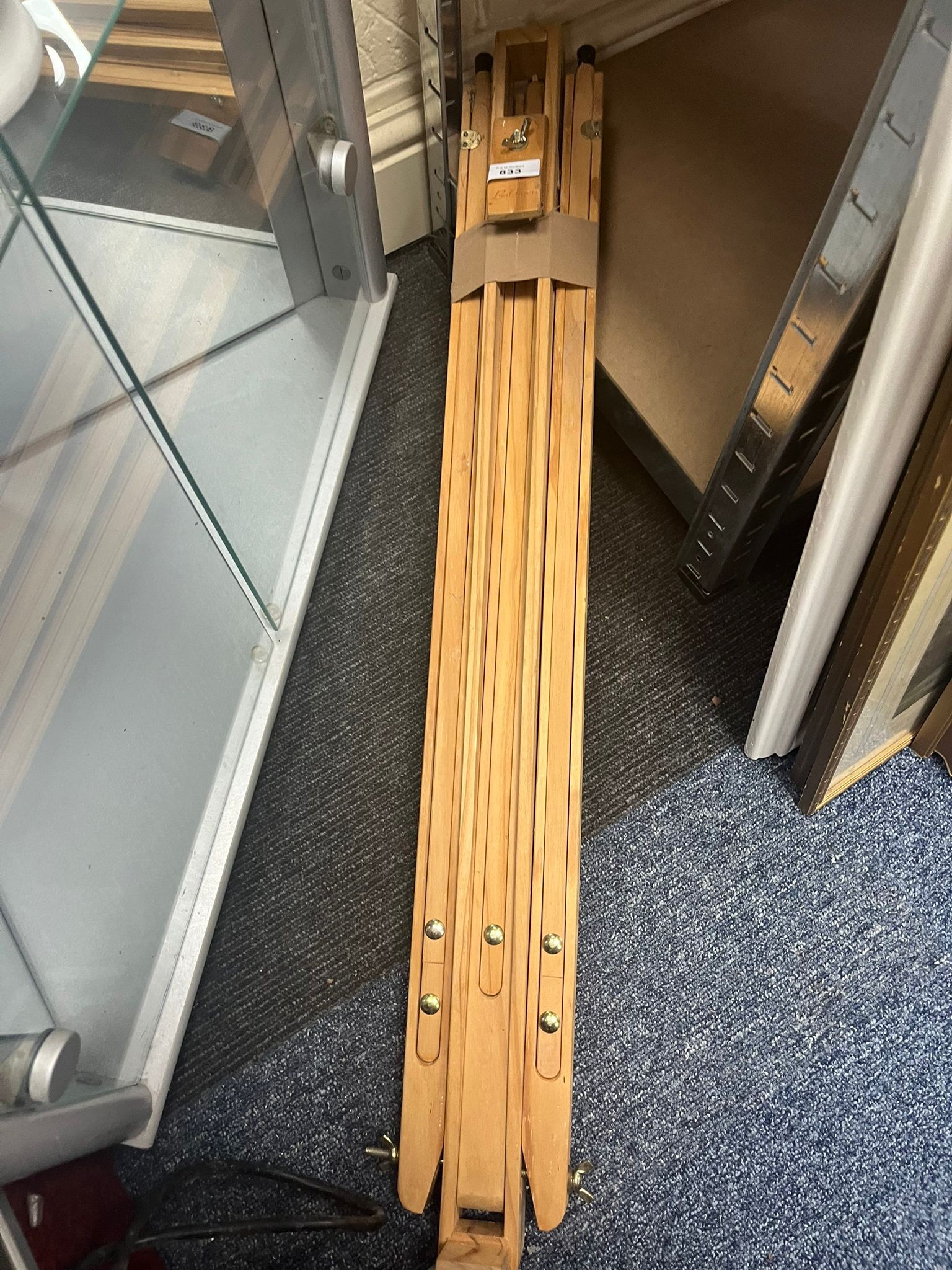 A light brown wooden tripod easel, folded flat, with brass-colored metal fasteners and minor surface imperfections.