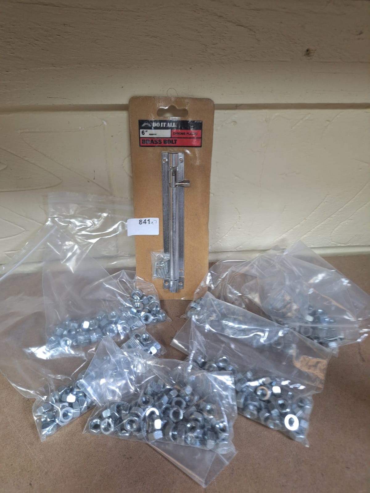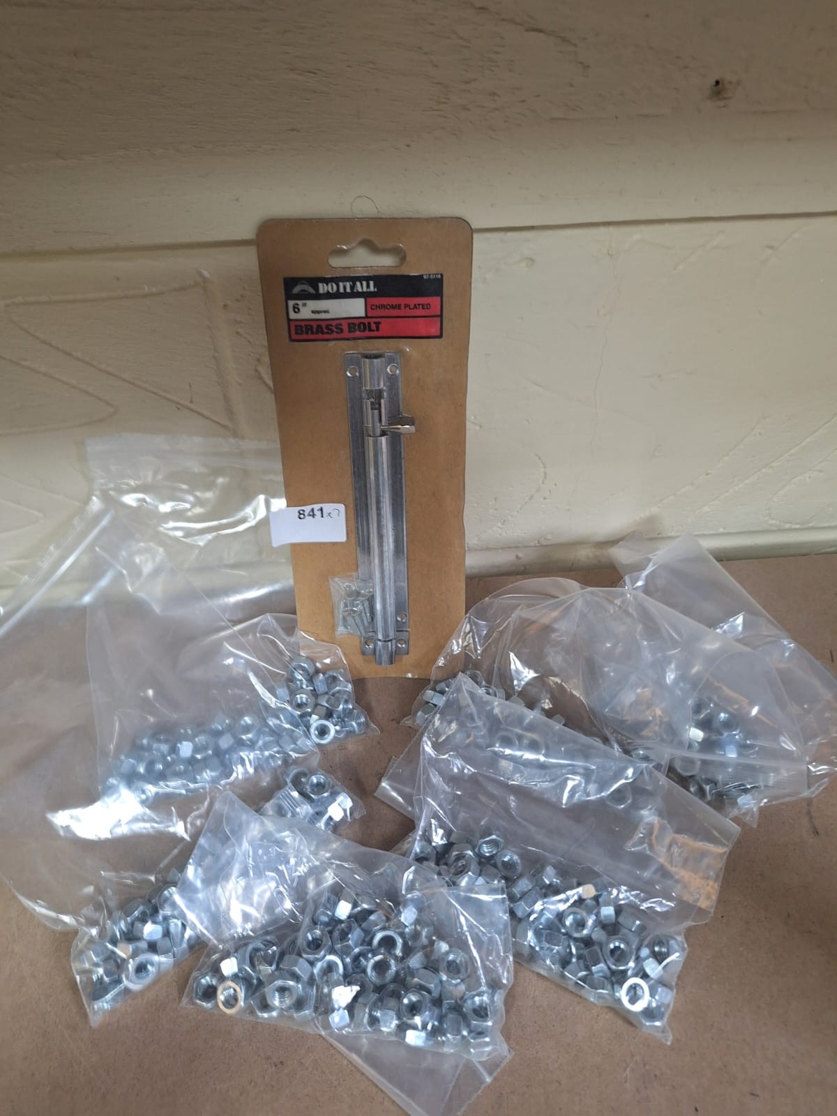 New, in package, silver-toned “DO IT ALL” brand 8″ chrome-plated brass bolt with sliding mechanism and mounting hardware, including nuts and washers.