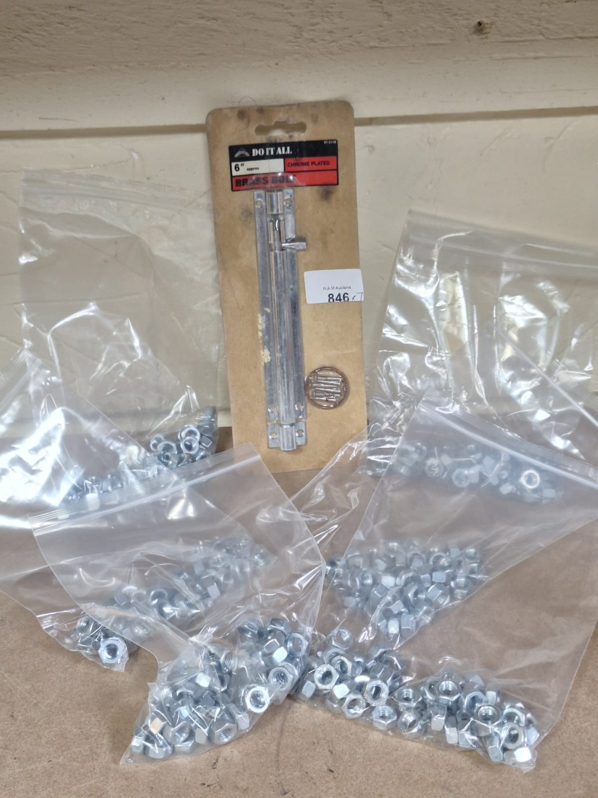 New, unopened DO IT ALL 6″ sliding door bolt, silver-toned metal, chrome plated, with hex nuts.