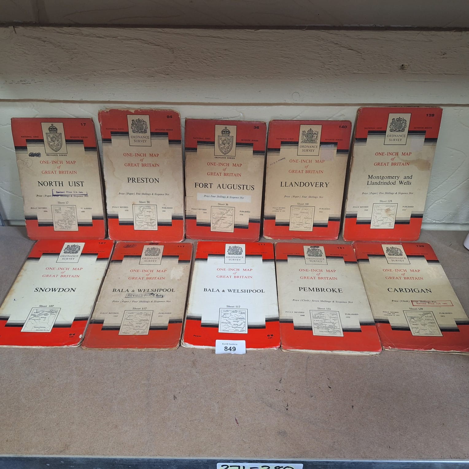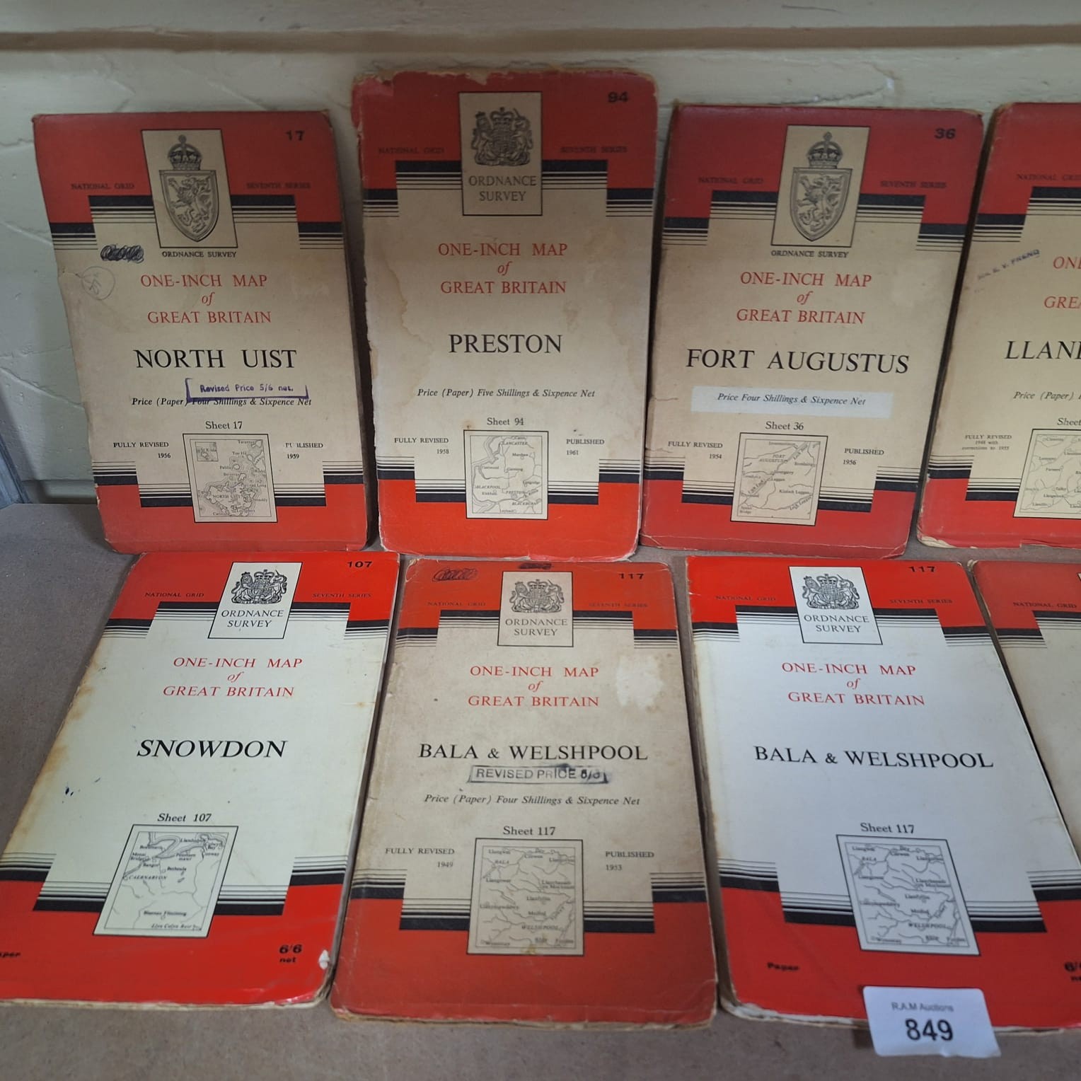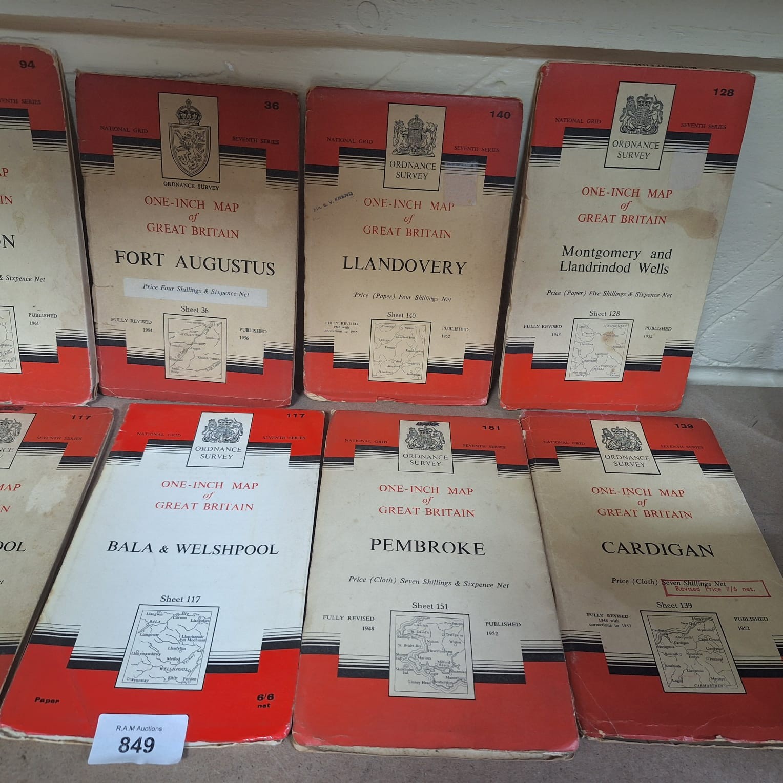 Ordnance Survey one-inch maps of Great Britain in booklet format with red covers.