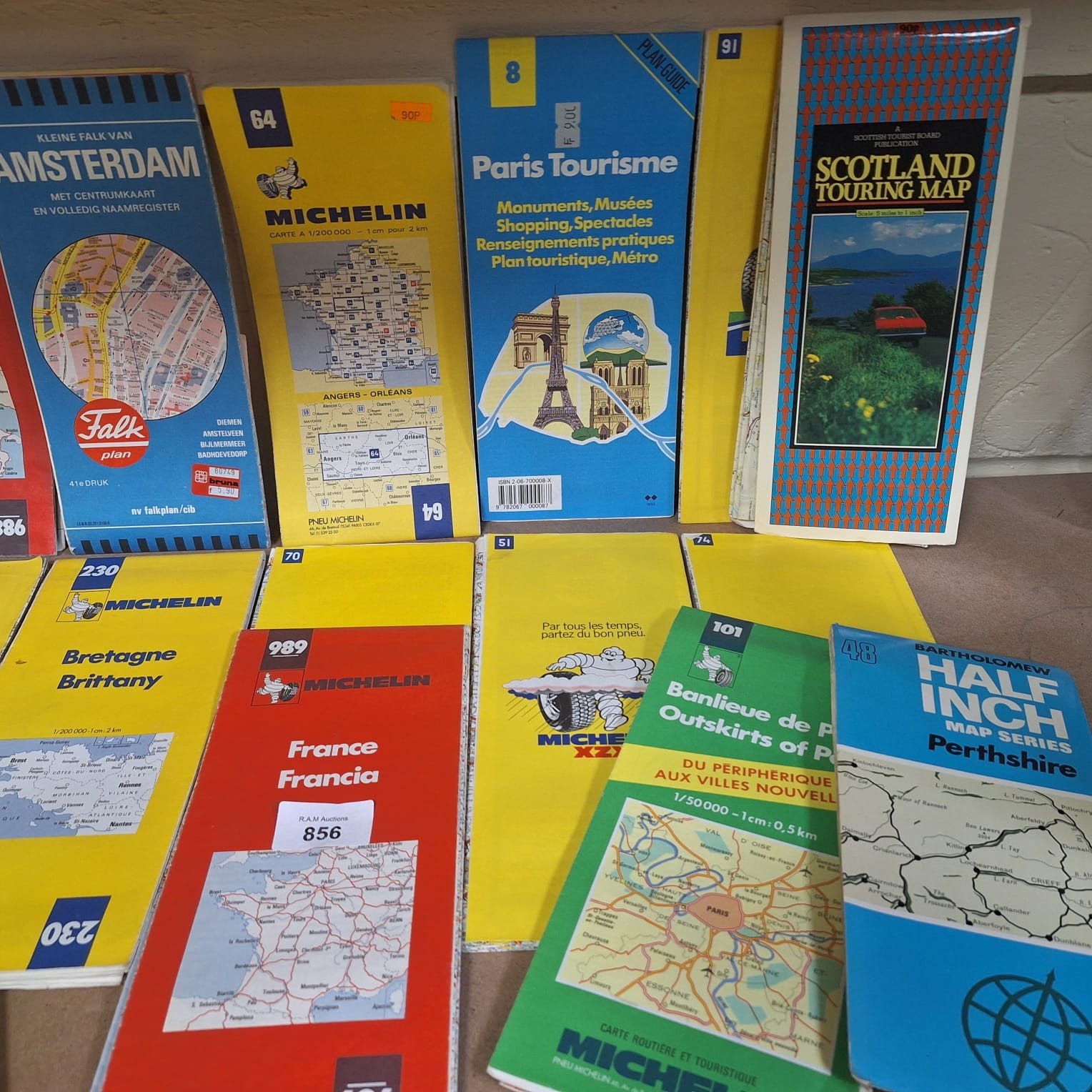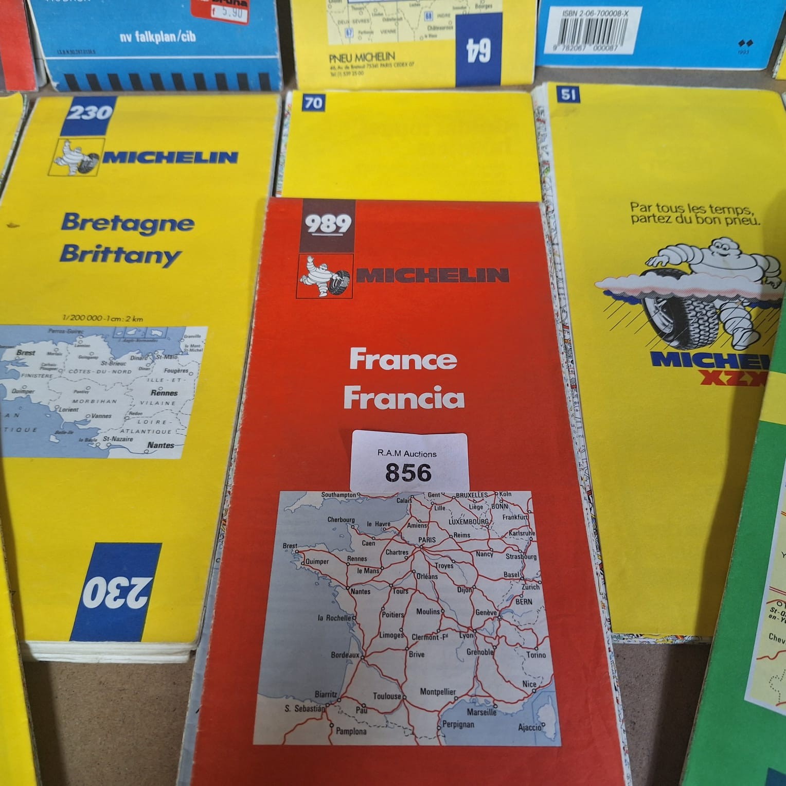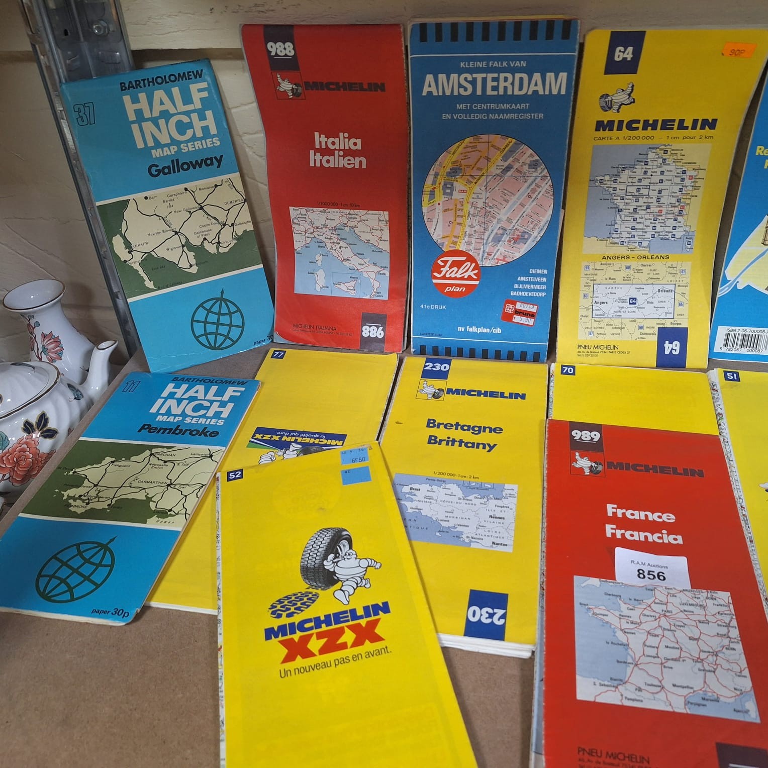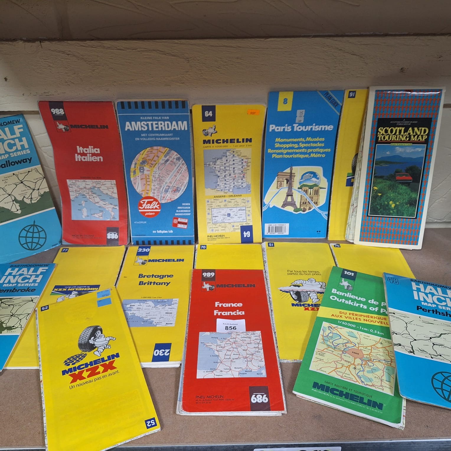 A collection of folded paper maps including Michelin regional maps of France, Italy, and Bartholomew Half Inch Map Series.