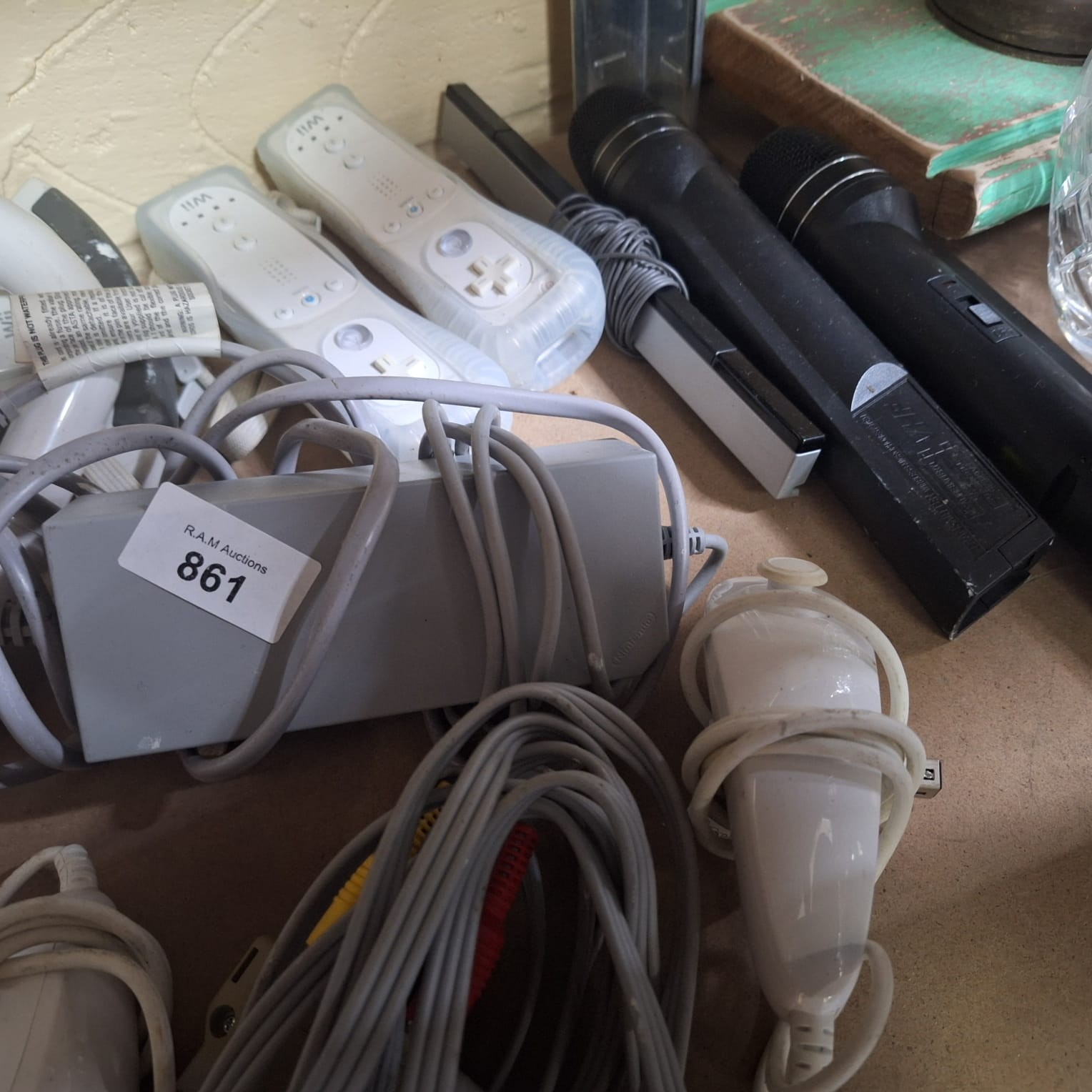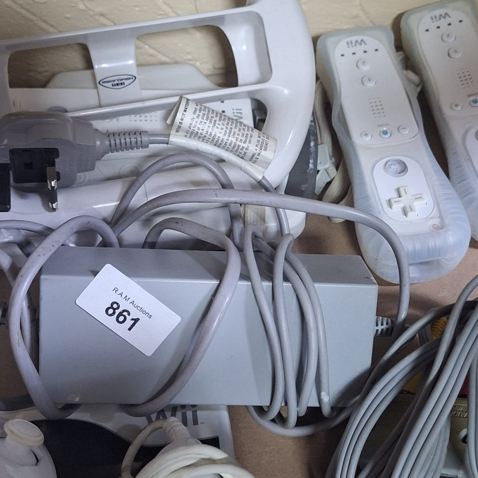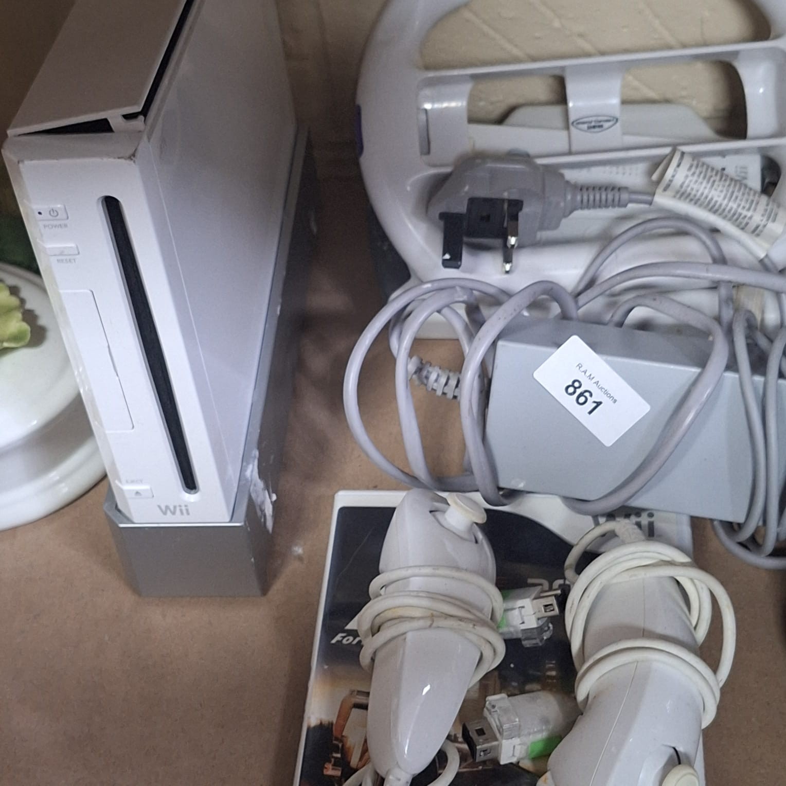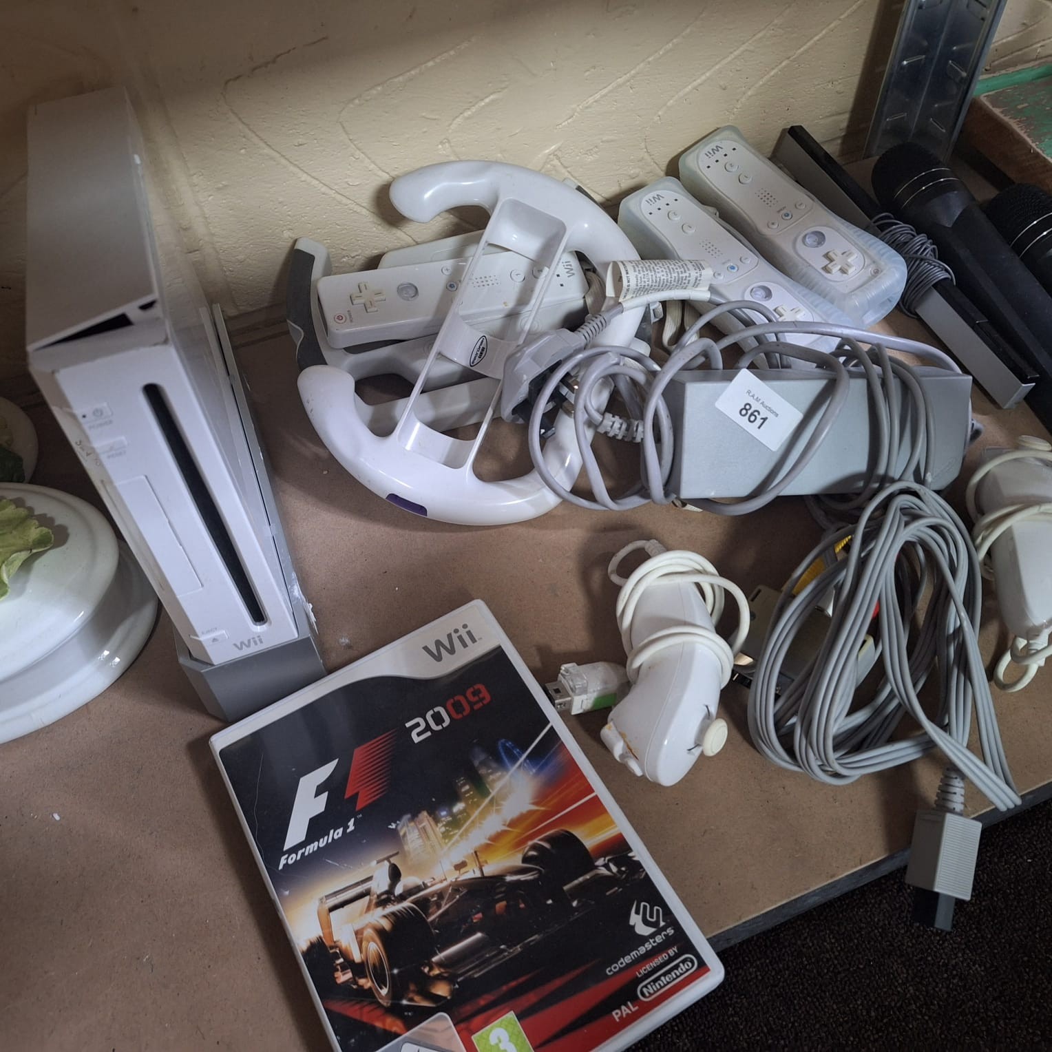 White Nintendo Wii console with grey base, Wii remotes, steering wheel, power supply, cables, microphones, and F1 2009 game.