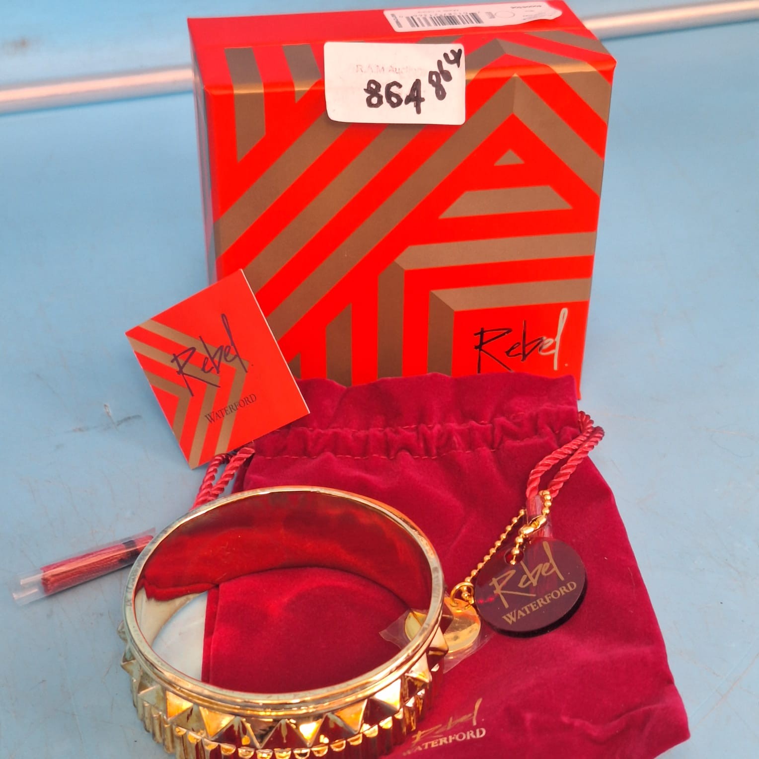 A rigid, wide gold-toned metal bangle bracelet featuring a textured, studded design with triangular studs, presented in a branded red box with accessories.