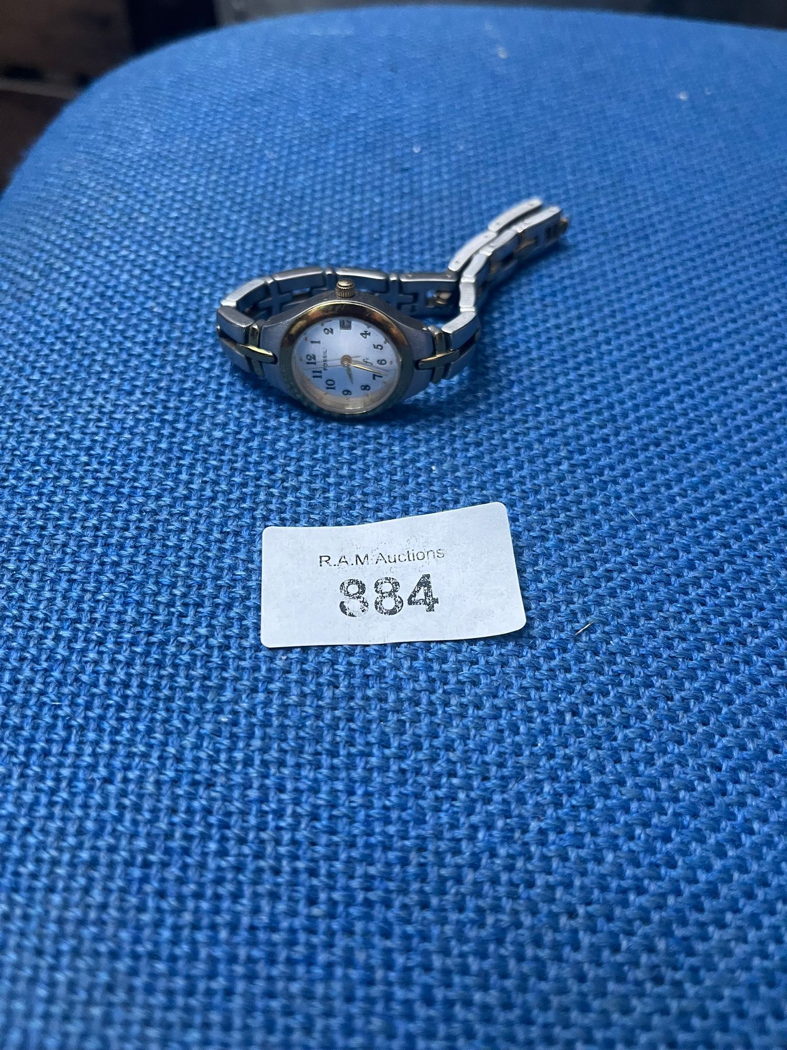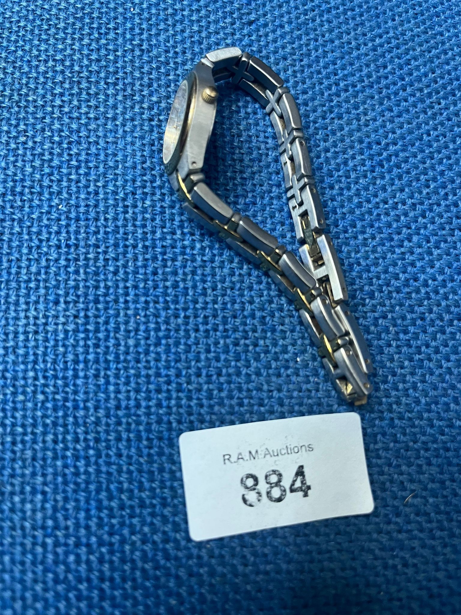 Oval-shaped wristwatch with a white face, black Roman numerals, and a silver and gold-toned metal bracelet.