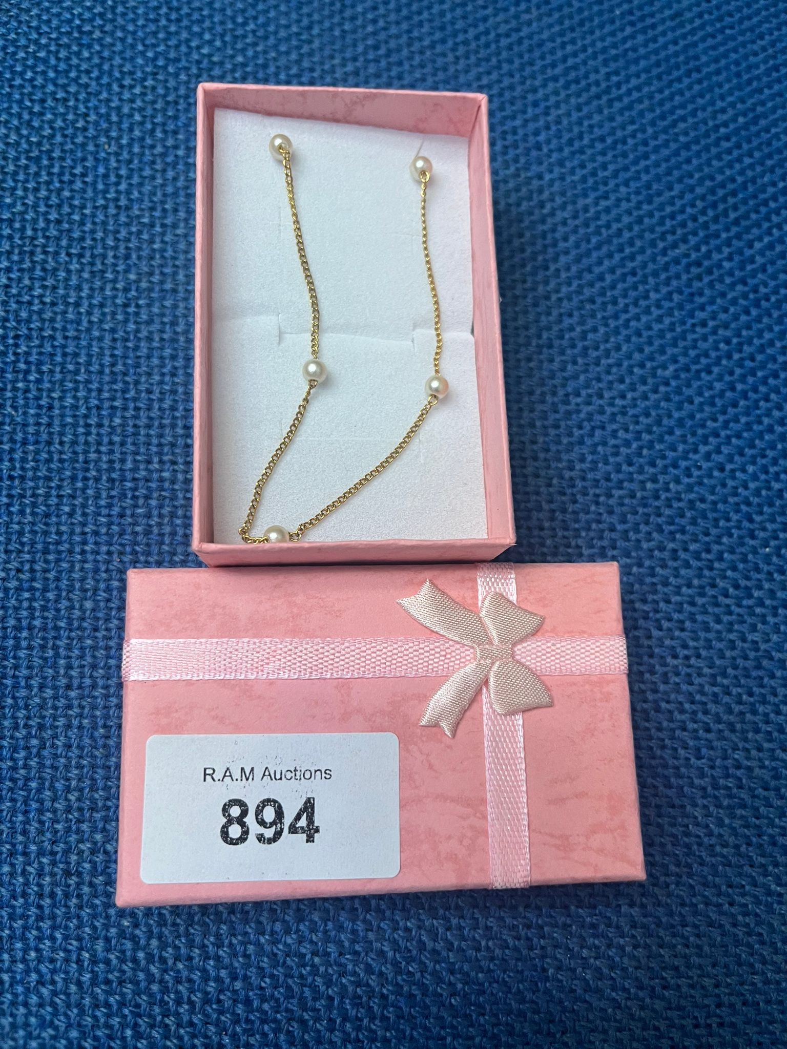 Gold-colored metal earrings with pearls suspended from delicate chains.