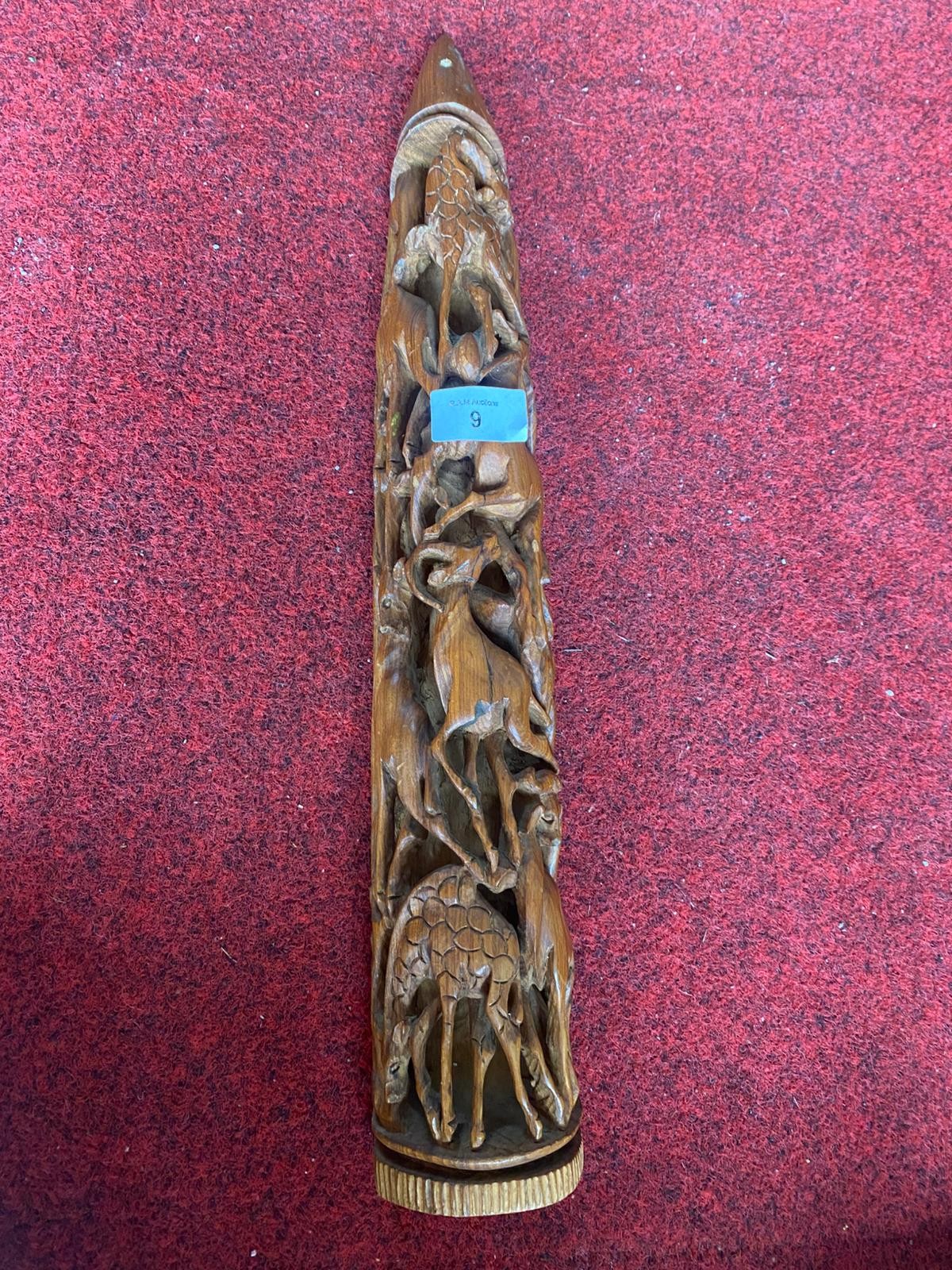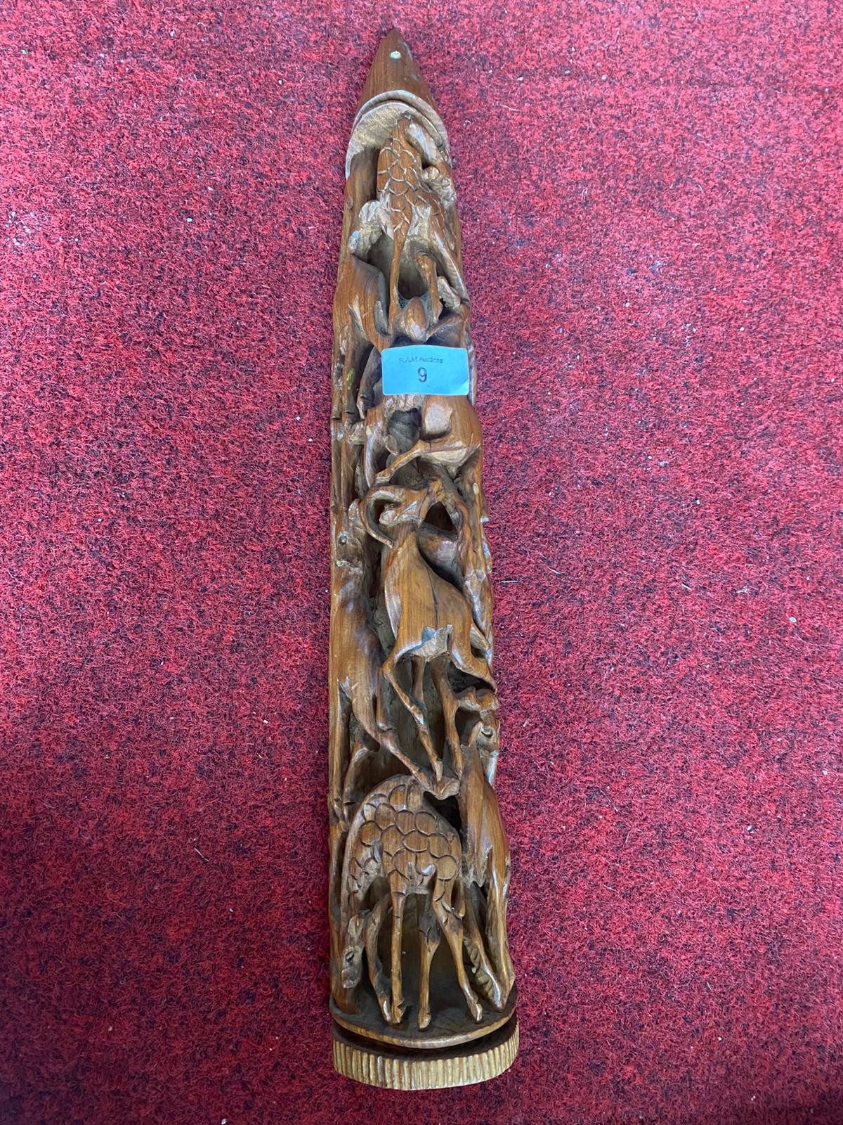 Tall cylindrical carved object with relief carvings of animals, primarily giraffes and antelopes.