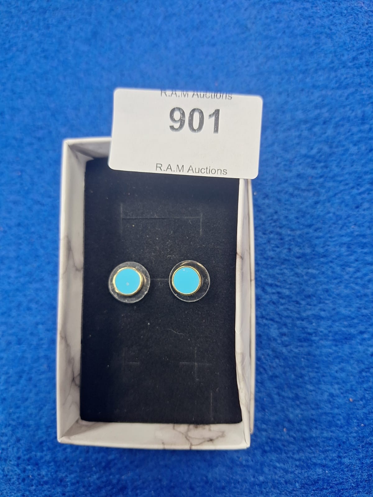 Pair of stud earrings with round, light blue centers, dark gray borders, and gold-colored outer rings.