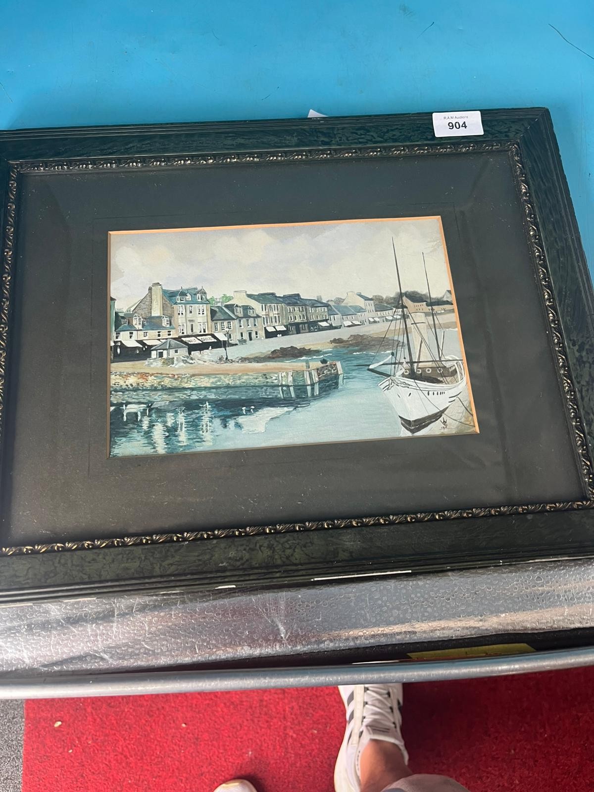 Framed artwork depicting a harbor scene with buildings and a sailboat.