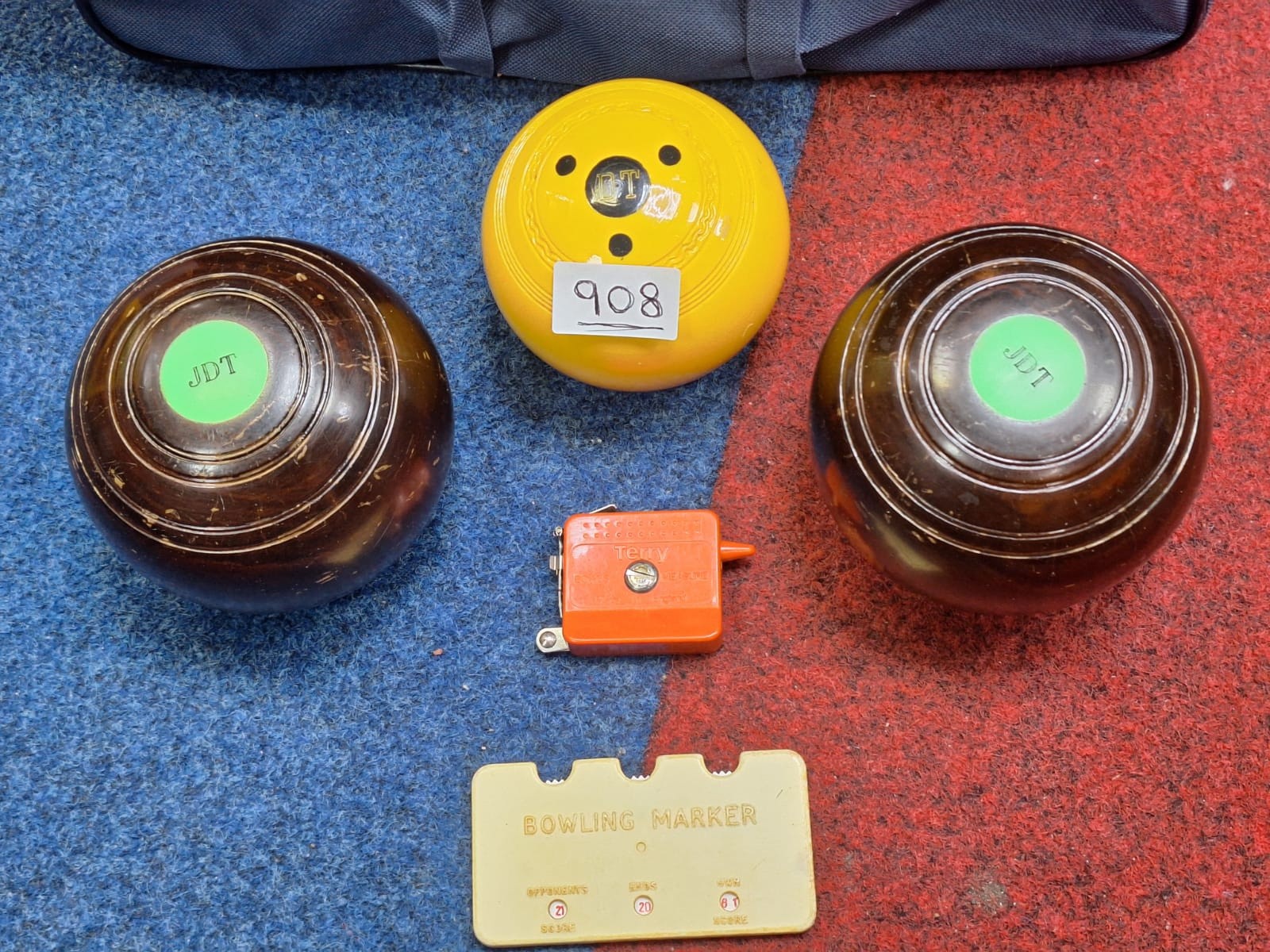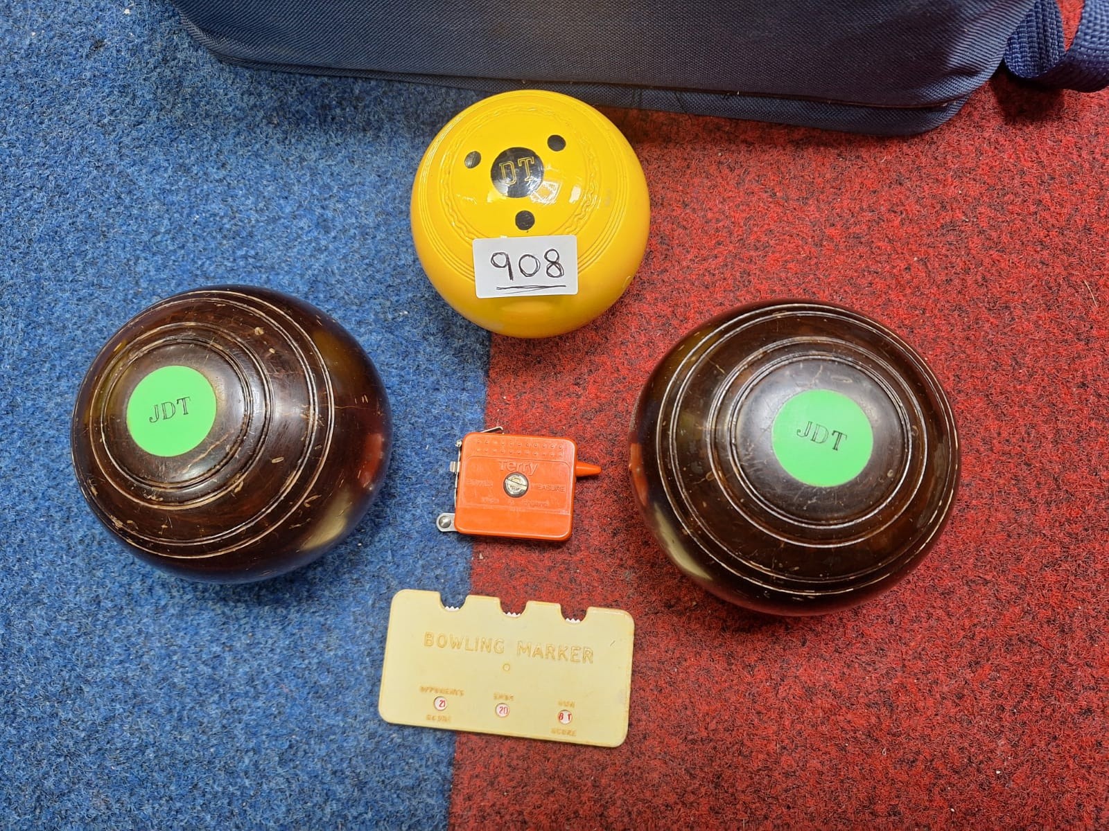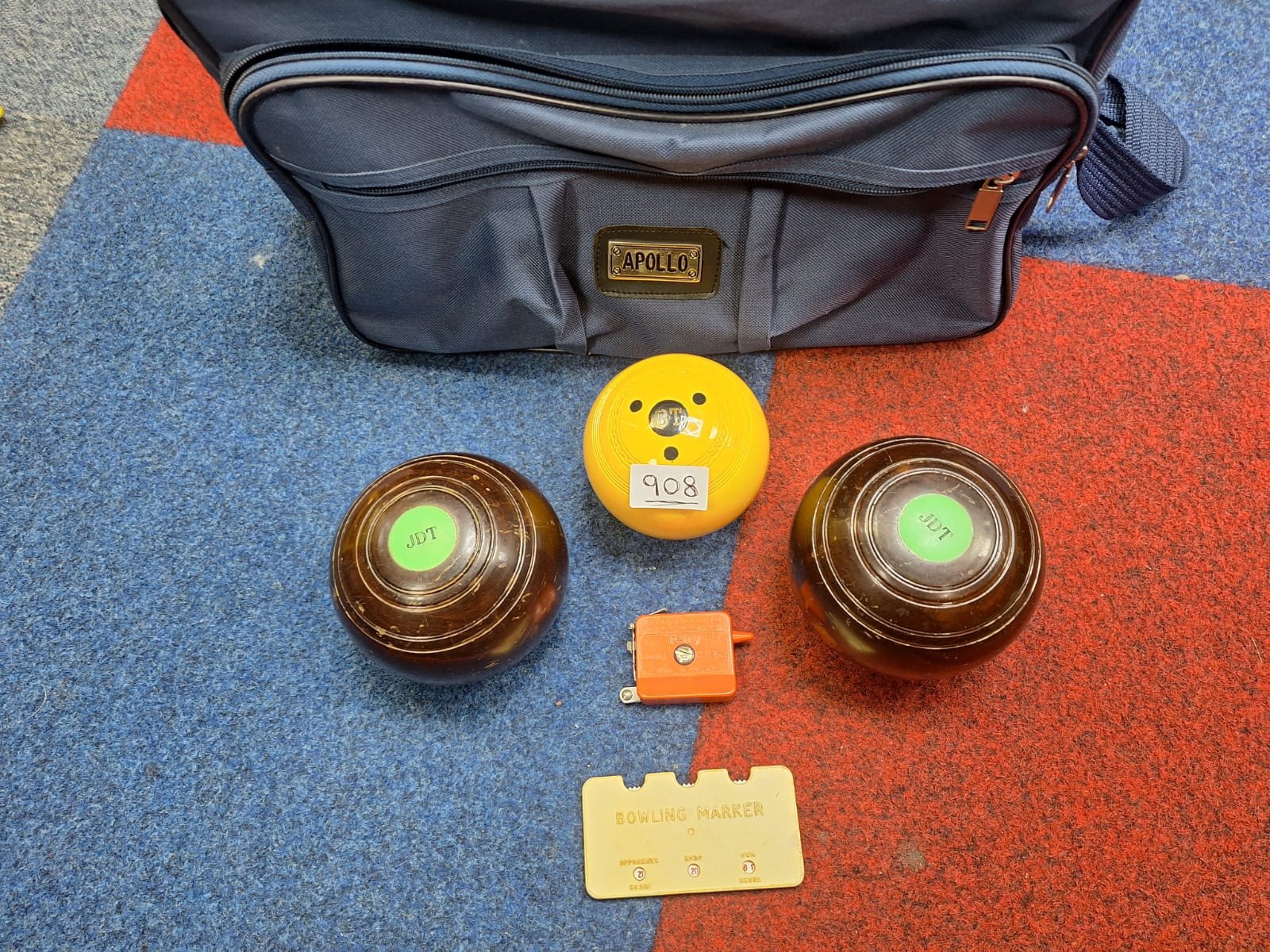 Lot includes two dark brown wooden bowls marked “JDT”, a yellow plastic bowl with holes, an orange “Taylor” measuring device, a white “Bowling Marker”, and a navy blue “APOLLO” carrying bag.