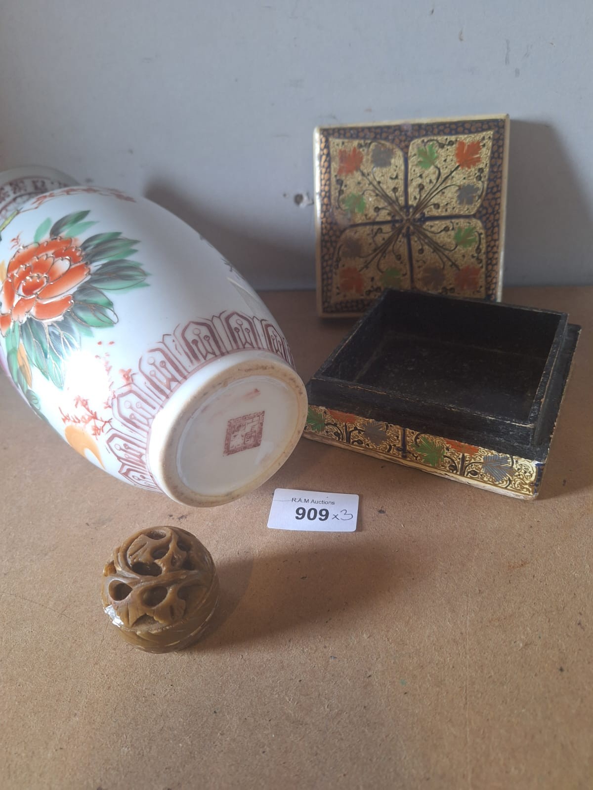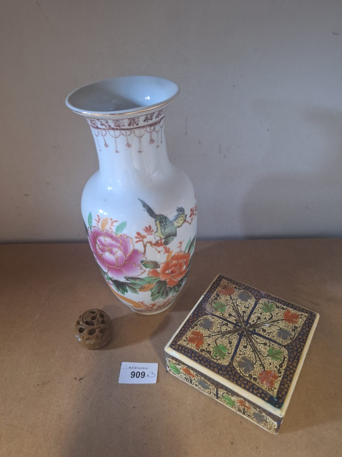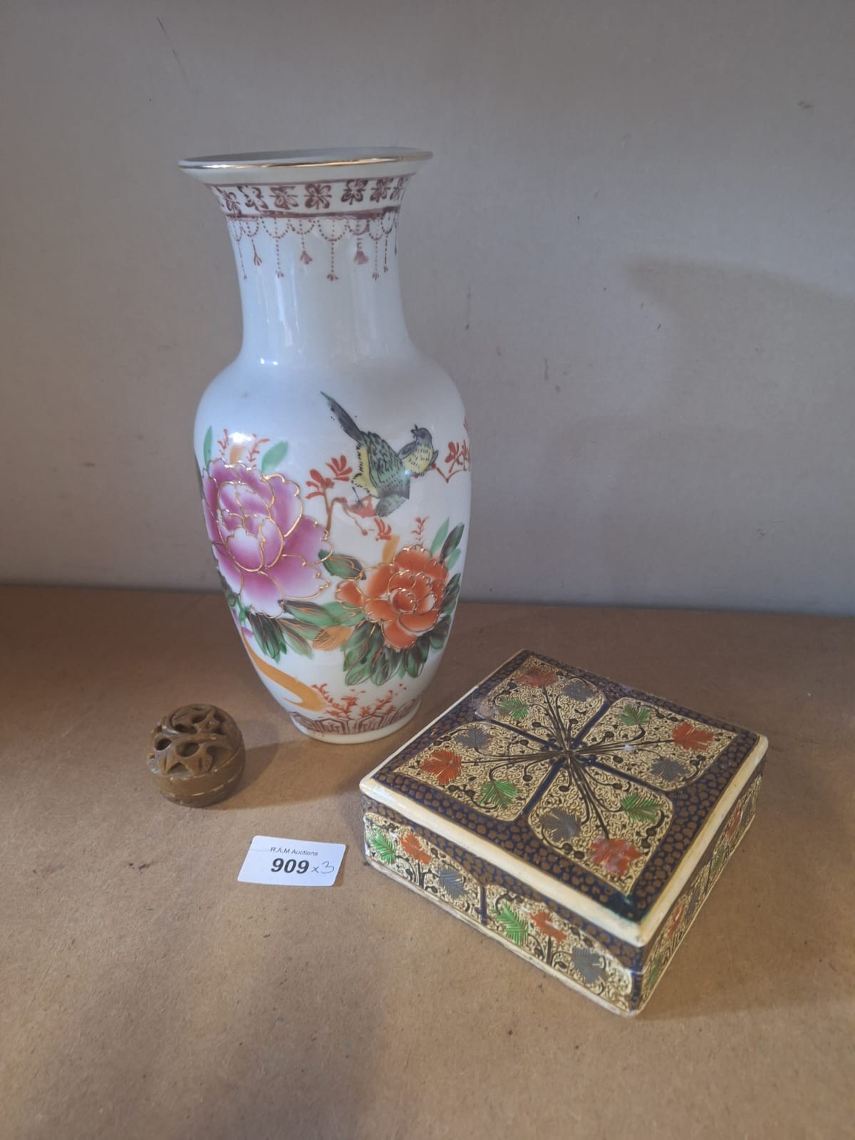 Porcelain vase with floral and bird decoration, inlaid wooden box, and carved stone object.