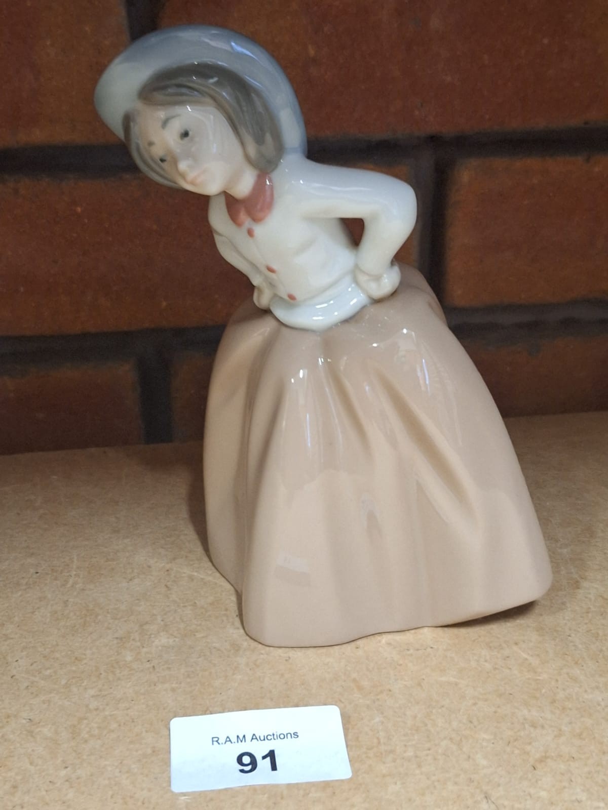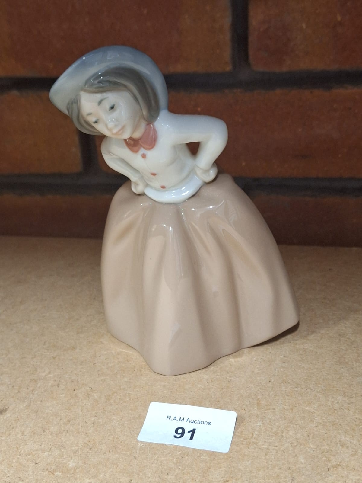 Porcelain figurine of a girl in a hat and dress, bending over with hands on hips.