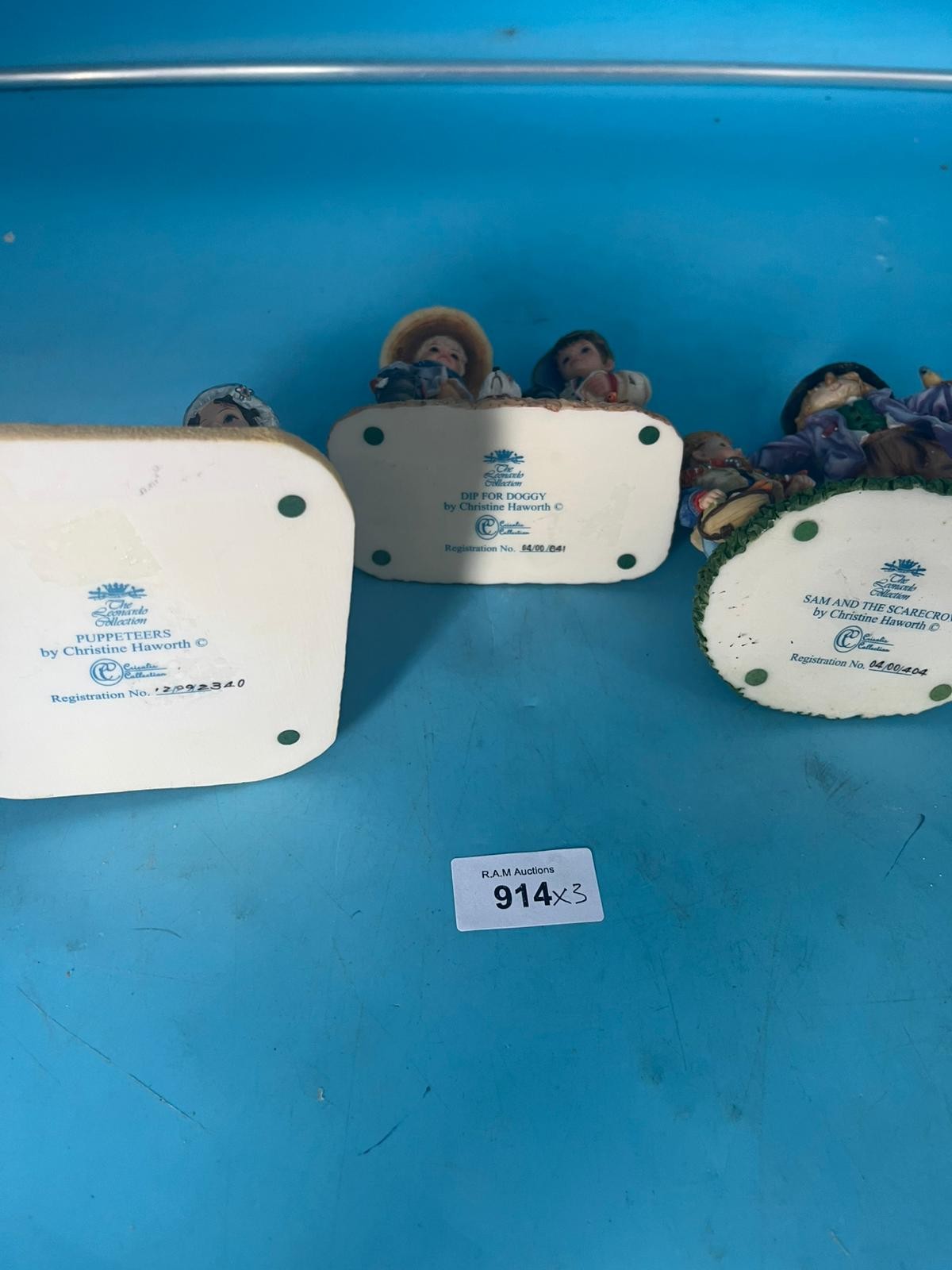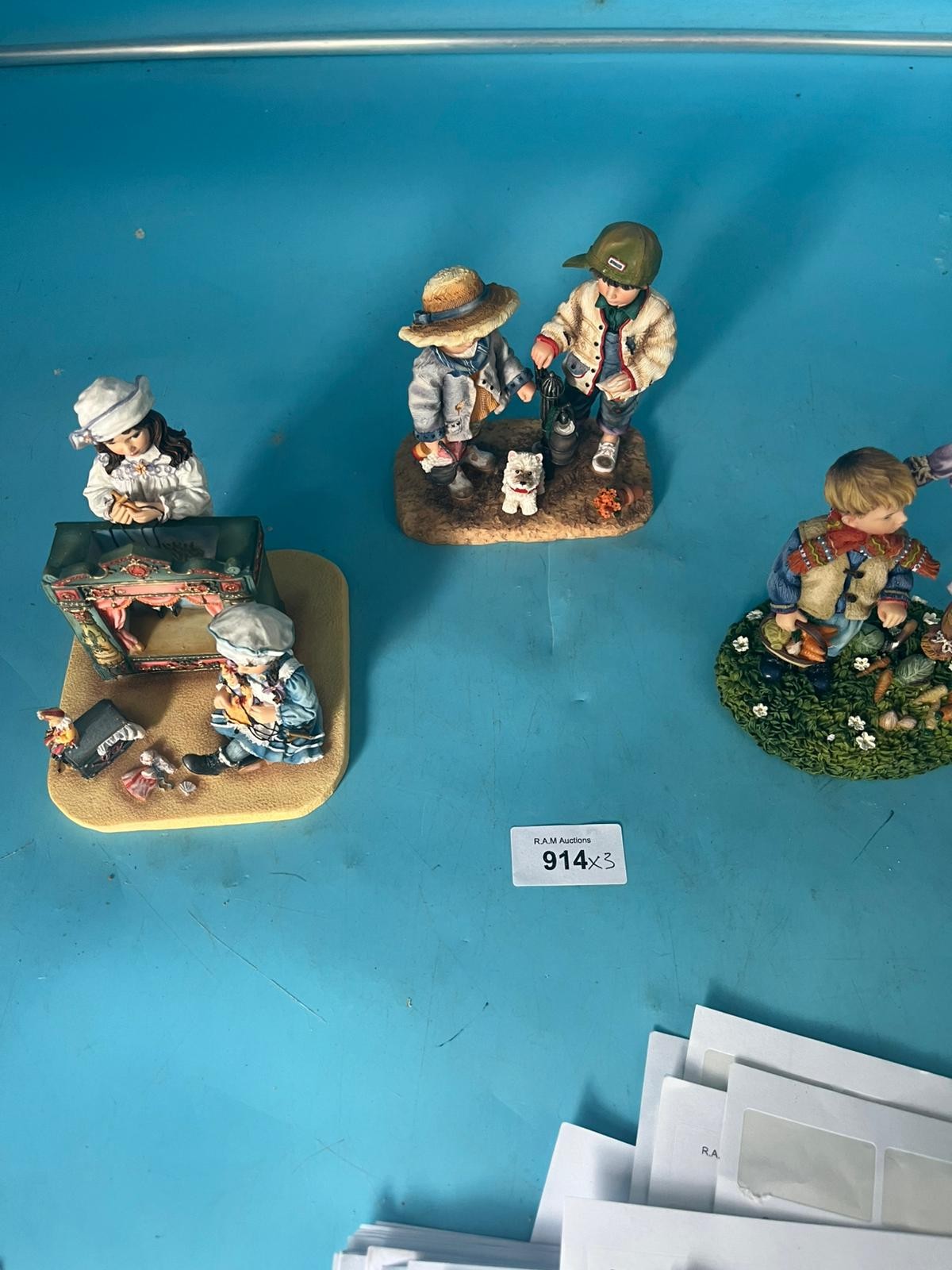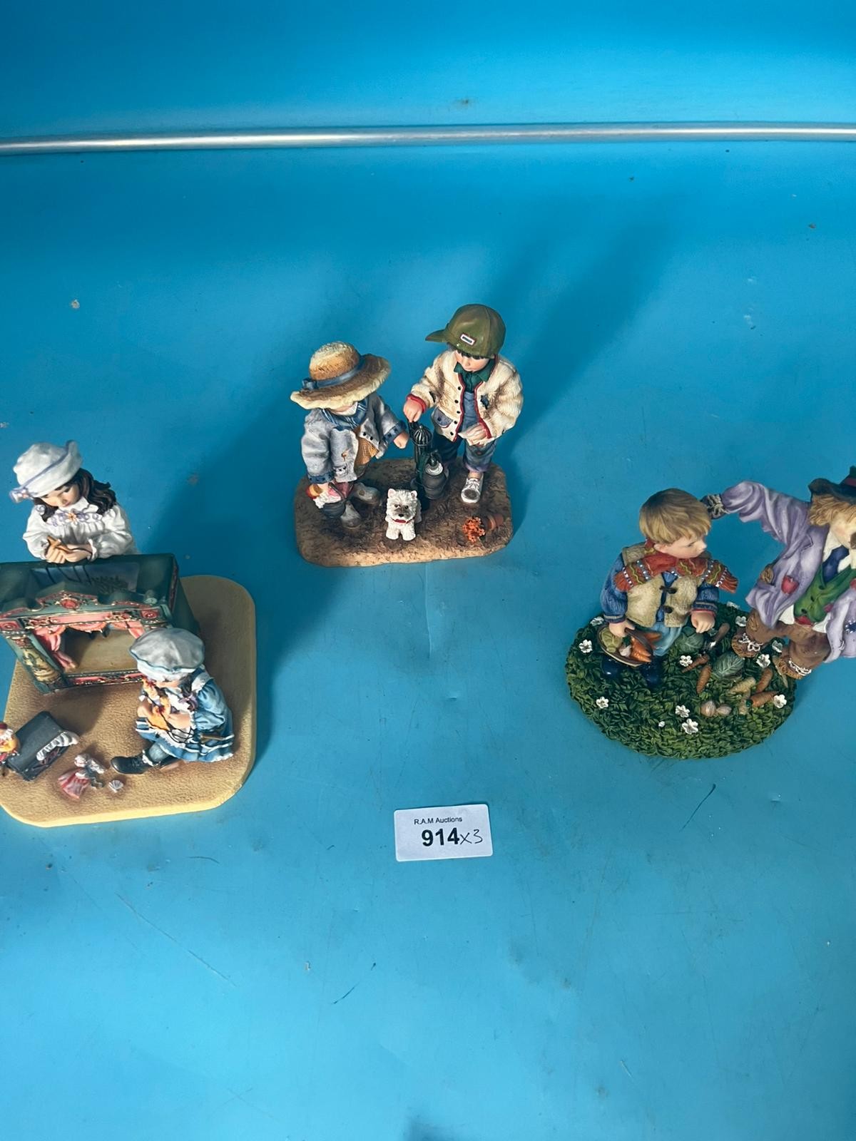 Resin figurines depicting children, including a puppet theater scene, by Christine Haworth.