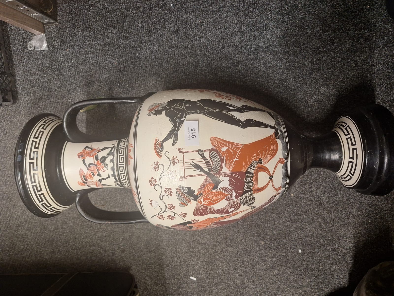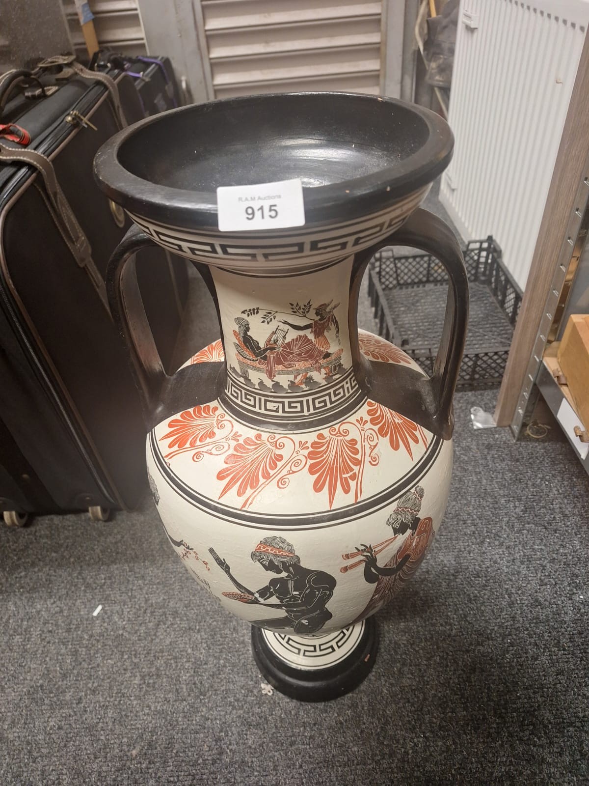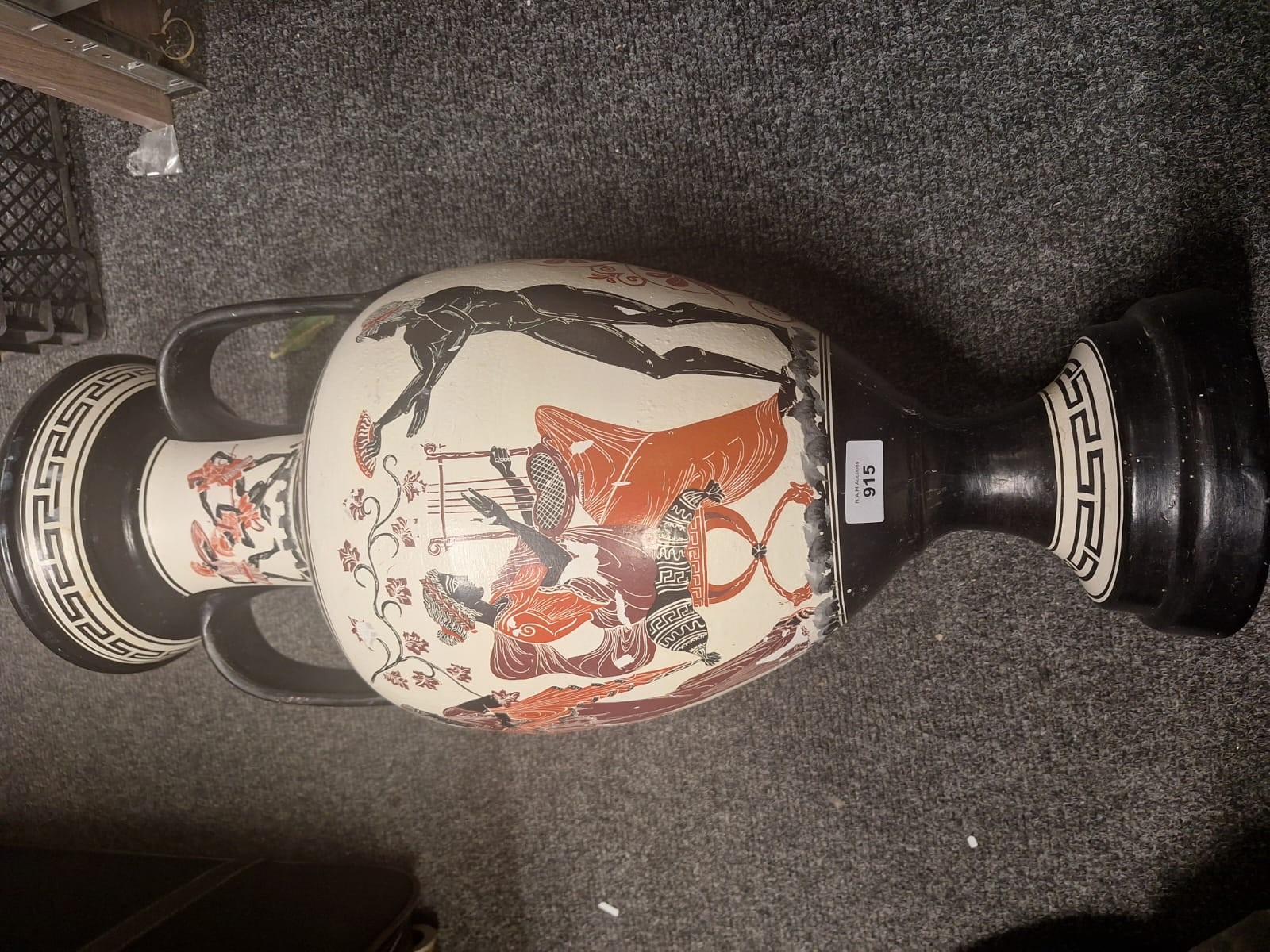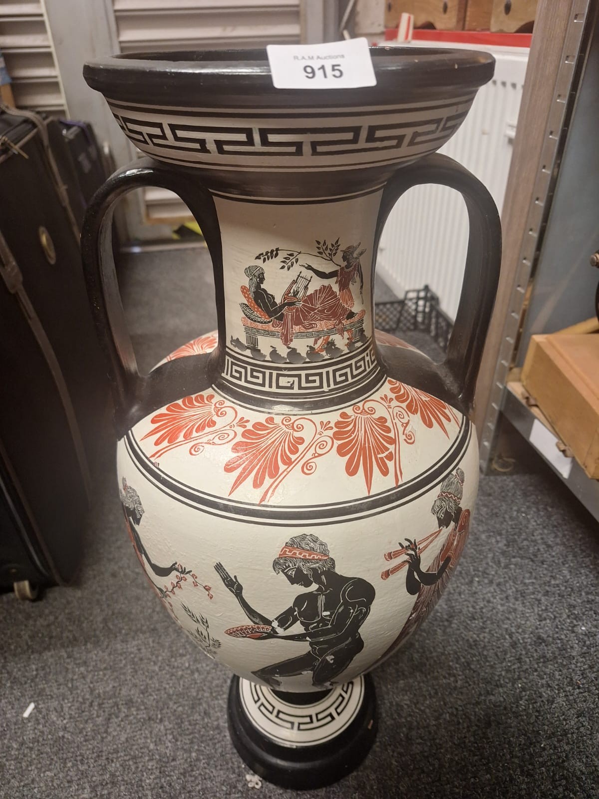 Large cream-colored amphora-shaped ceramic vase with black and reddish-orange painted classical scenes and geometric patterns.