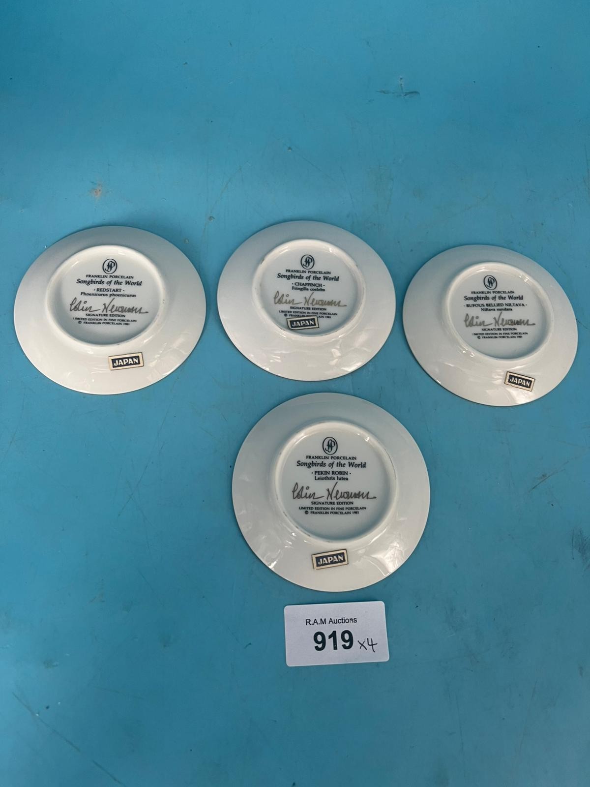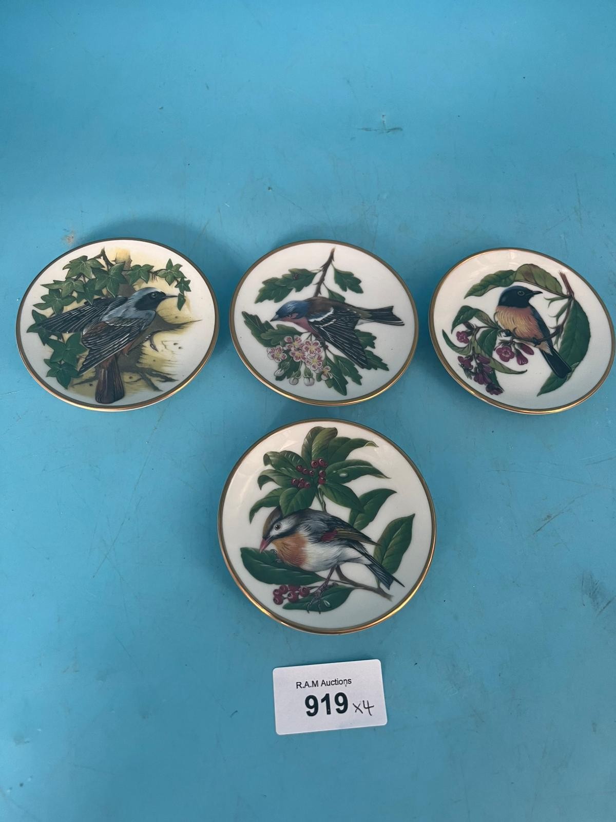 Porcelain plates featuring painted songbirds and foliage with gold trim.