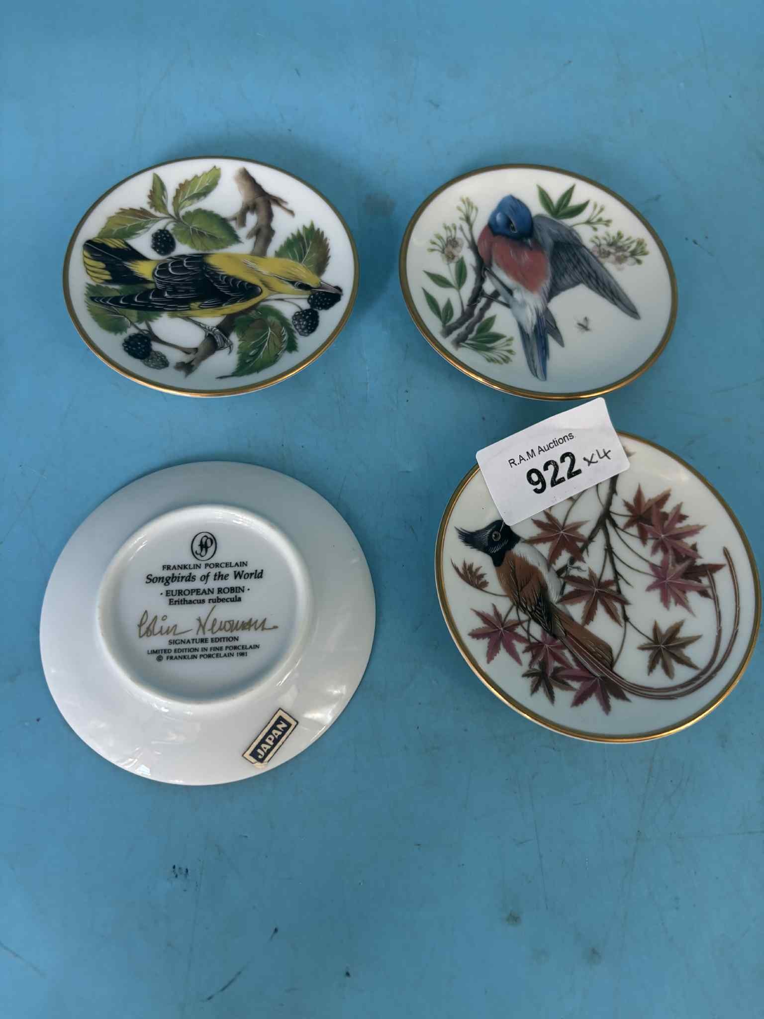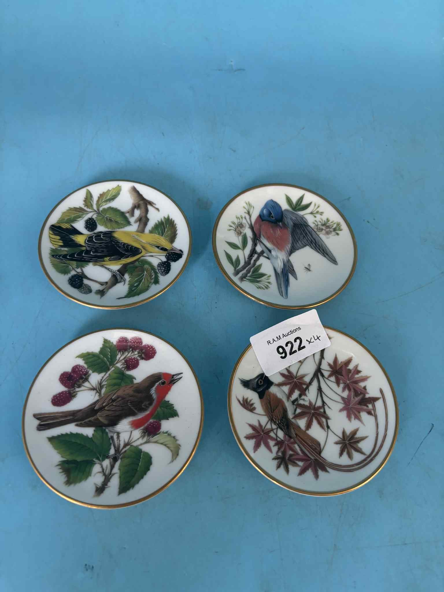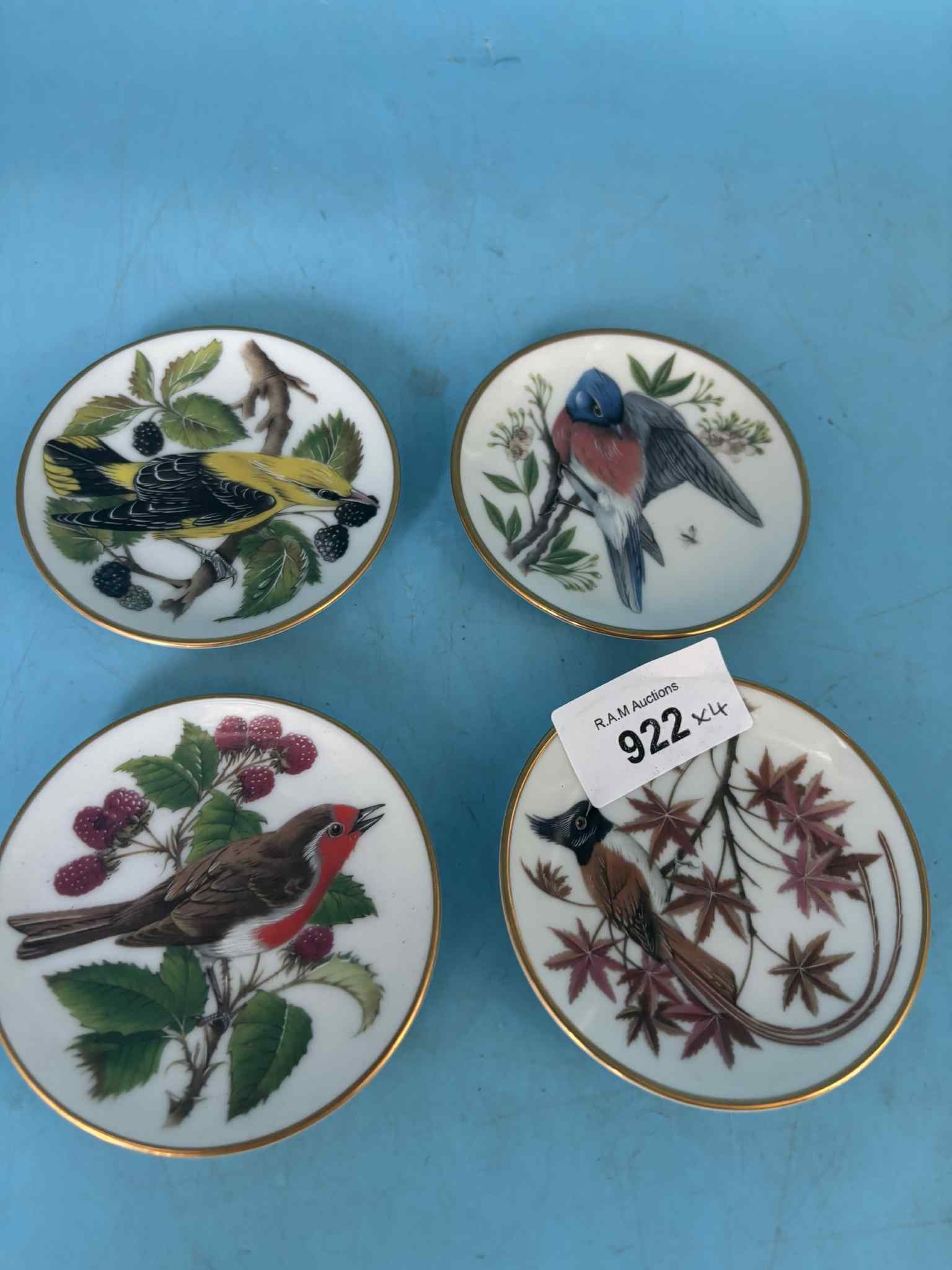 Porcelain plates featuring colorful birds and botanical motifs with gold trim.