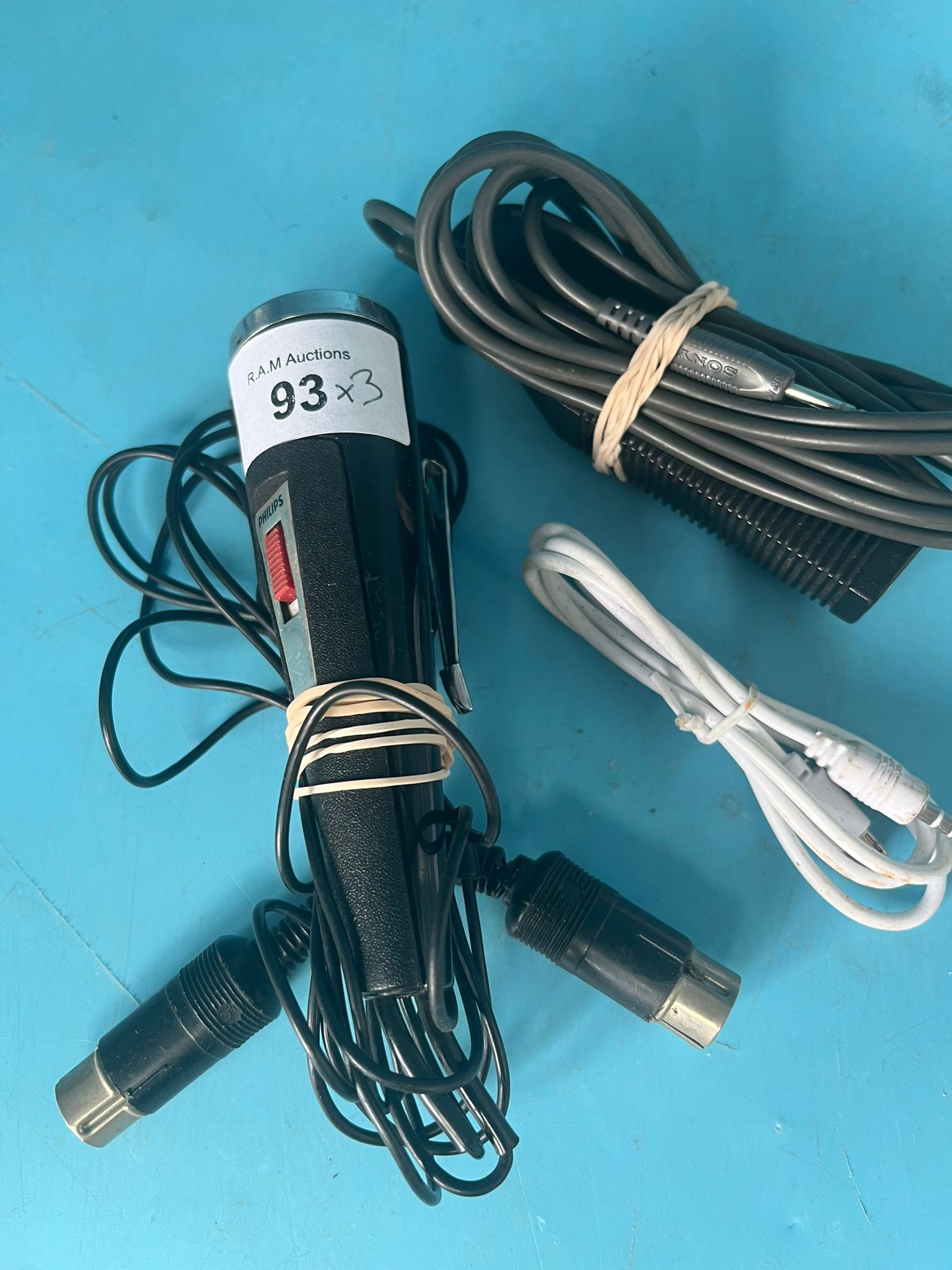 Black Philips microphone with red button and black cord with silver connector, alongside a black rectangular device with gray cord and separate white cord with white connector.