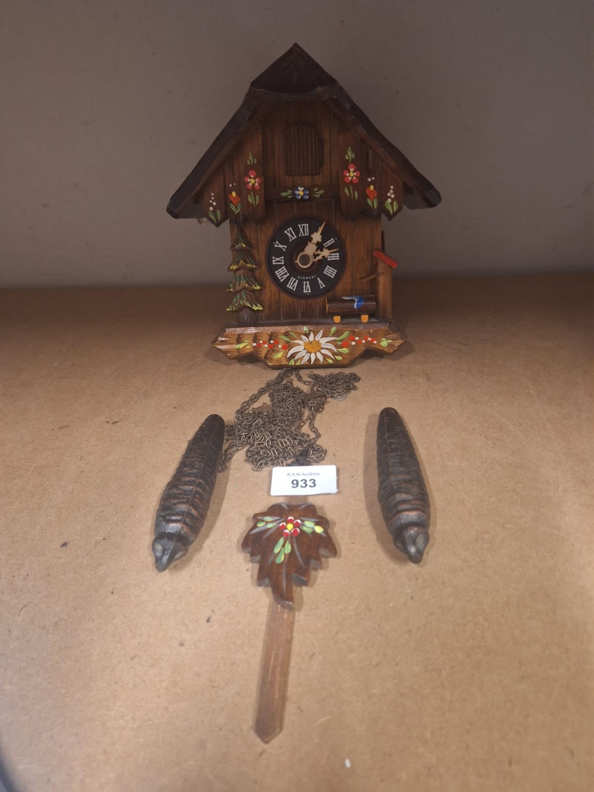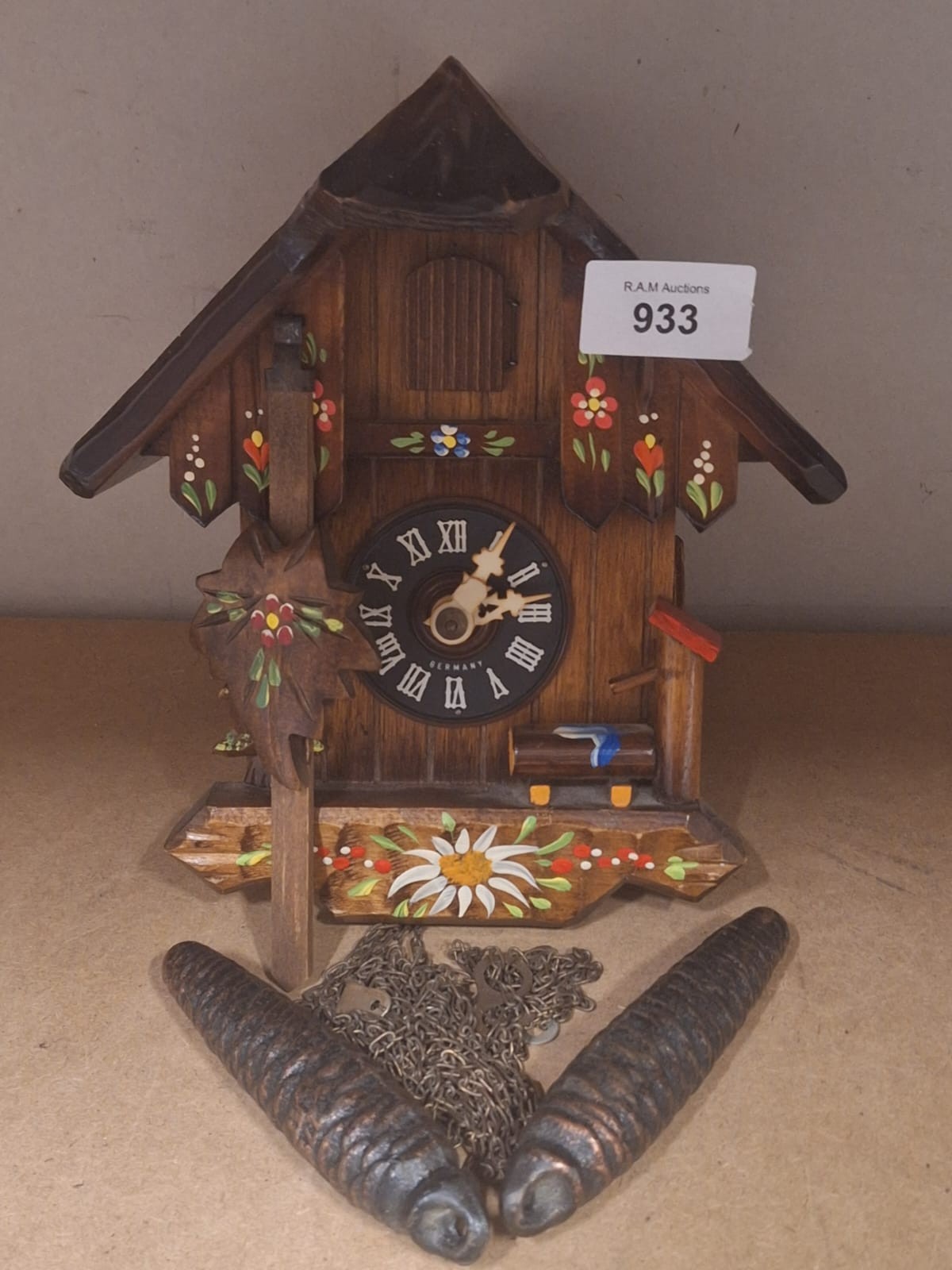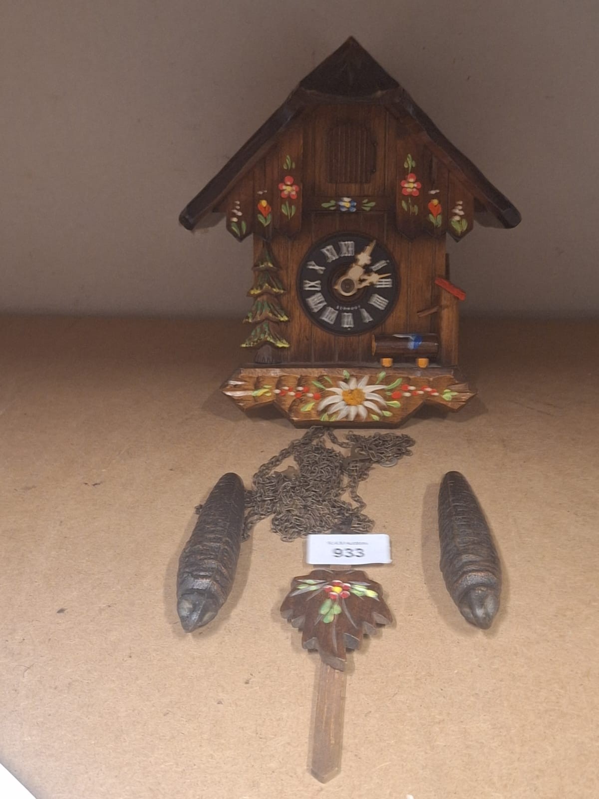 Wooden cuckoo clock with hand-painted floral decorations and Roman numerals.