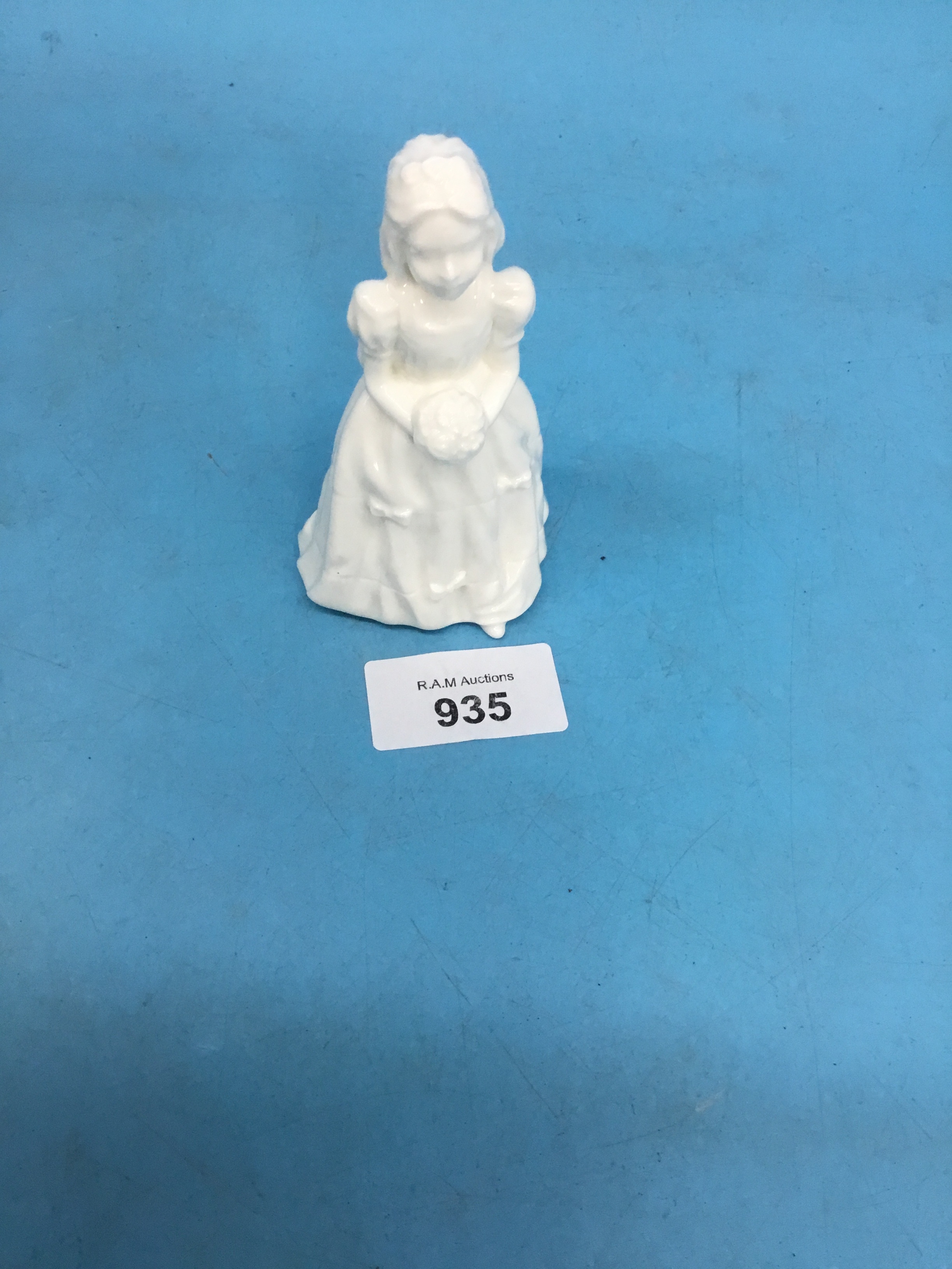 White porcelain figurine of a girl in a dress holding a bouquet.