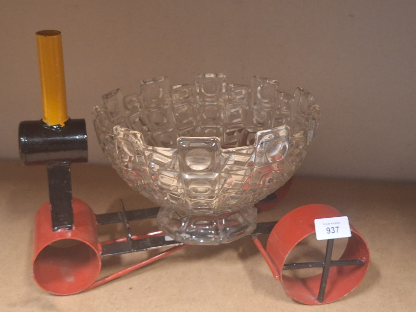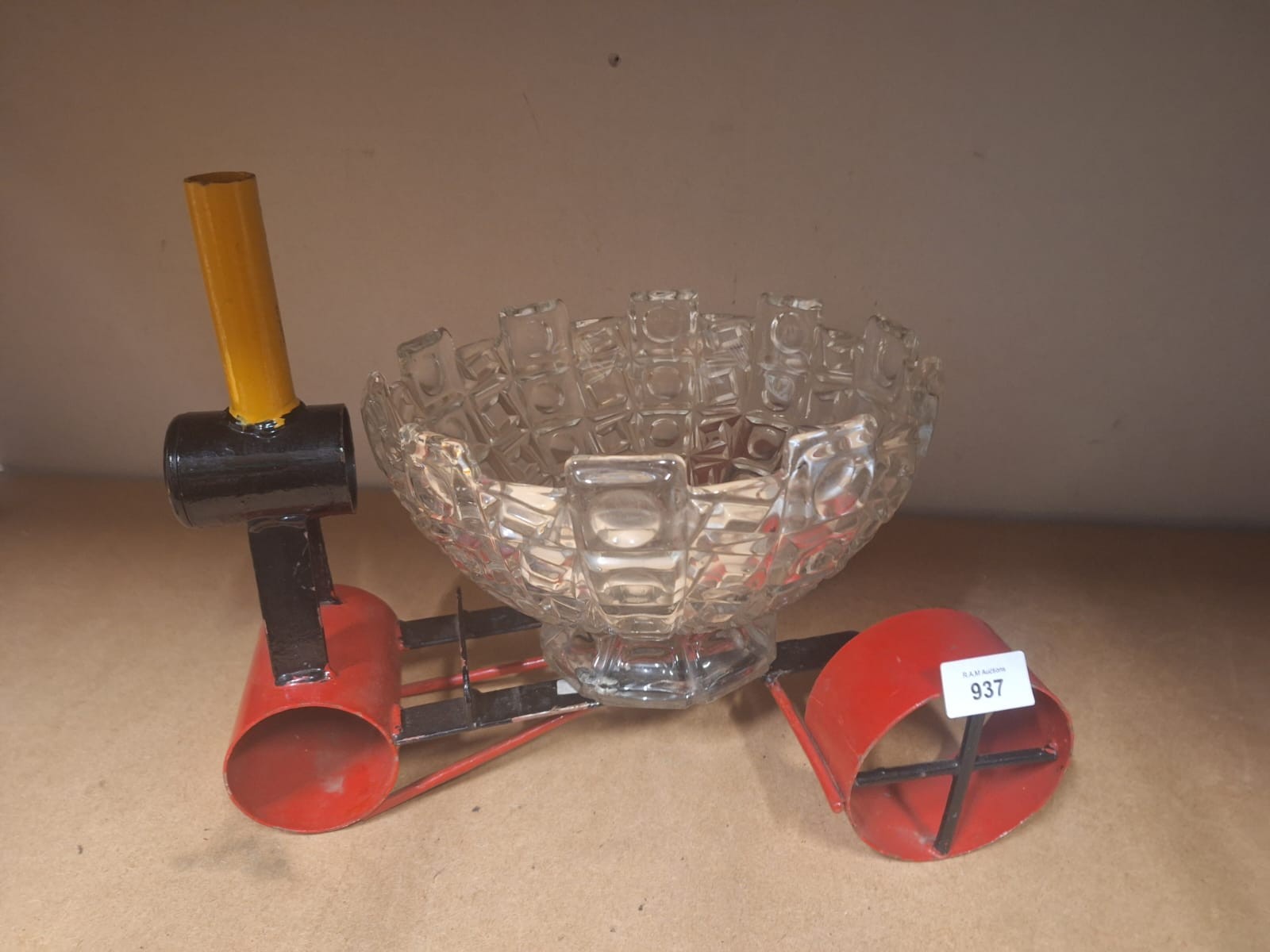 A decorative metal cart with red wheels and a clear glass bowl.