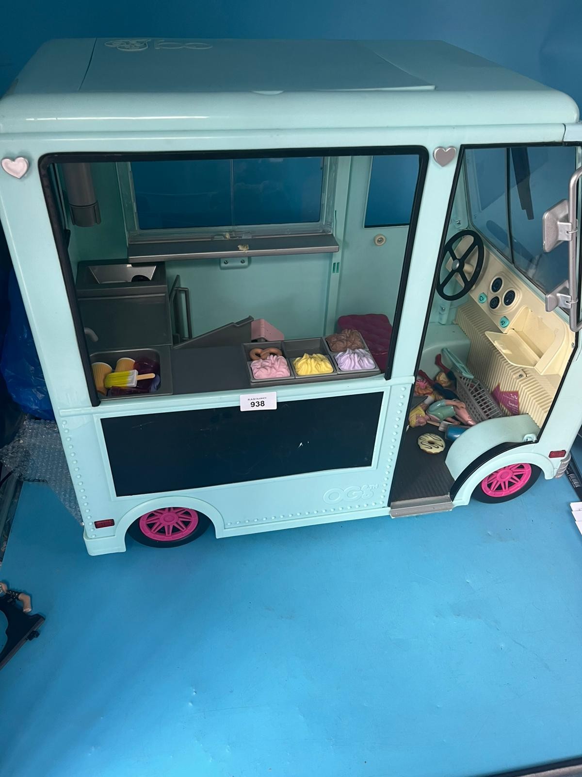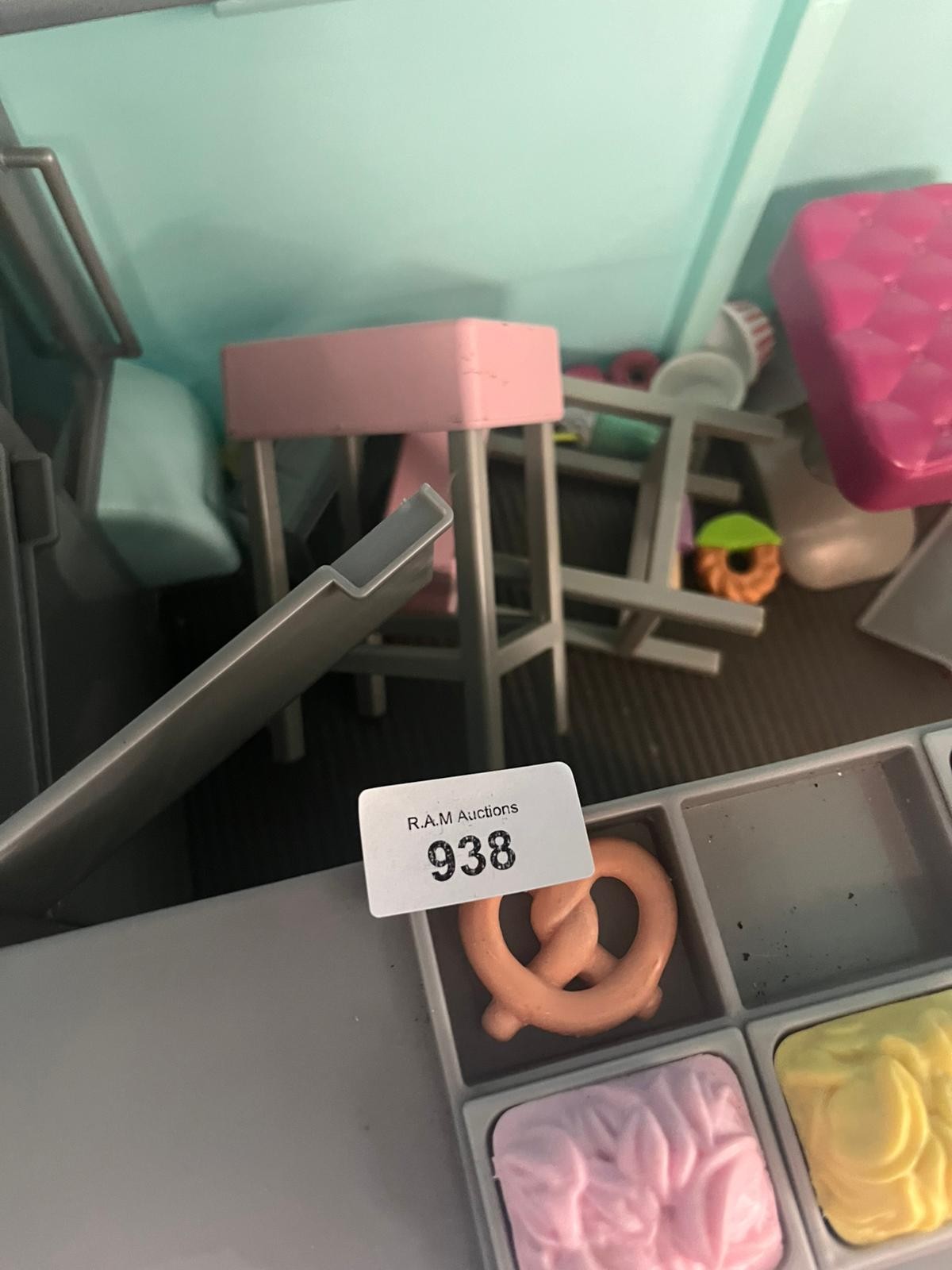 A light teal plastic ice cream truck toy featuring a chalkboard sign, pink wheels, heart details, and an interior with various plastic food items and stools.