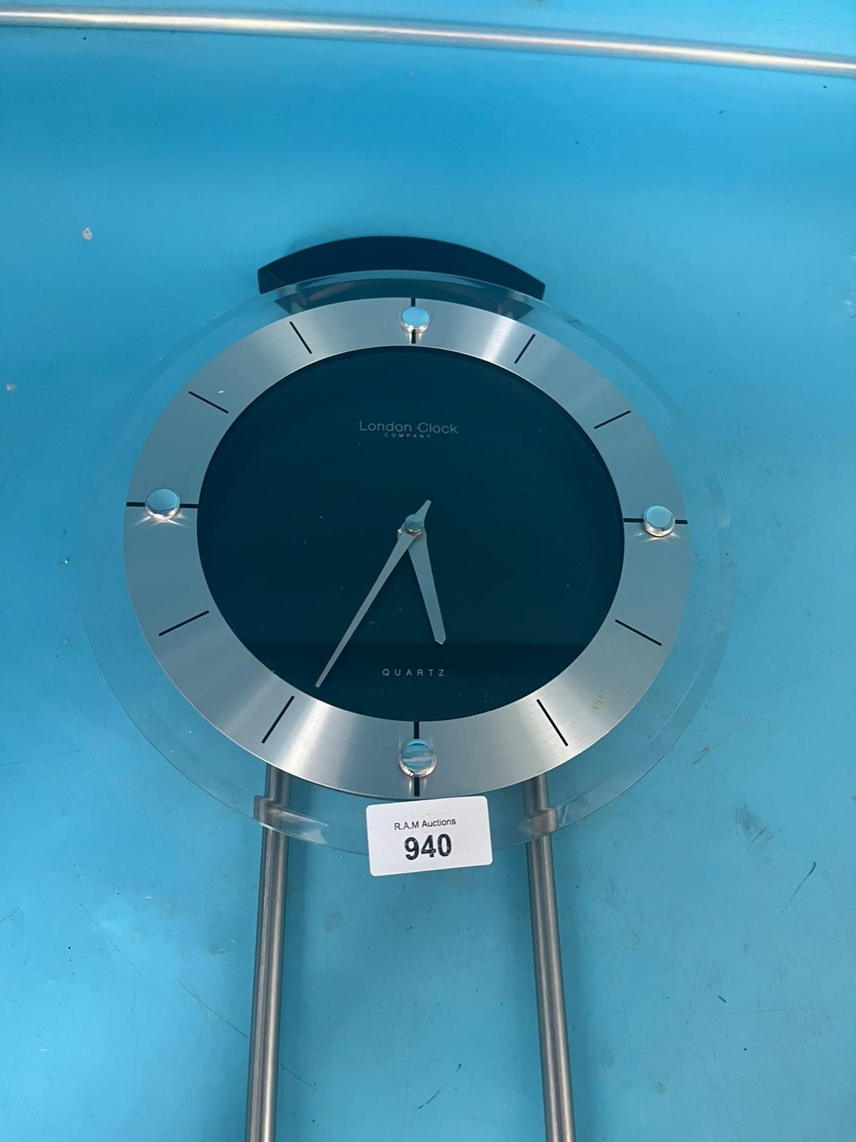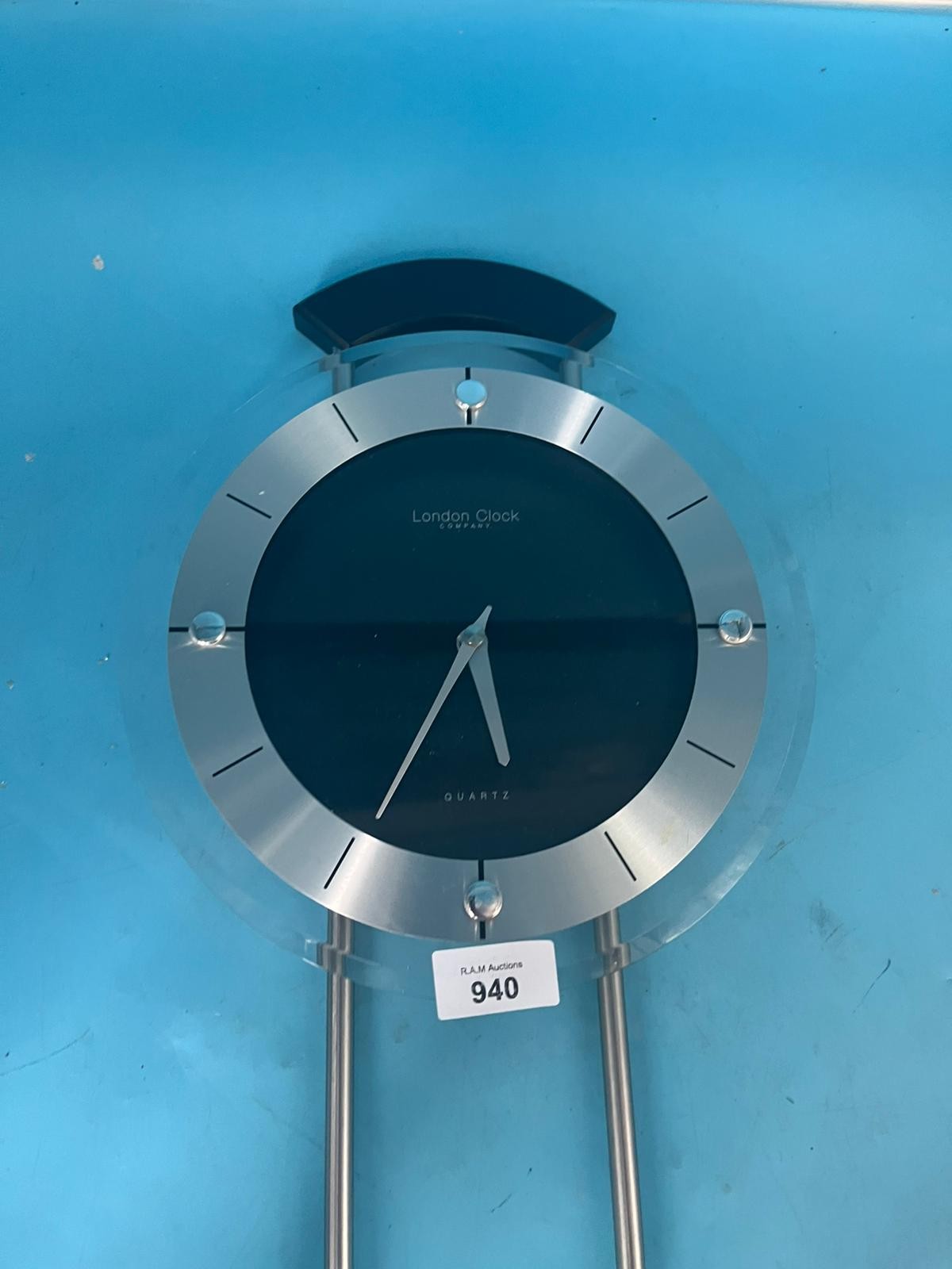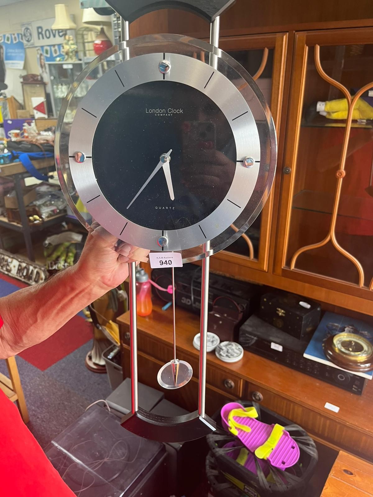 Modern silver-toned pendulum clock with a black face and silver hour markers.