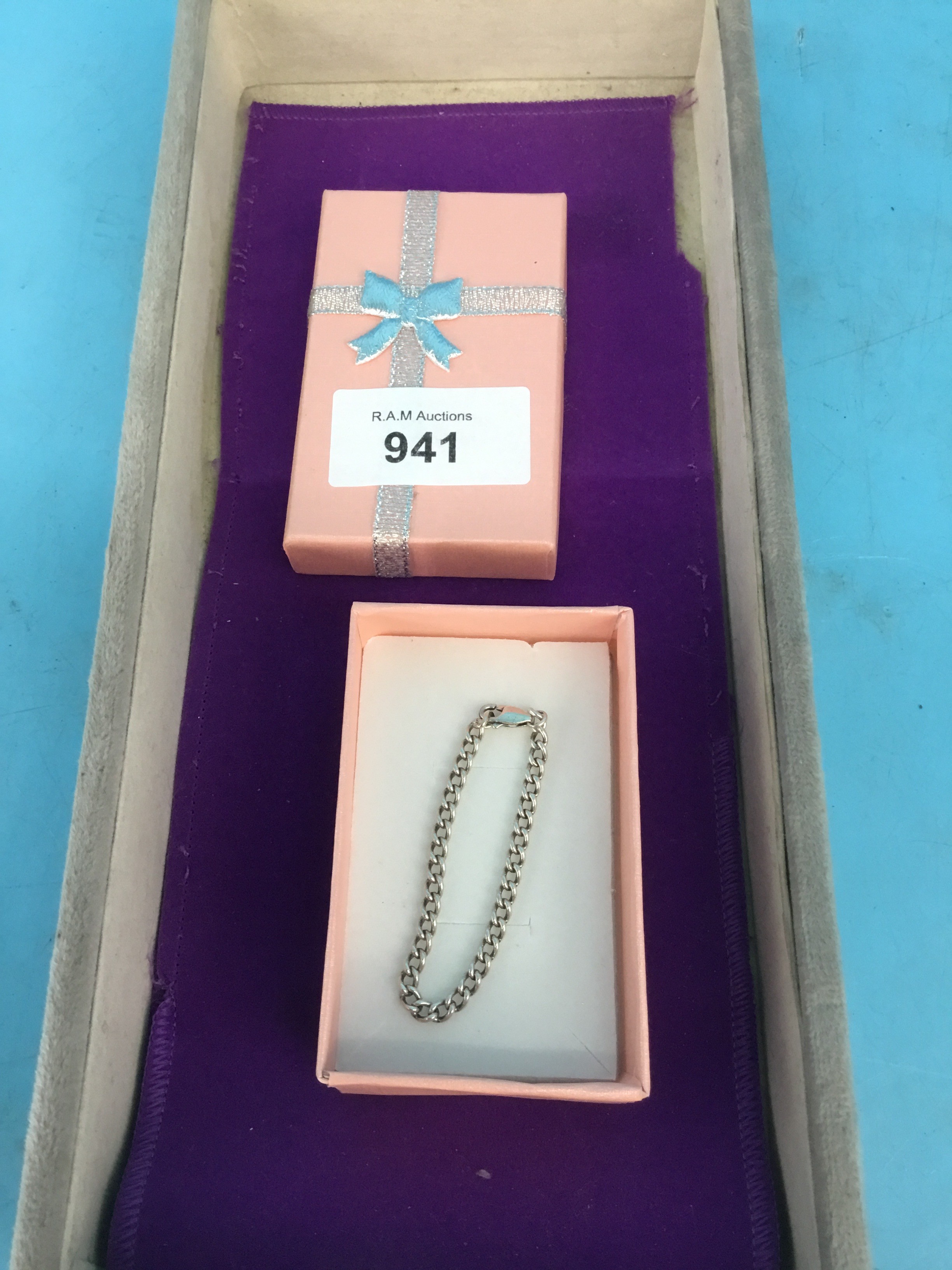 A silver-toned metal curb chain bracelet presented in a light pink box with decorative ribbon and bow.