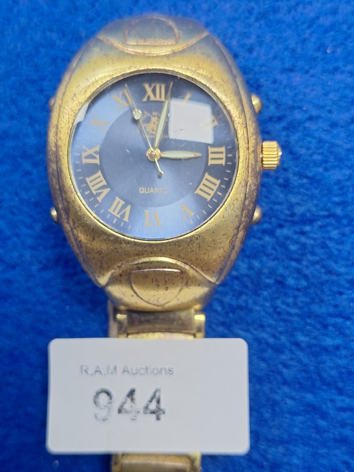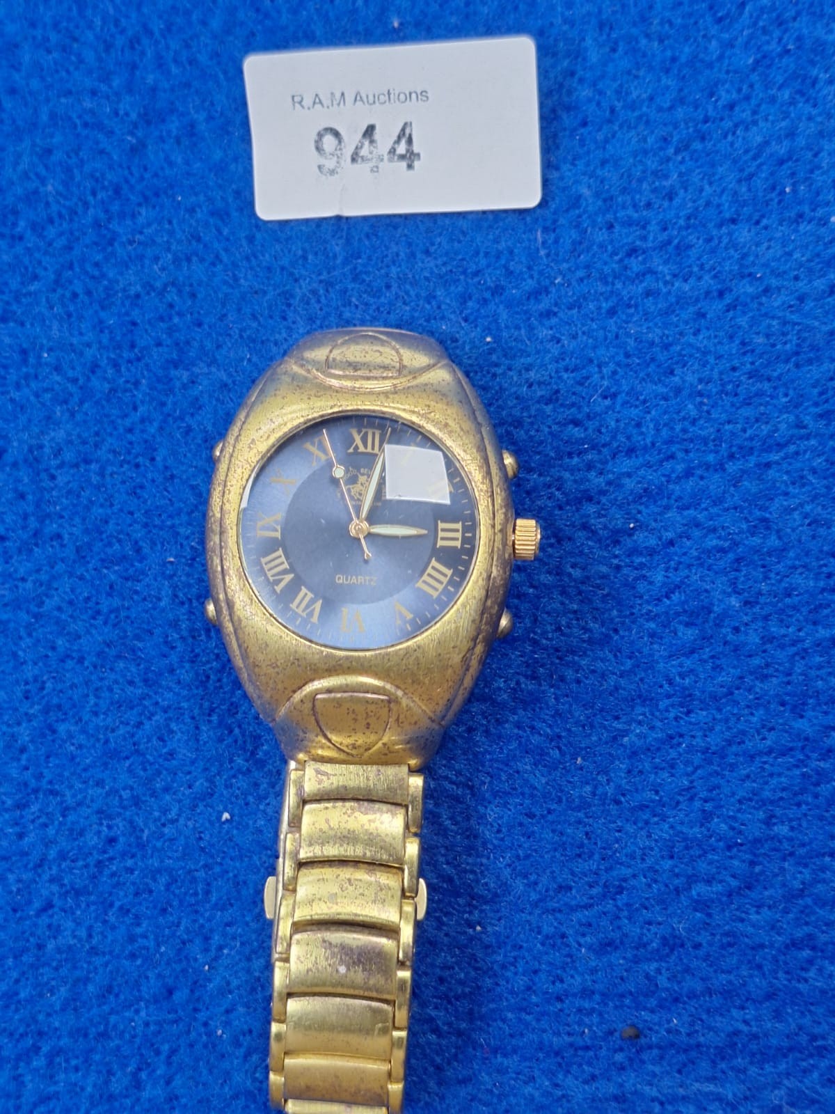 Gold-toned metal wristwatch with a dark blue face, Roman numerals, and a bracelet band.