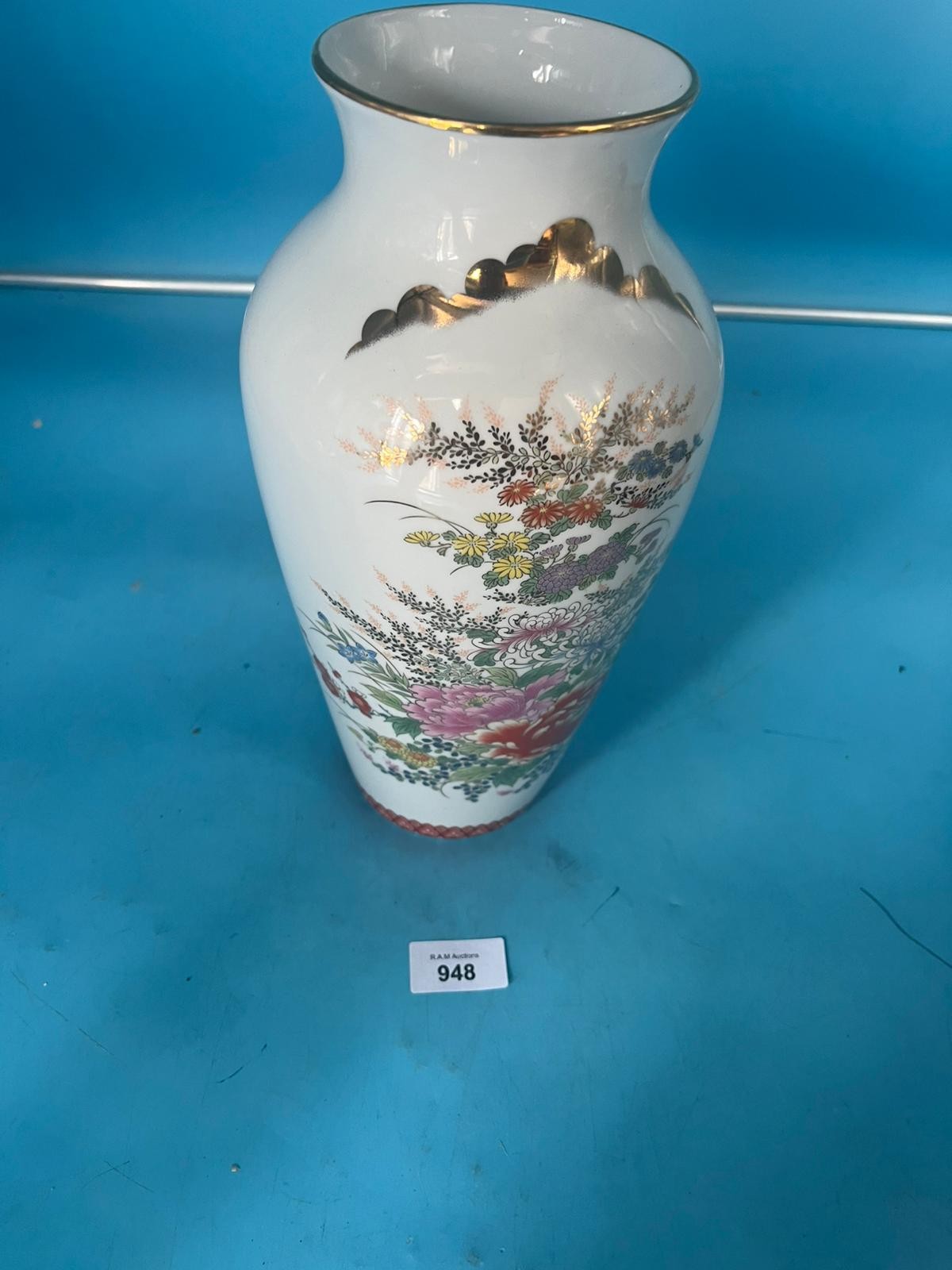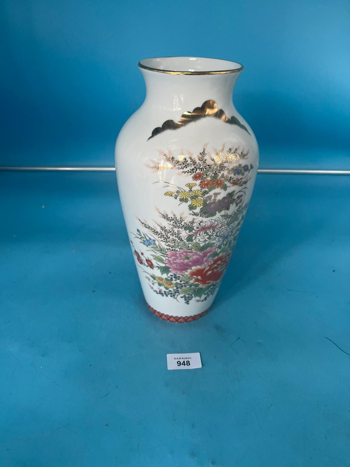 Ovular porcelain vase with a cream base, featuring a pink, red, yellow, purple, and green floral design with gold accents and a gold-rimmed flared top.