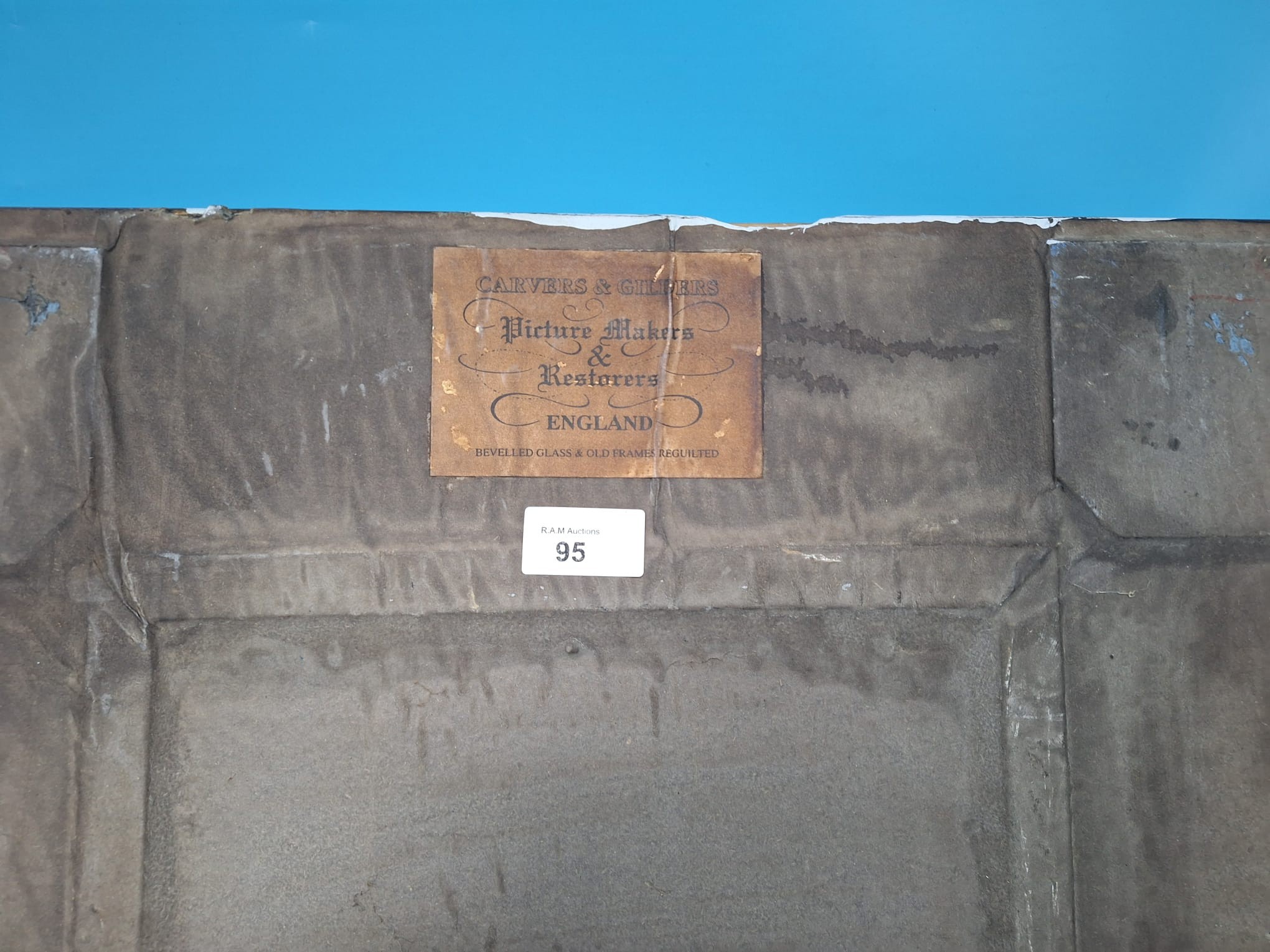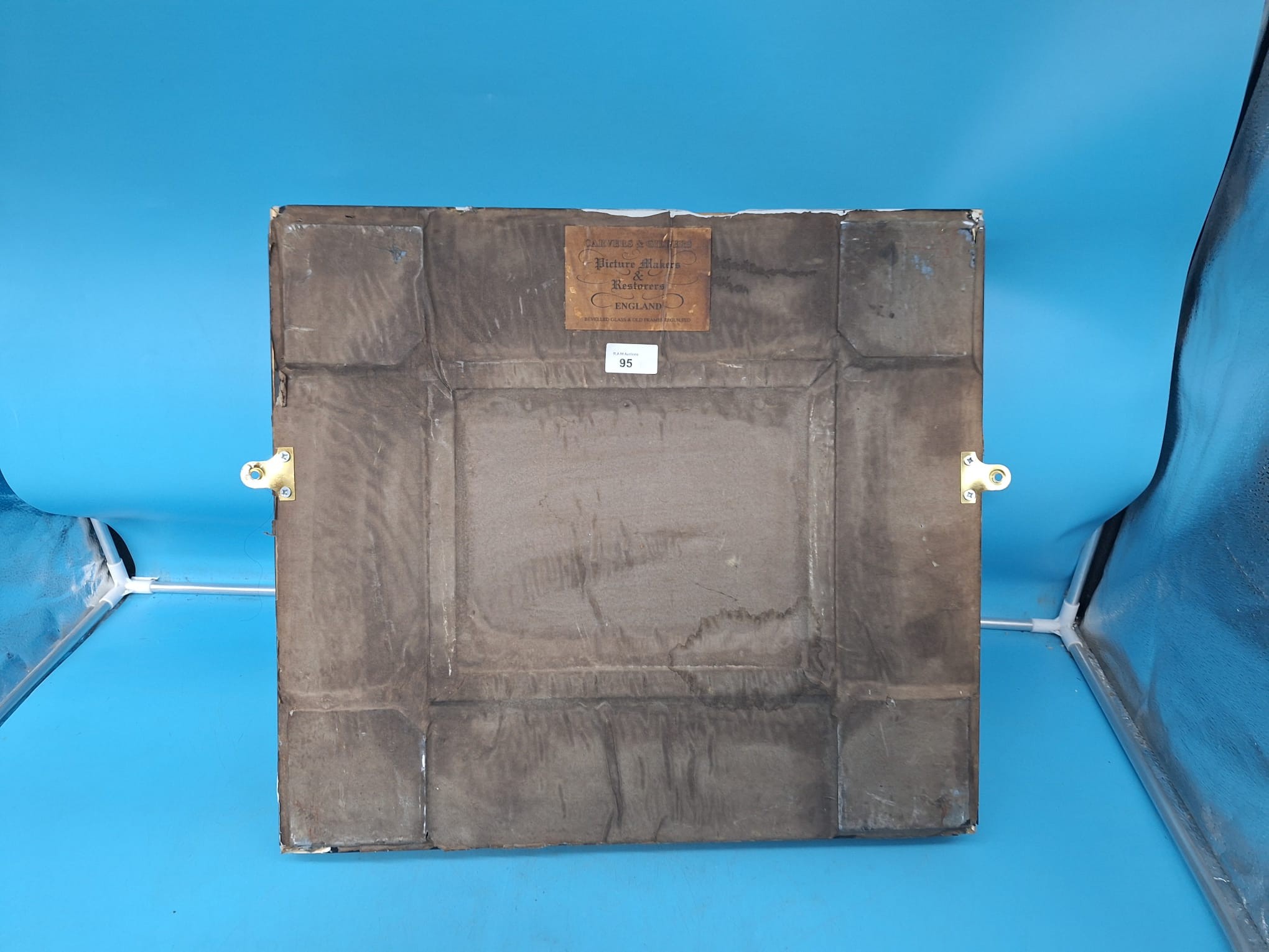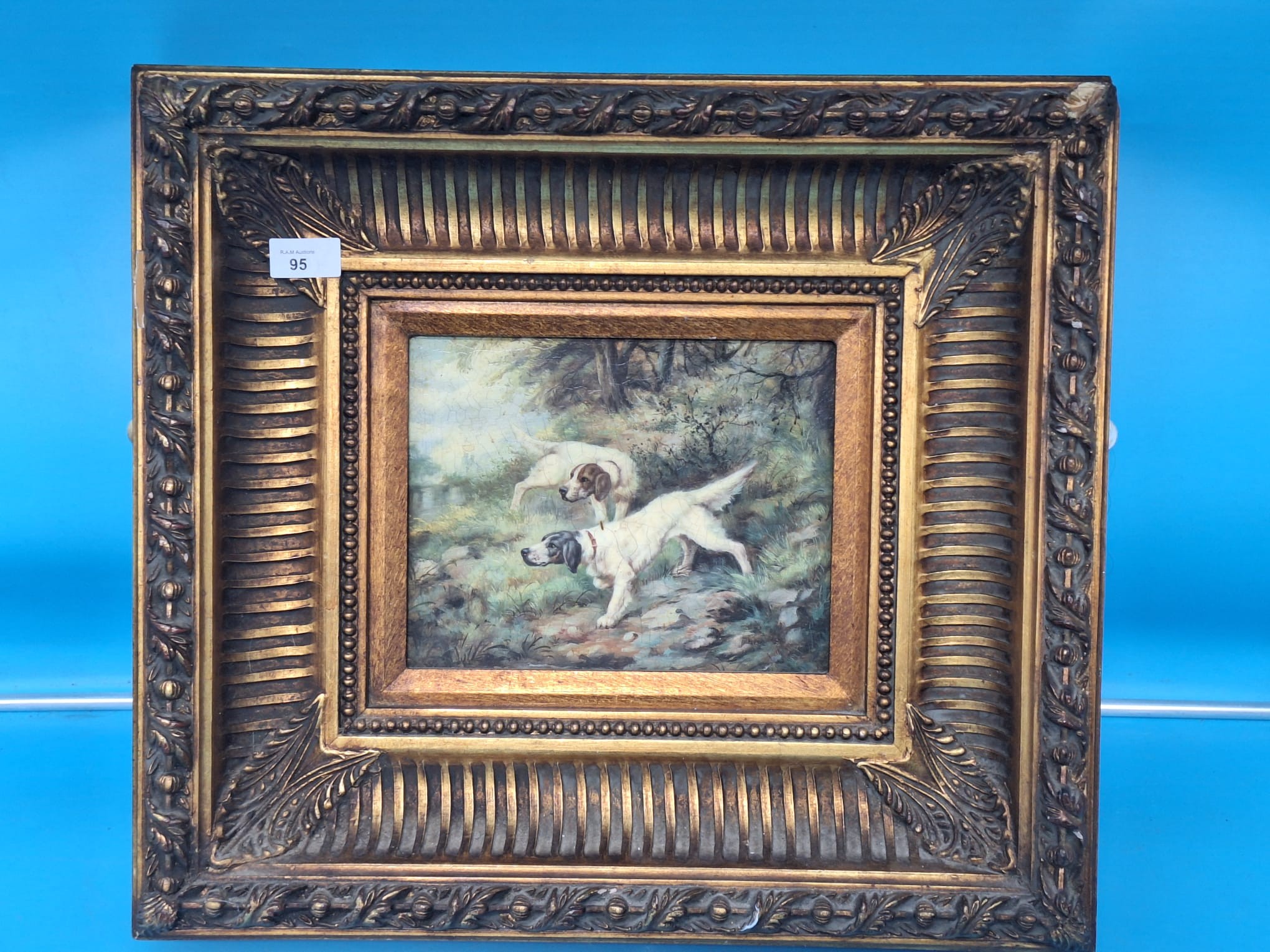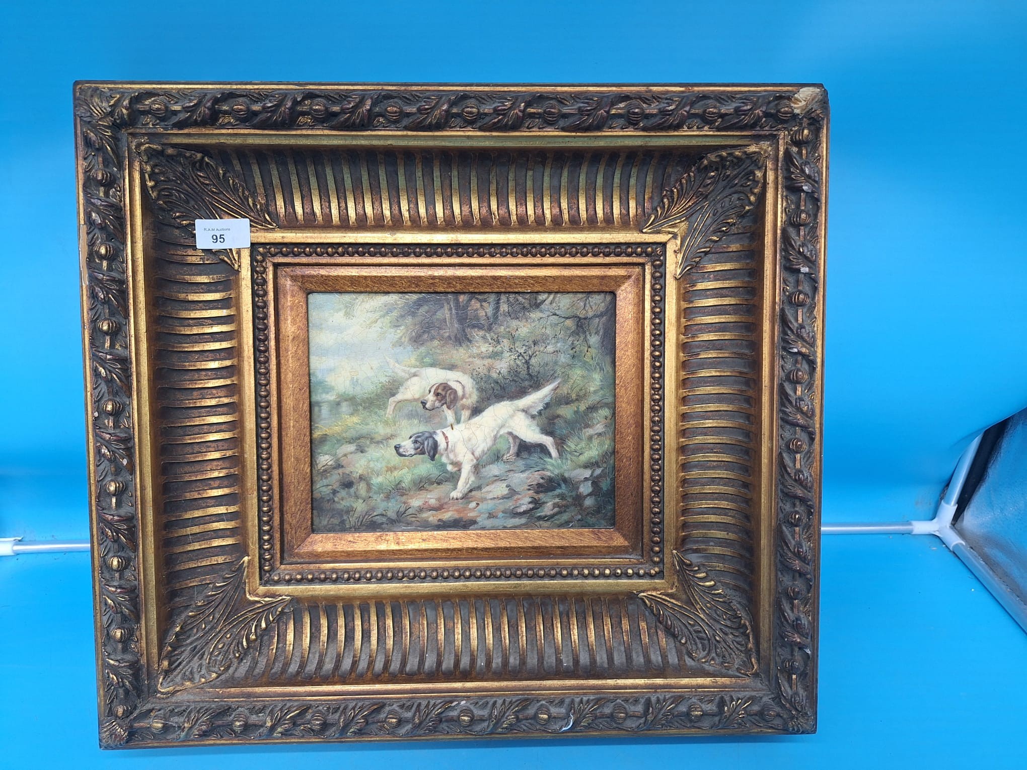 Framed oil painting of hunting dogs in a woodland setting with an ornate gold frame.