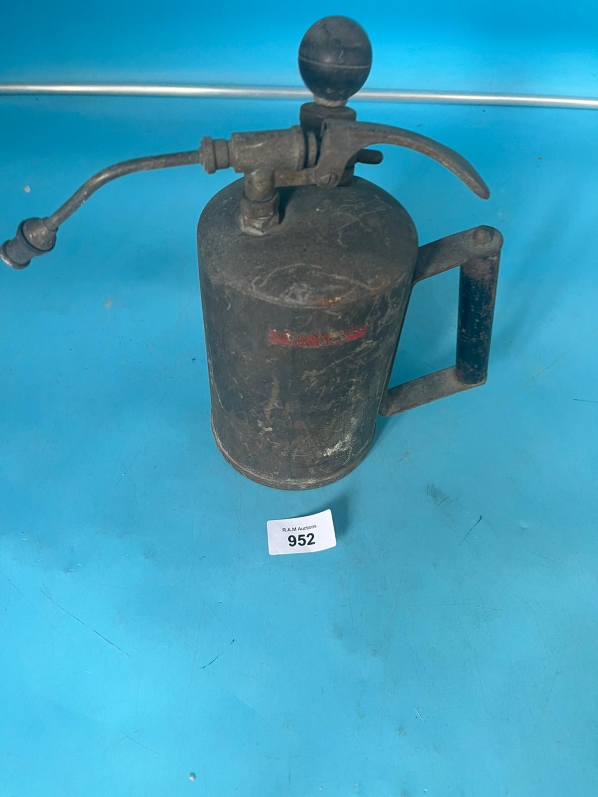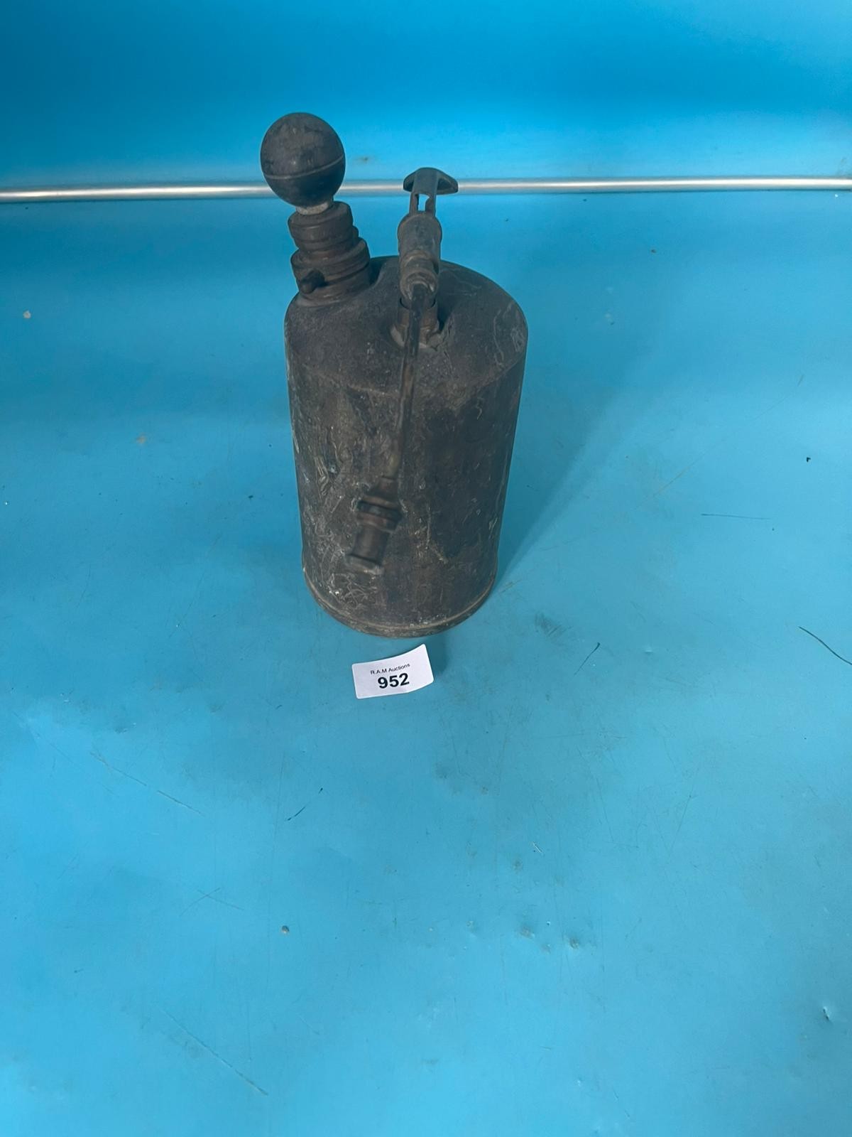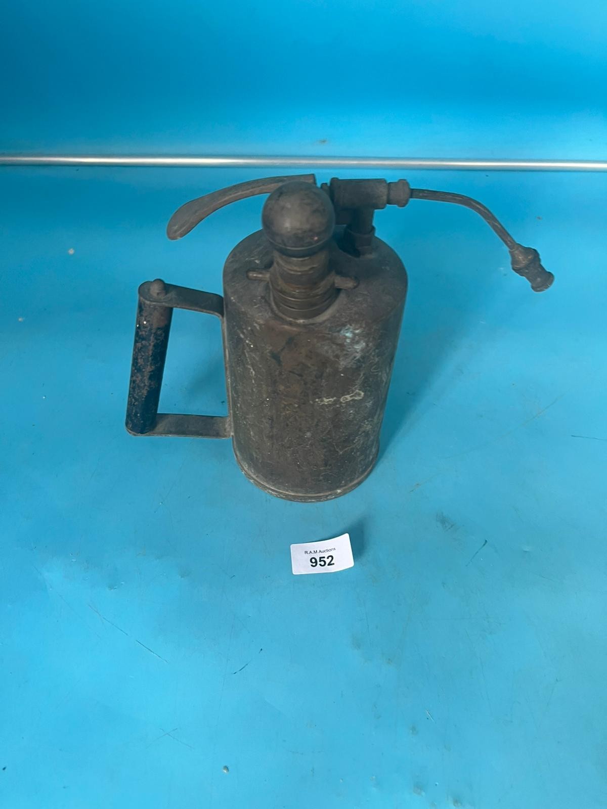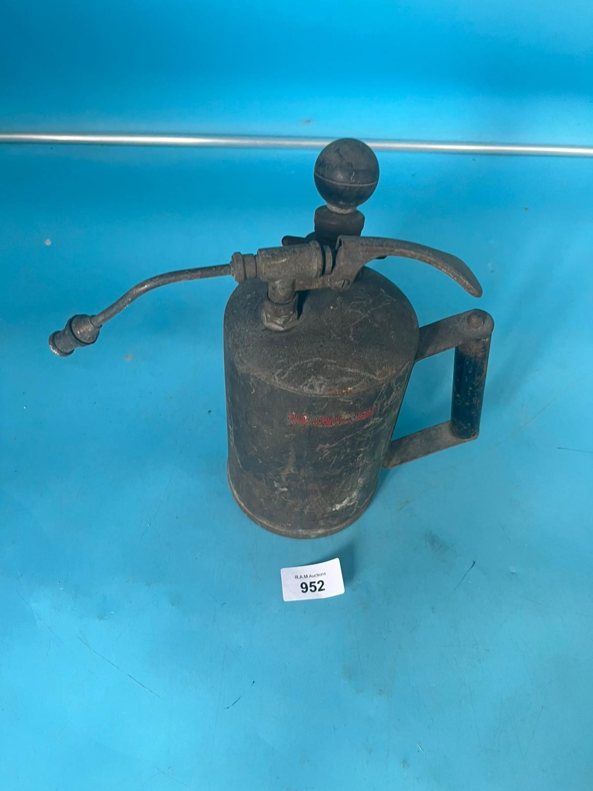 Antique hand-operated sprayer with a dark metal body, a ball on top, a lever, a side nozzle, and a side handle.