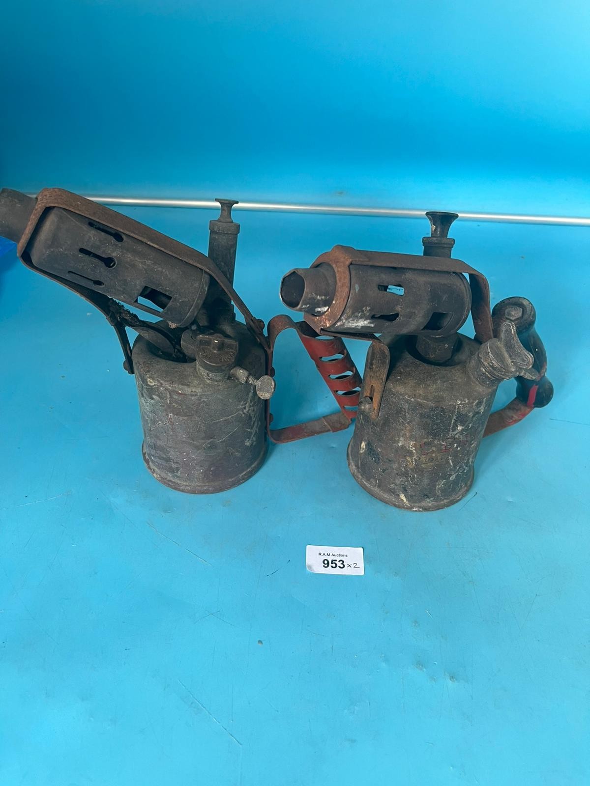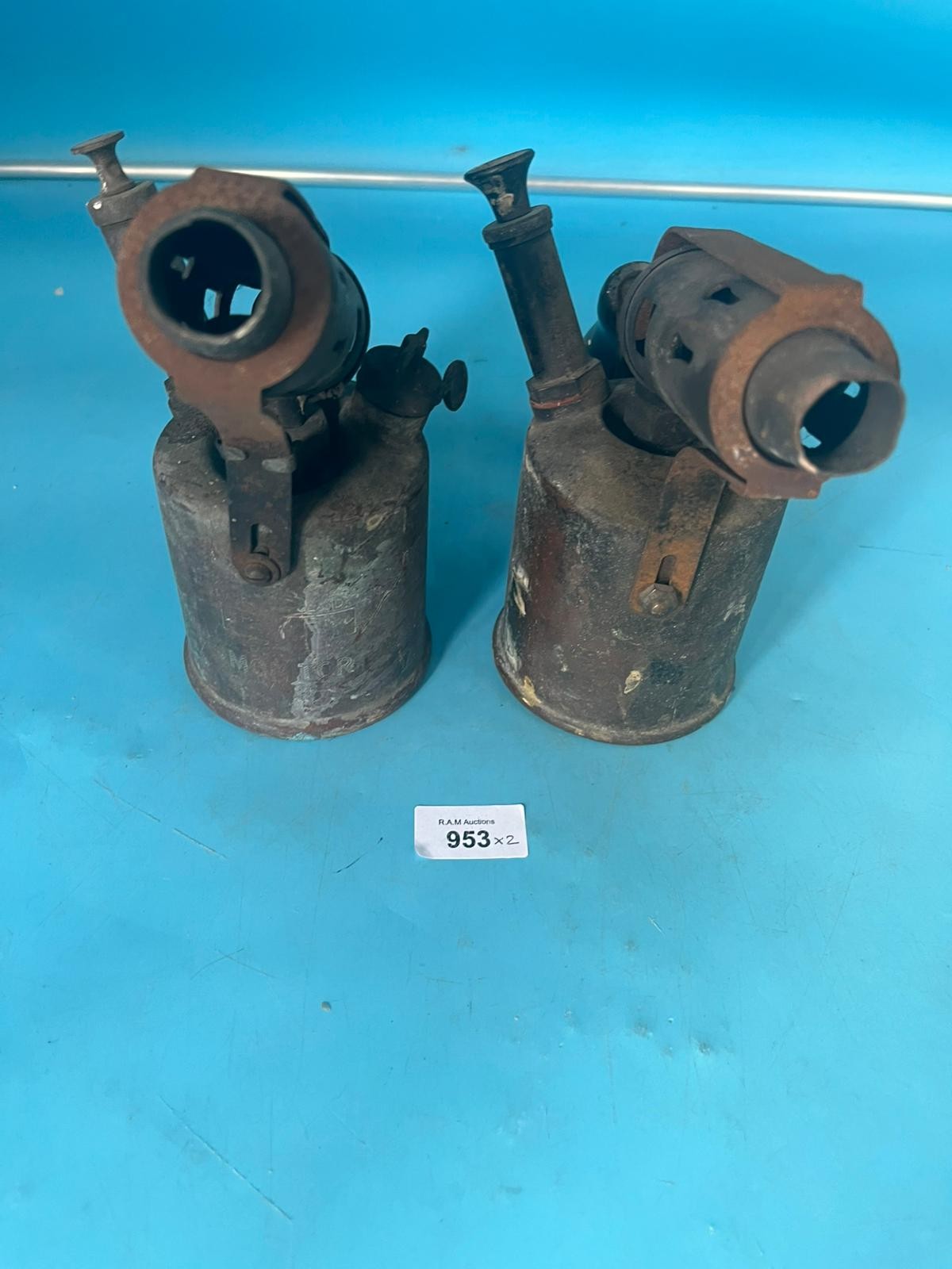 Two vintage blowtorches with metallic bodies and varying signs of wear.