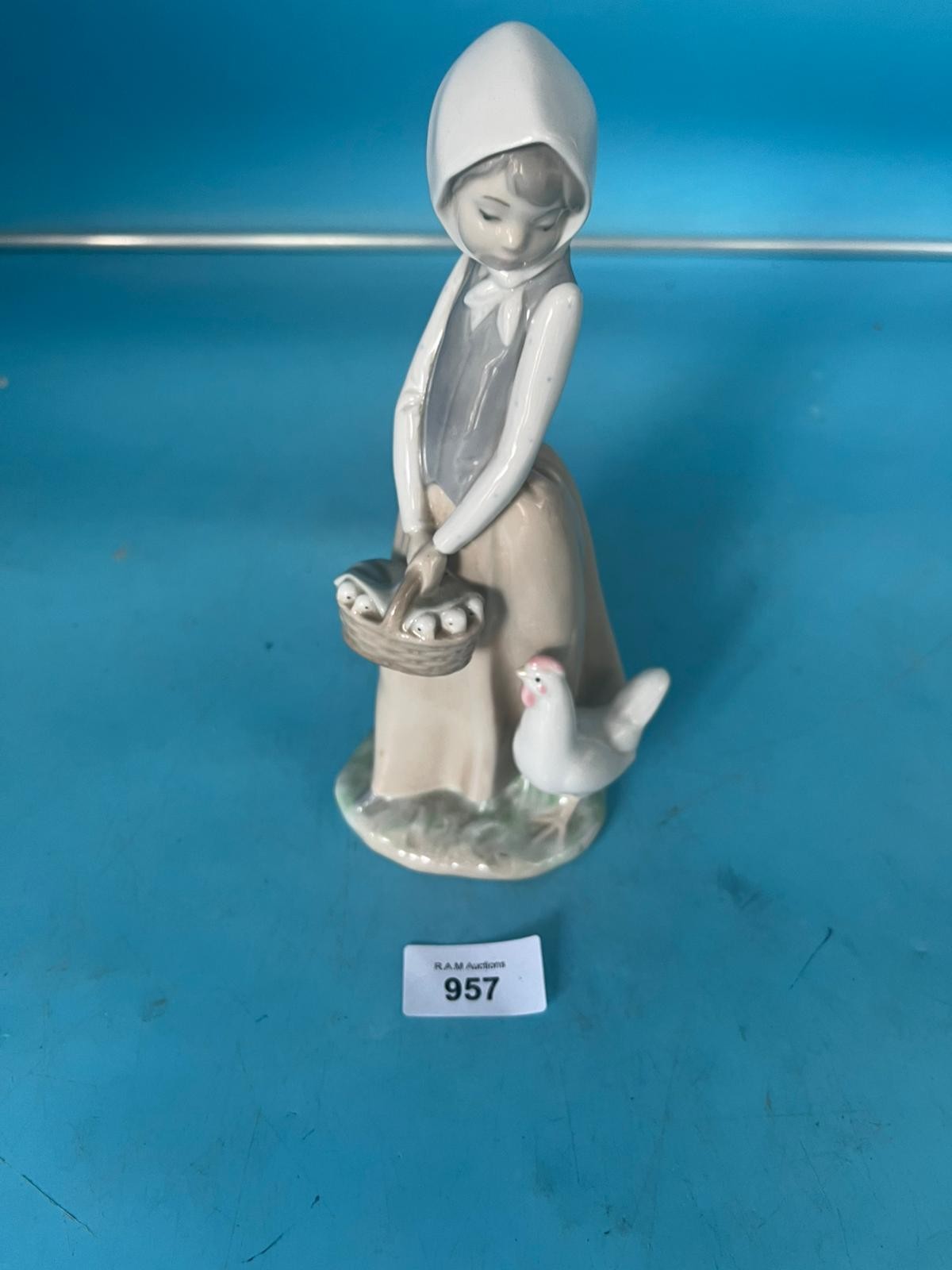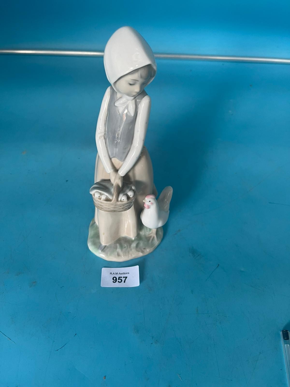 Porcelain figurine of a girl in a hooded cloak holding a basket with a chicken beside her.