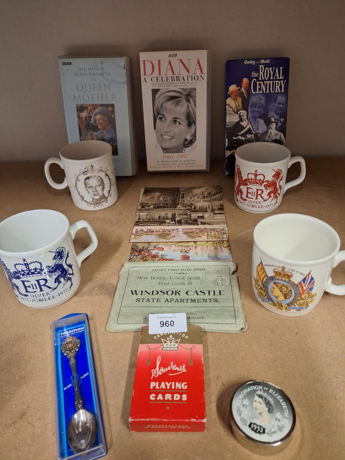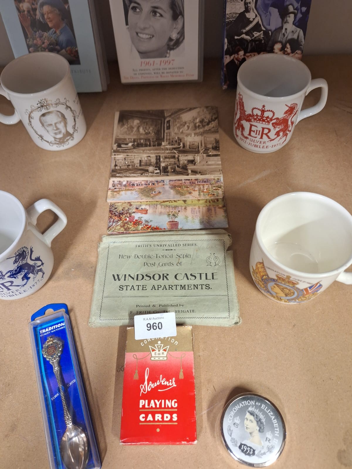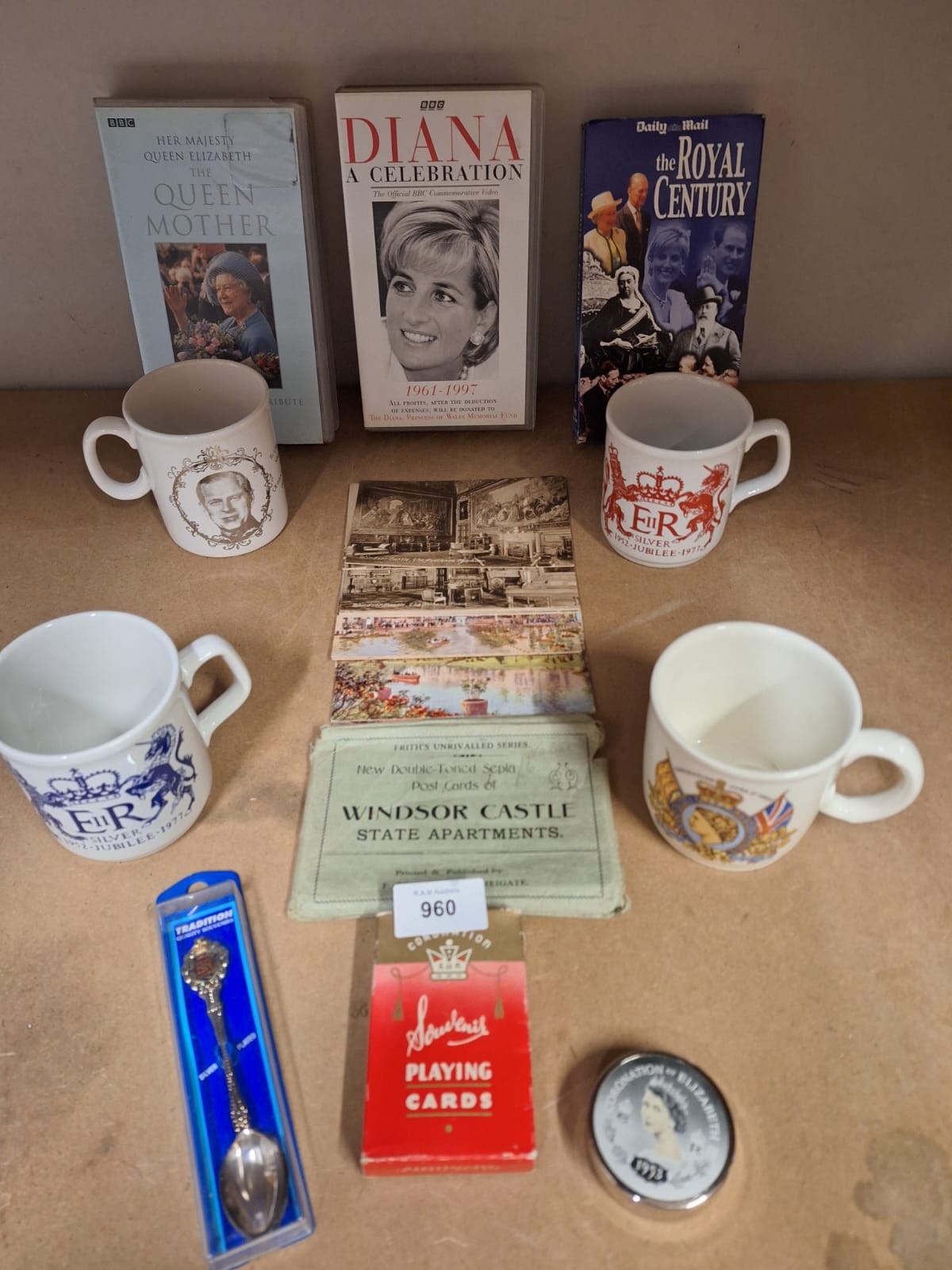 Collection of royal memorabilia including mugs, VHS tapes, books, postcards, a souvenir spoon, playing cards, and a coronation tin.