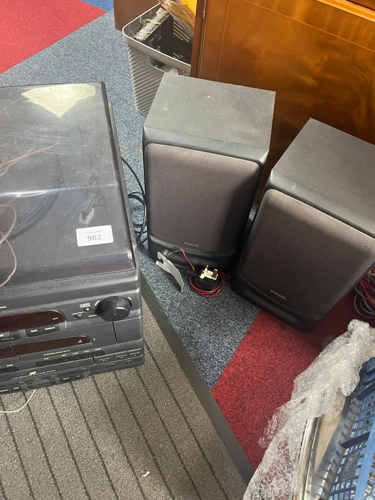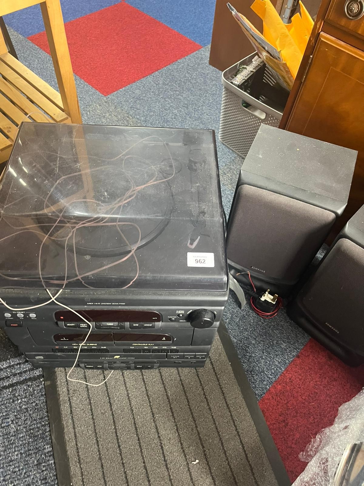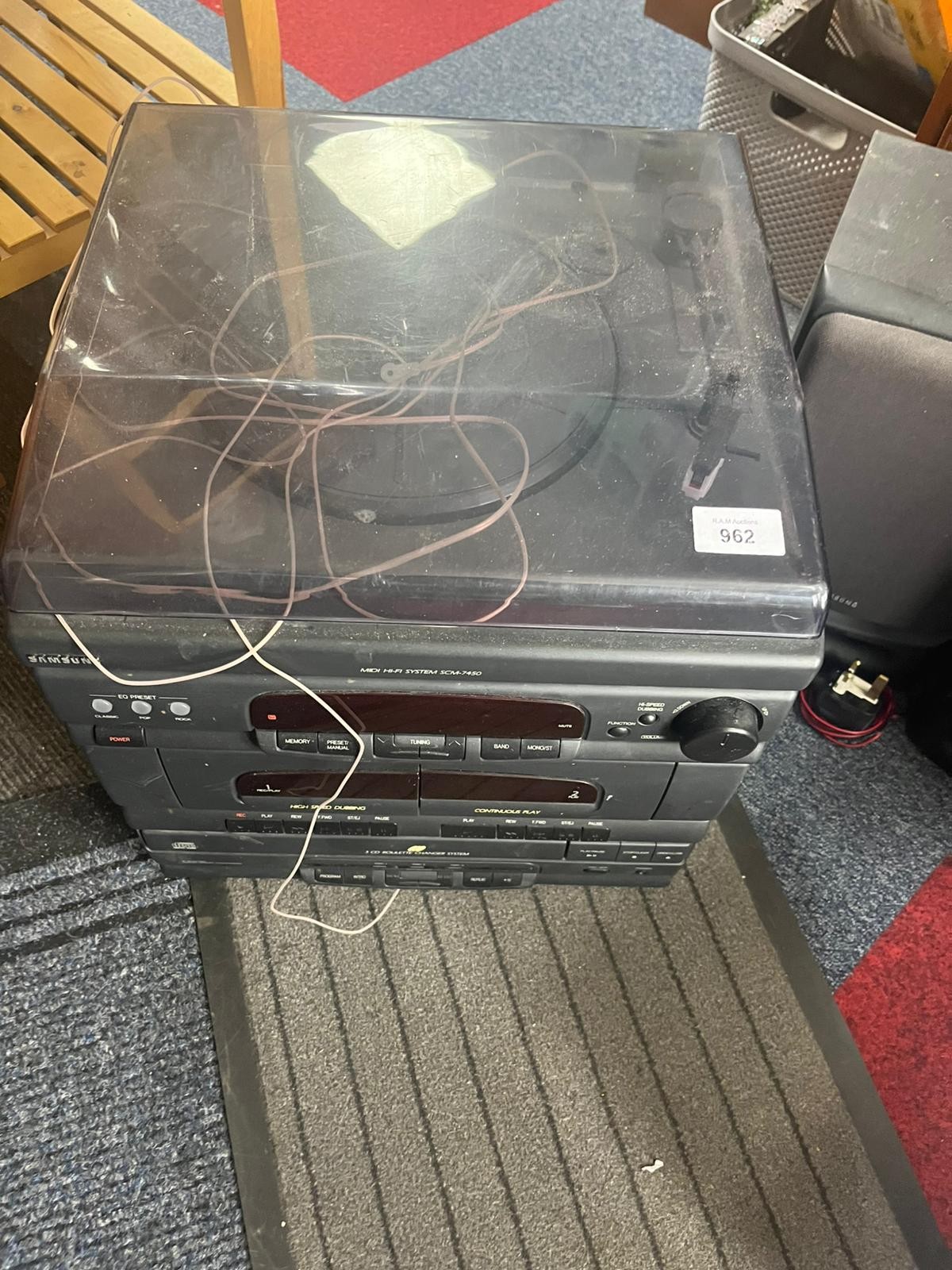 Samsung three-piece stereo system with turntable, cassette, CD player, and two speakers.