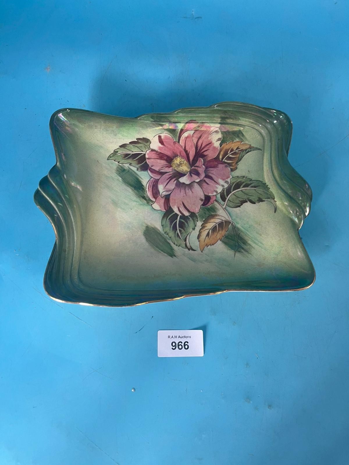 Rectangular ceramic tray with a floral design and gold trim.