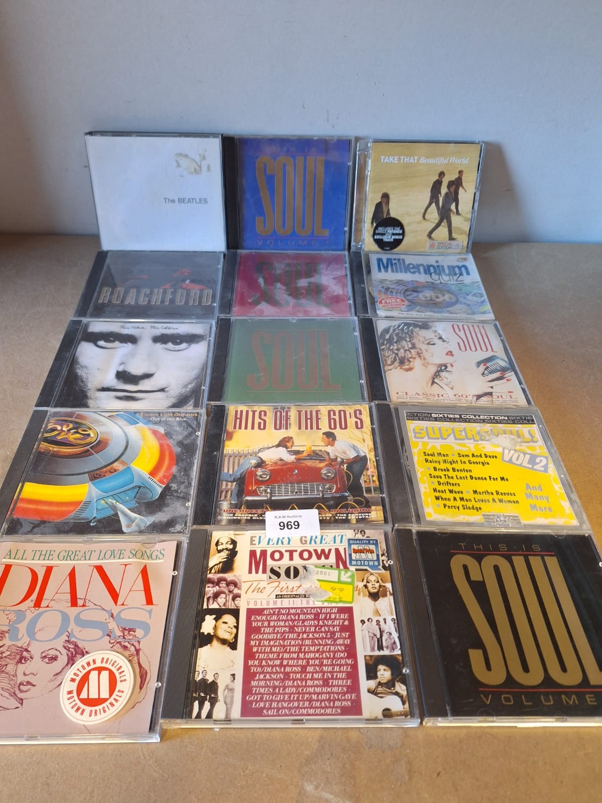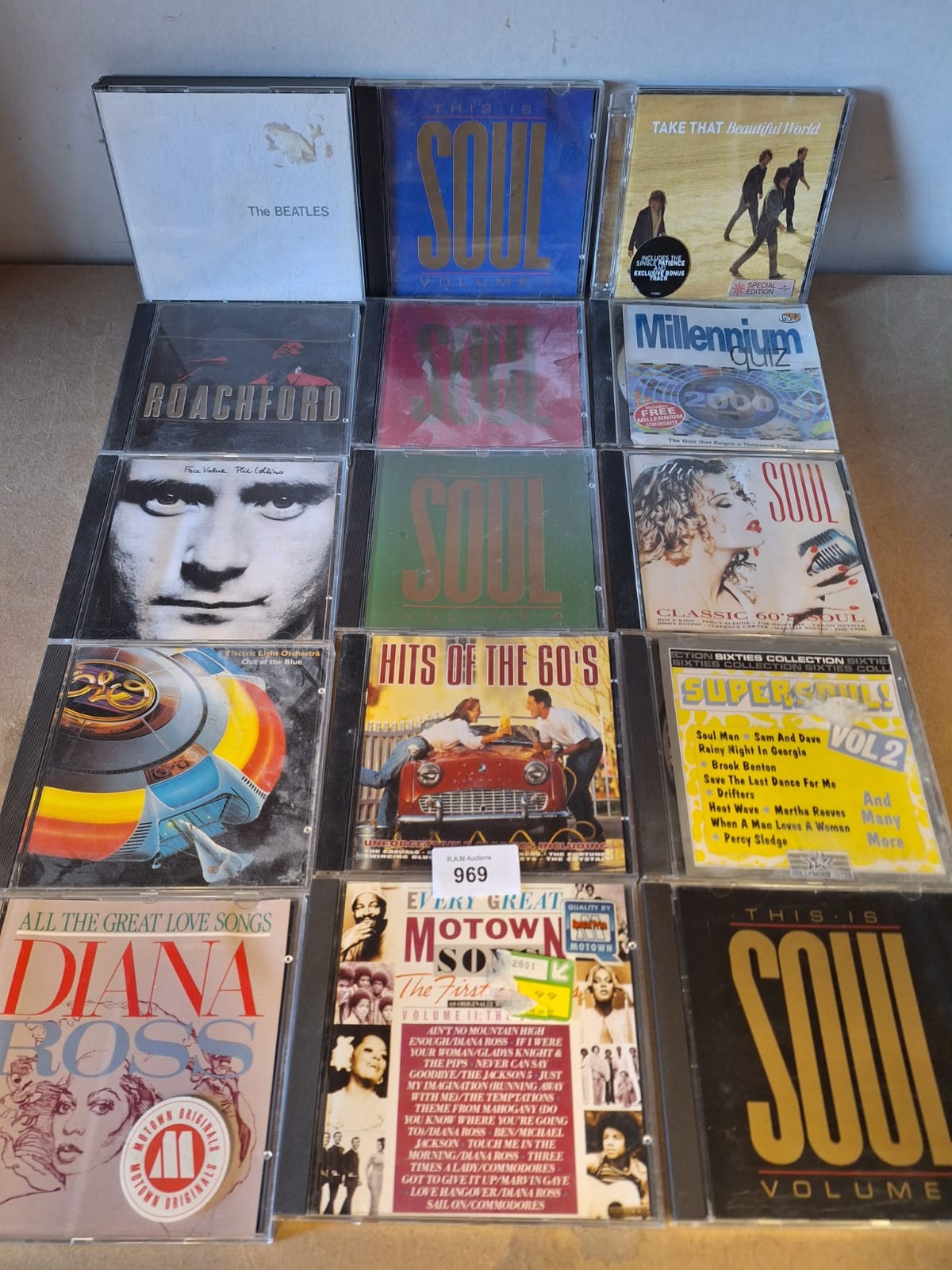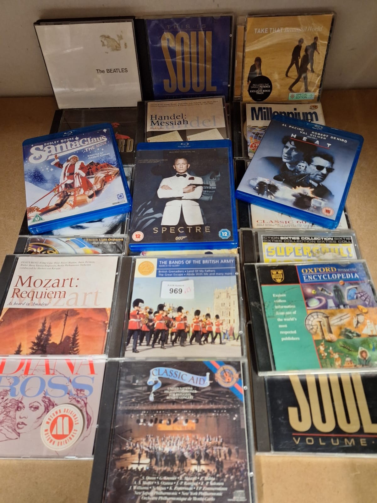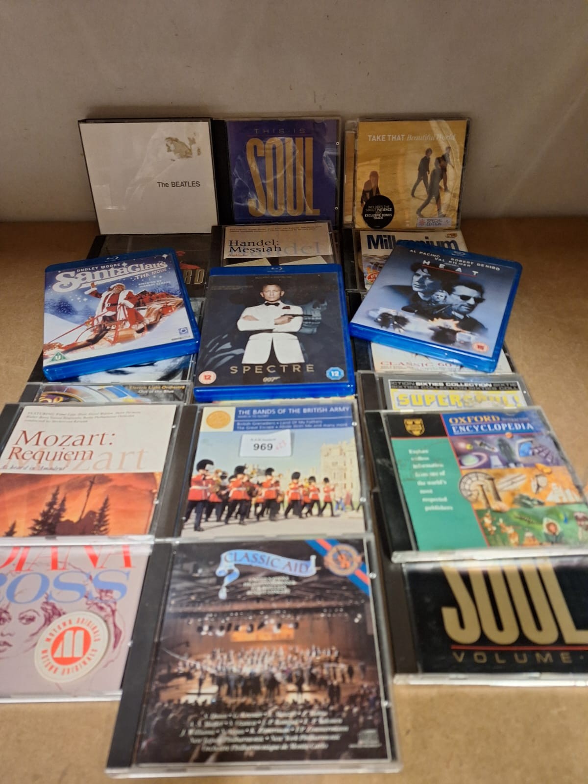 A collection of audio and video media including CDs, VHS tapes, and DVDs/Blu-rays, along with one CD-ROM.