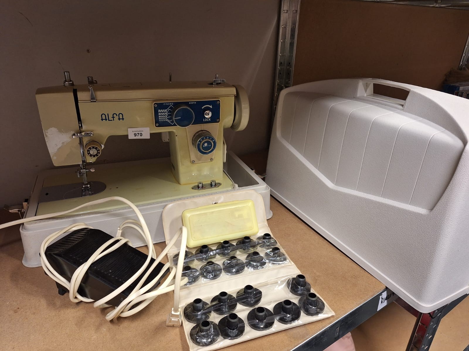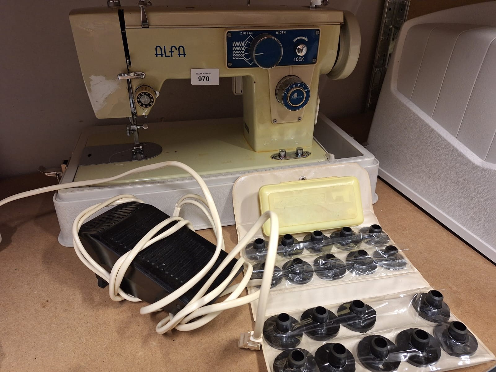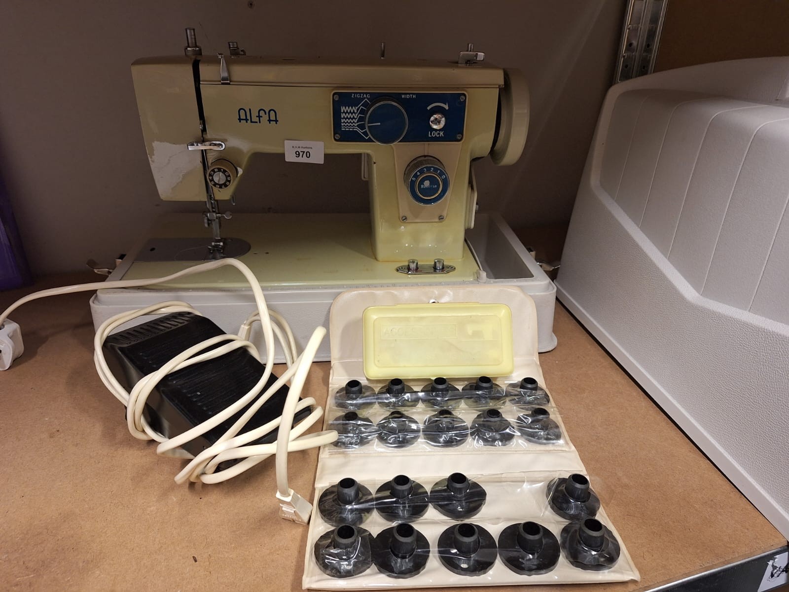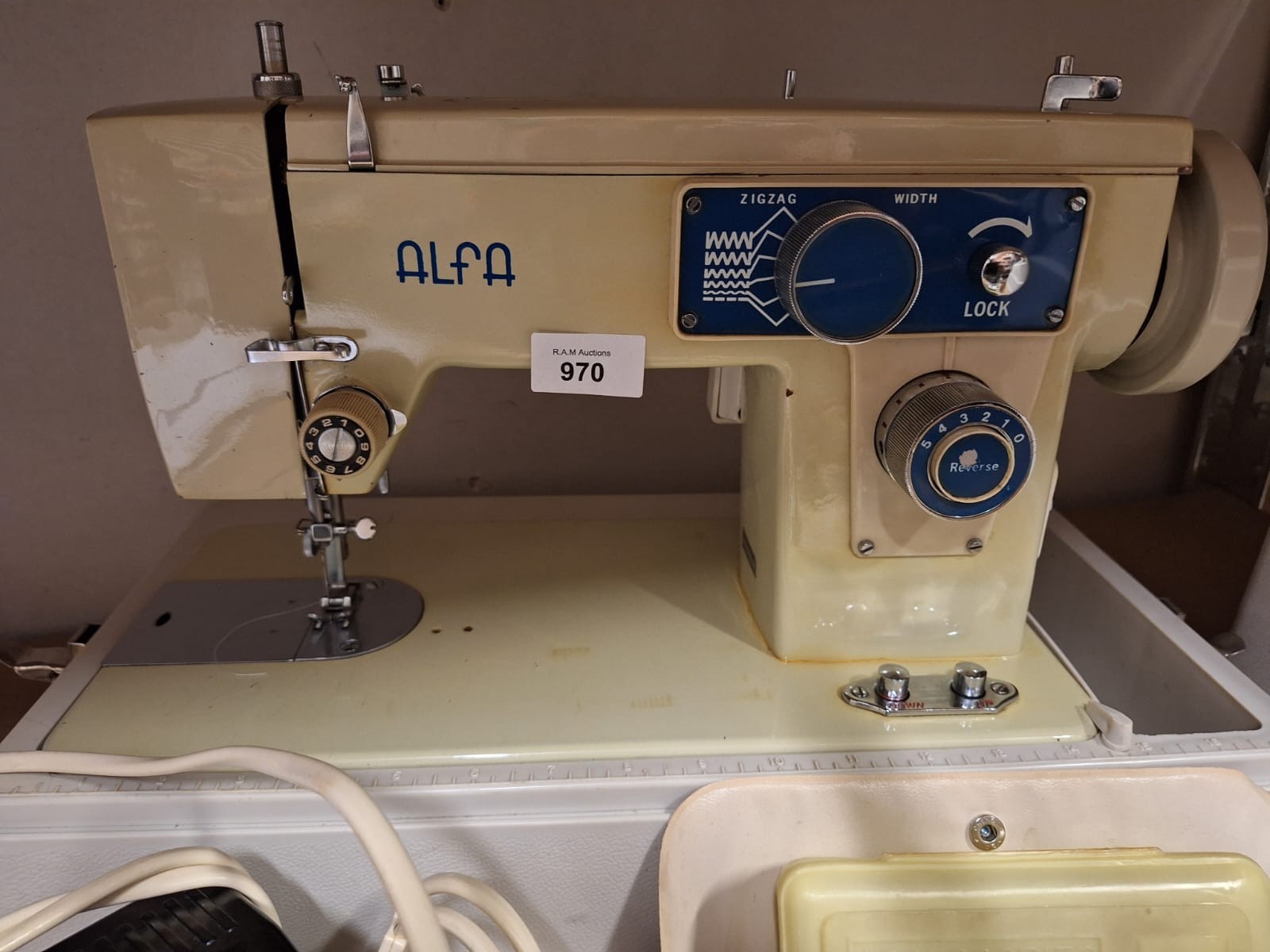 A vintage beige and blue Alfa sewing machine with a carrying handle, foot pedal, accessory case, presser feet case, and a hard plastic carrying case.