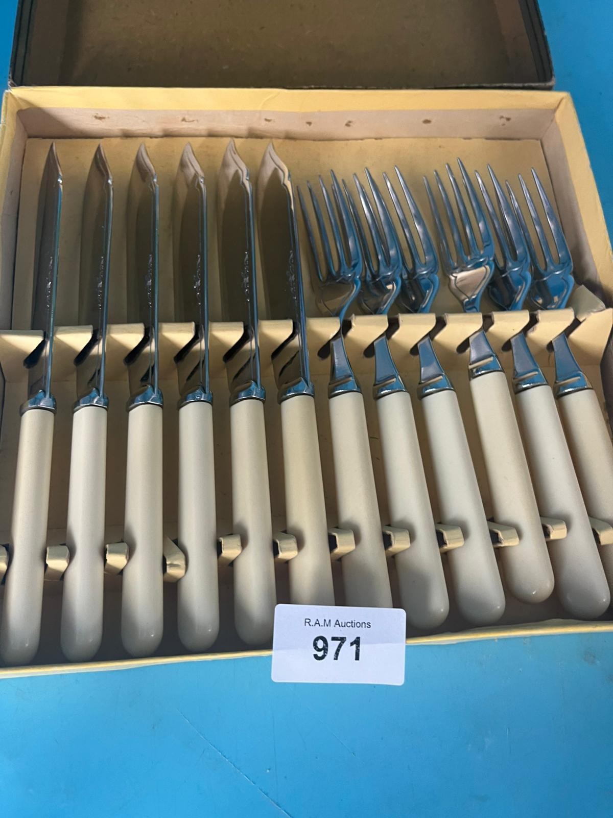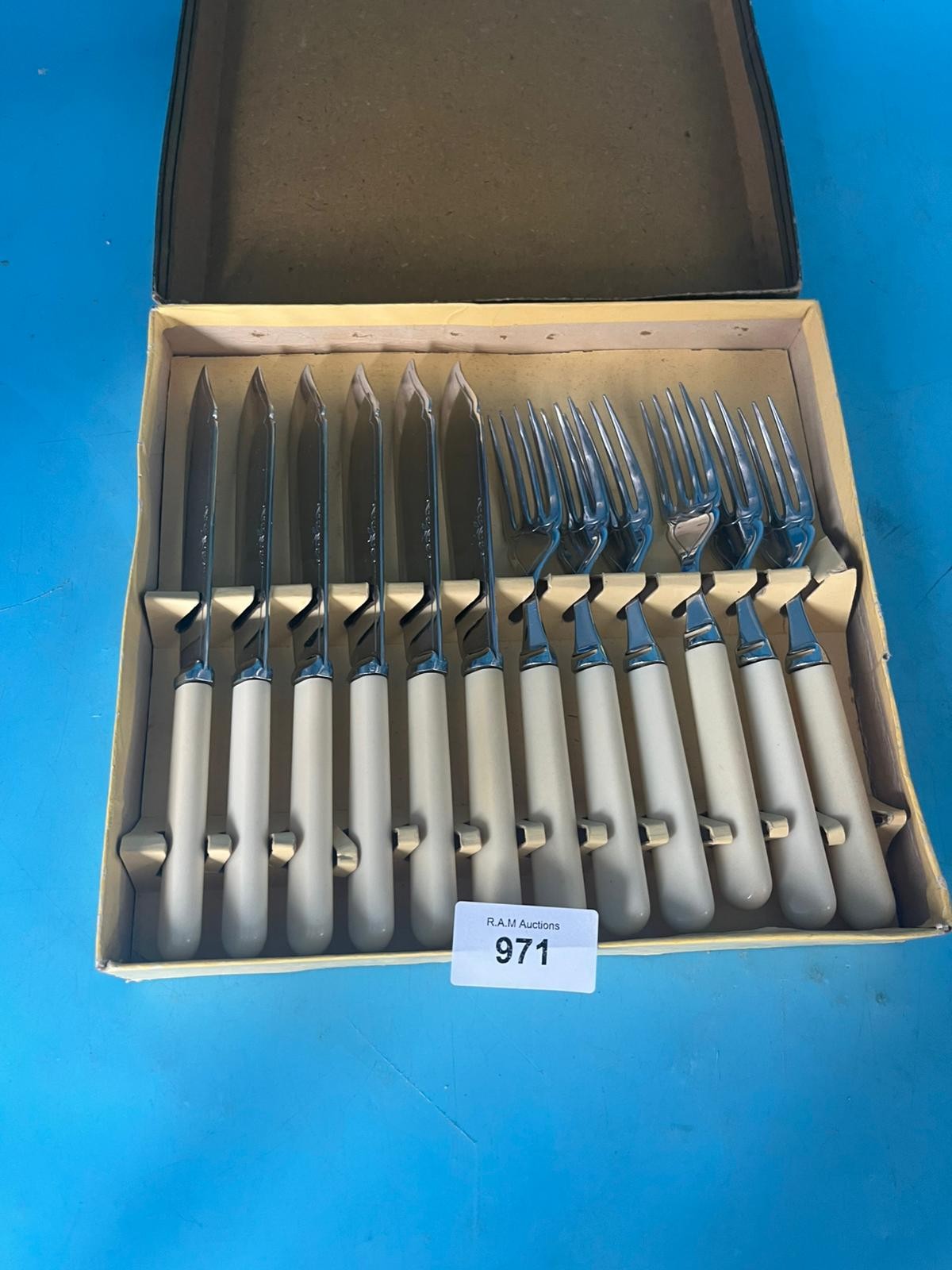 Stainless steel dinner knives and dinner forks with cream-colored handles.