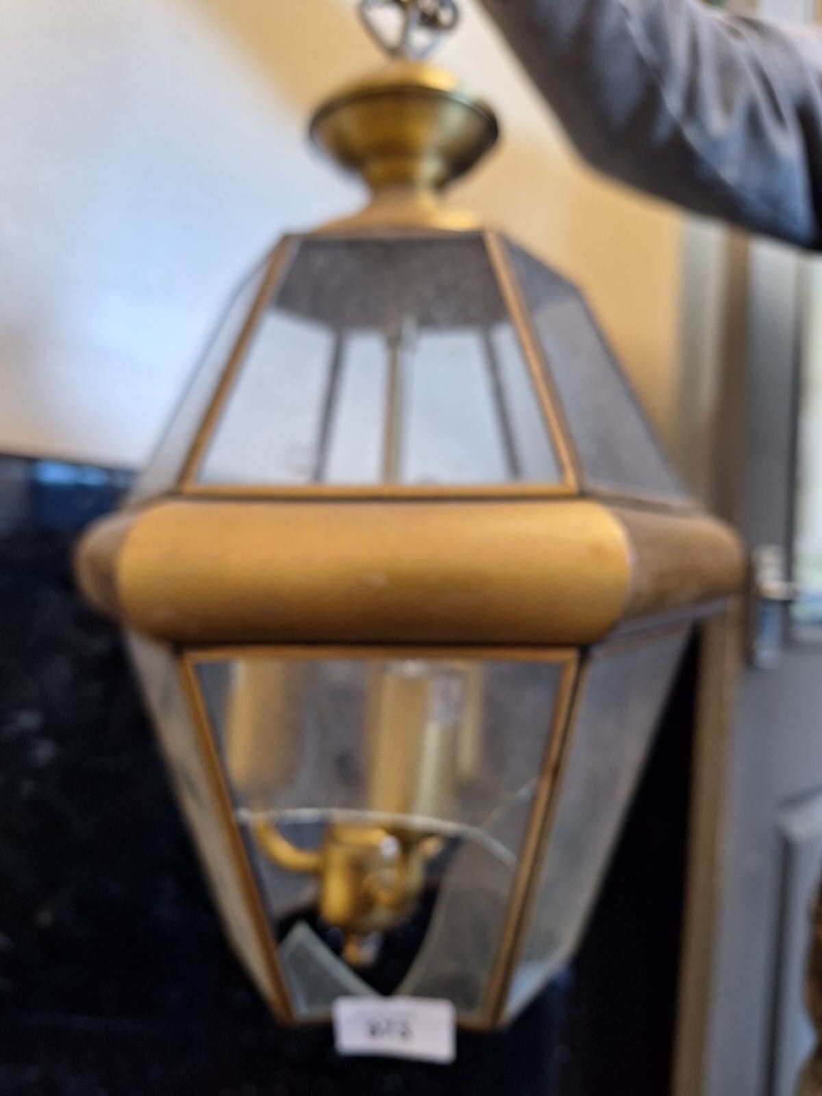 A brass-colored metal hanging light fixture with a multifaceted, octagonal glass enclosure and a domed top.