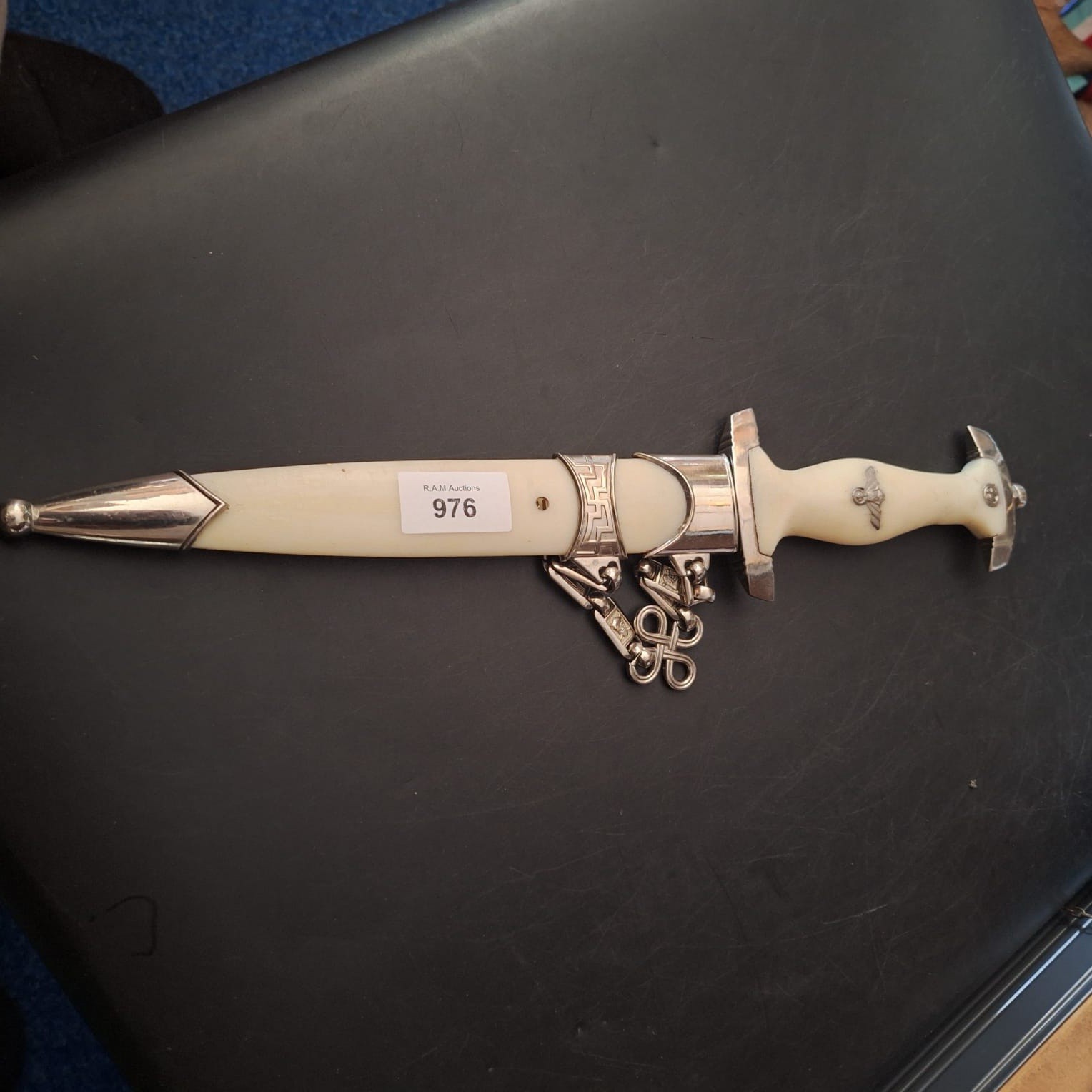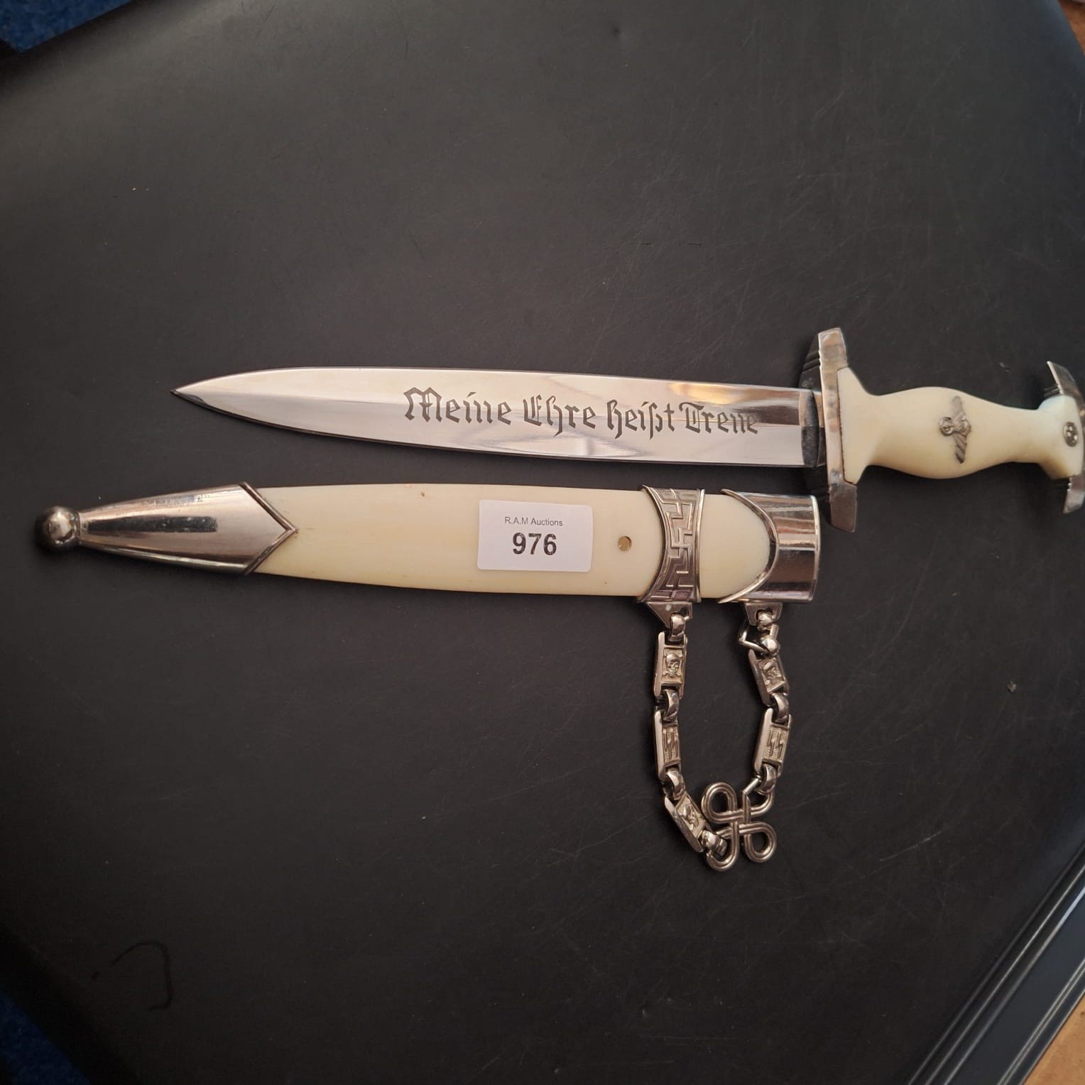 Double-edged silver-colored metal dagger with an inscription, featuring an eagle insignia on the handle, paired with a matching scabbard and decorative chain.