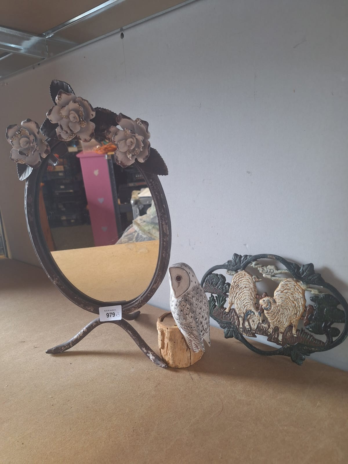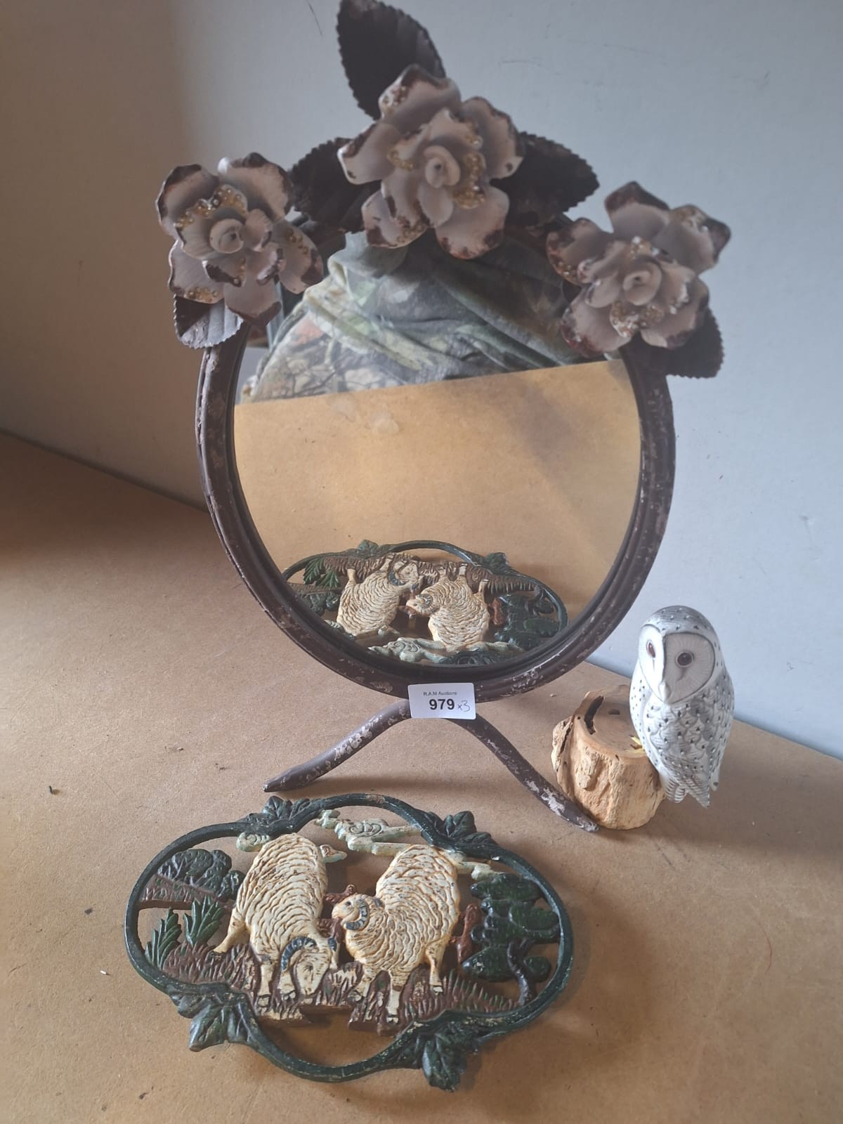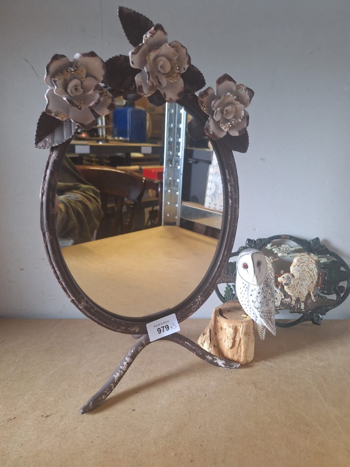 An oval hand mirror with a distressed dark brown metal frame featuring artificial rose embellishments and a matching stand.