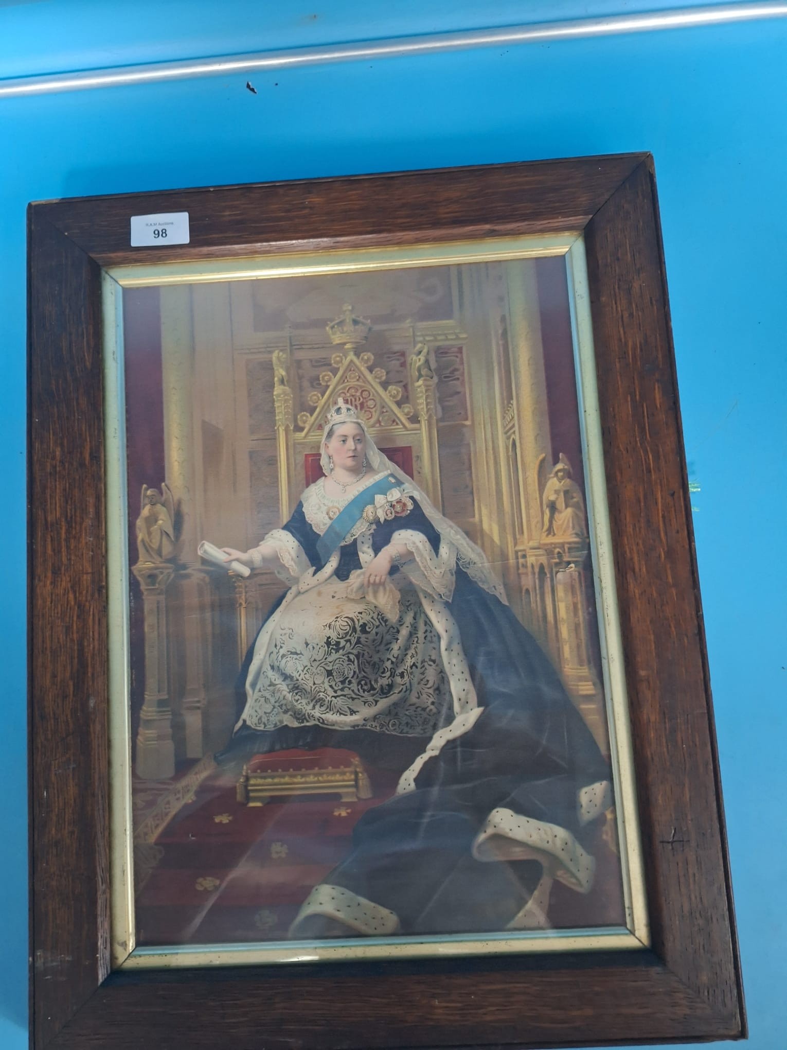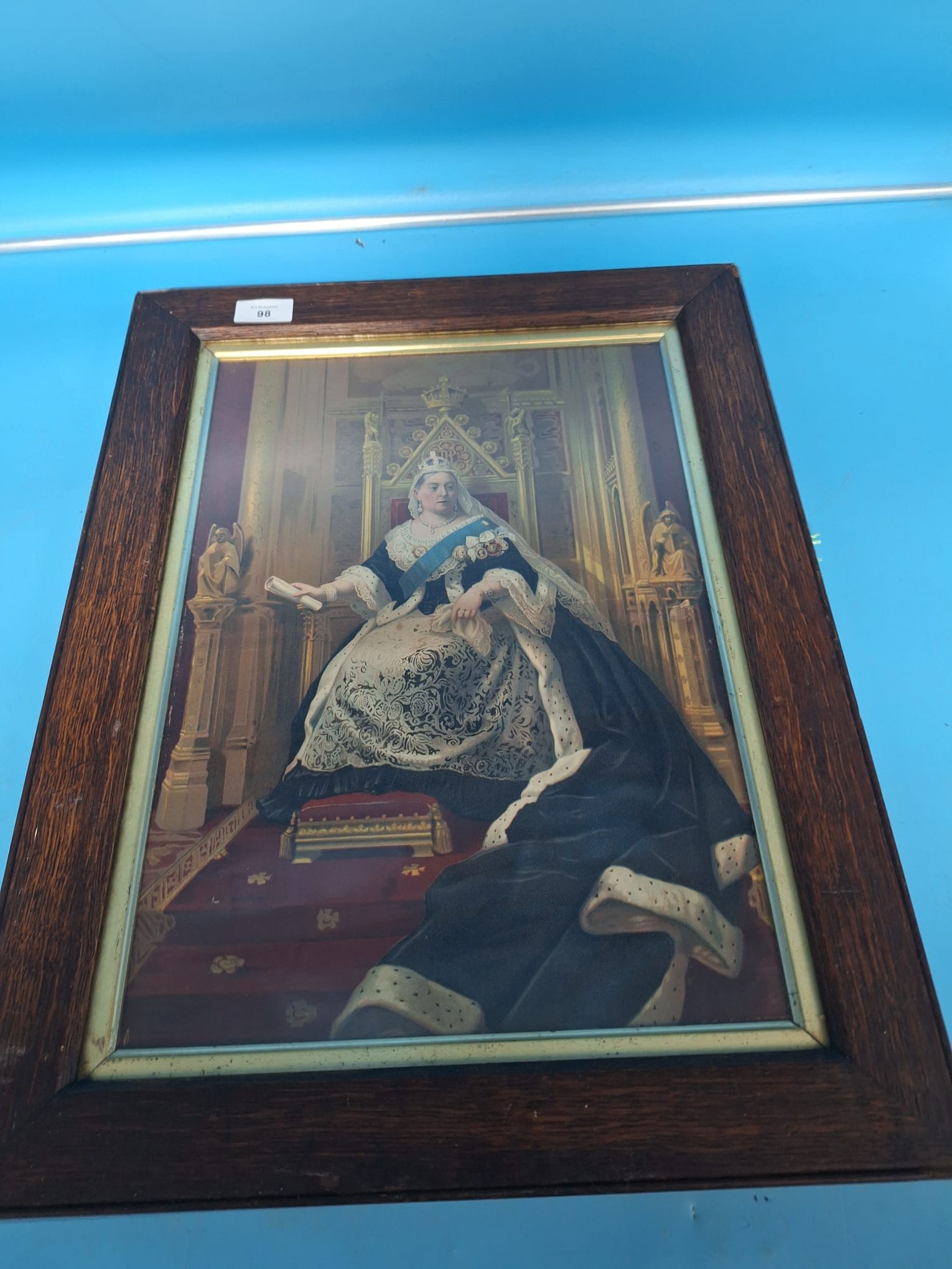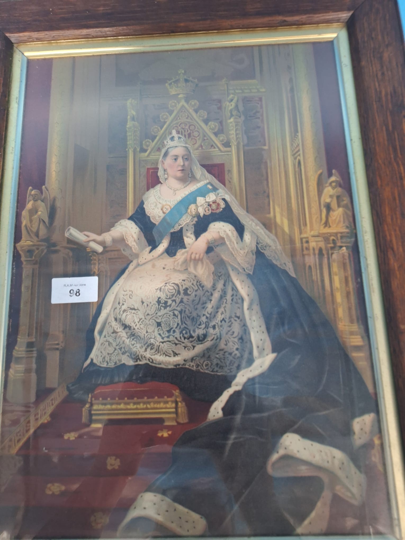 Framed pictorial print depicting Queen Victoria seated on a throne.